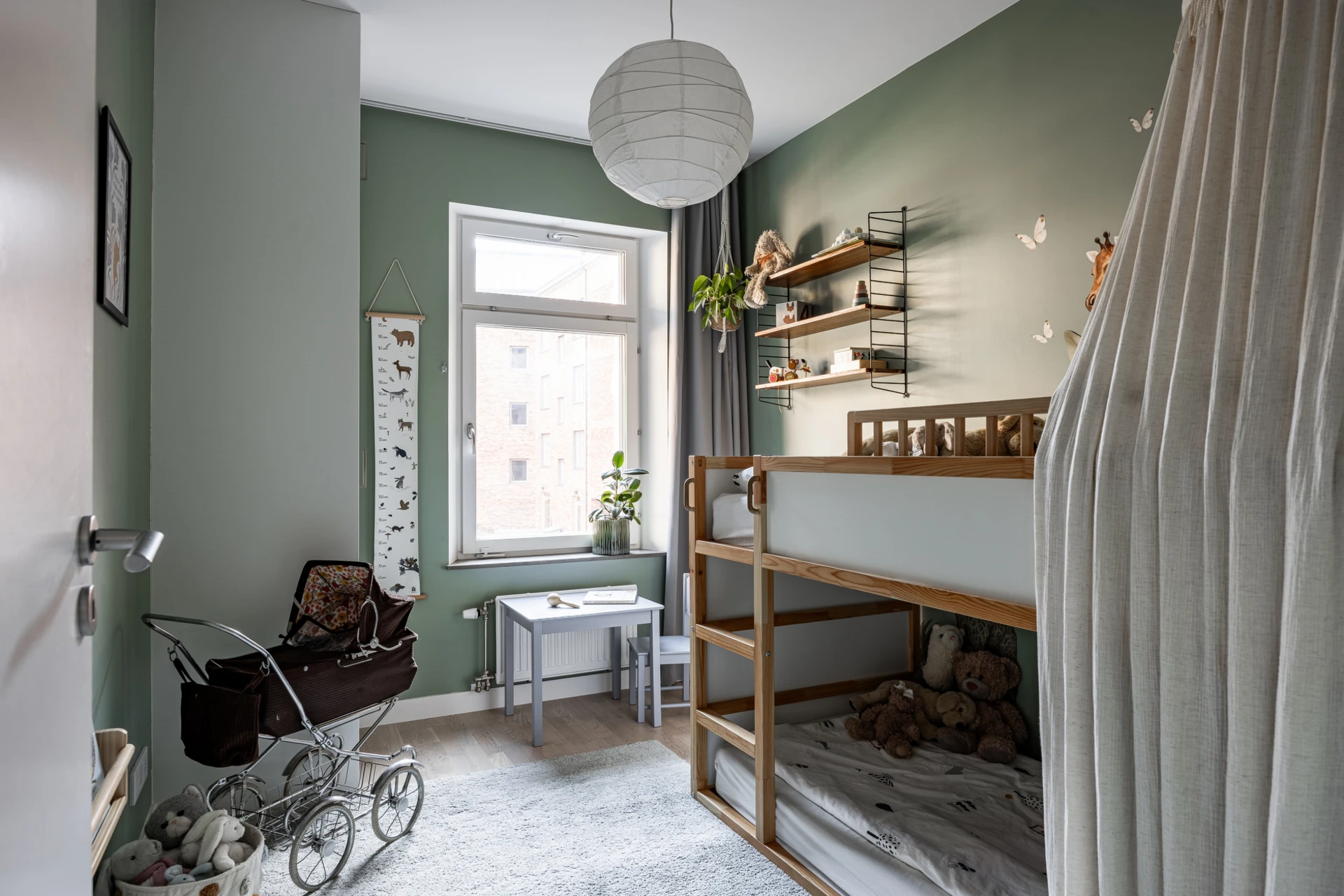 Parkettgolv och målade väggar i grön kulör. Här finns plats för enkelsäng med tillhörande möblemang samt skrivbord. Förvaring sker i en garderob.