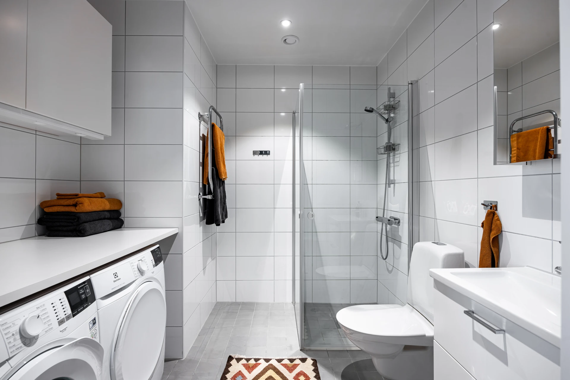 Klinkergolv i en grå nyans med golvvärme och vita helkaklade väggar. Badrummet är utrustat med vägghängd WC, handfat med kommod, spegelskåp, dusch med vikbara glasdörrar, tvättmaskin, torktumlare, arbetsbänk samt vägghängda förvaringsskåp. I taket sitter dimbara spotlights.