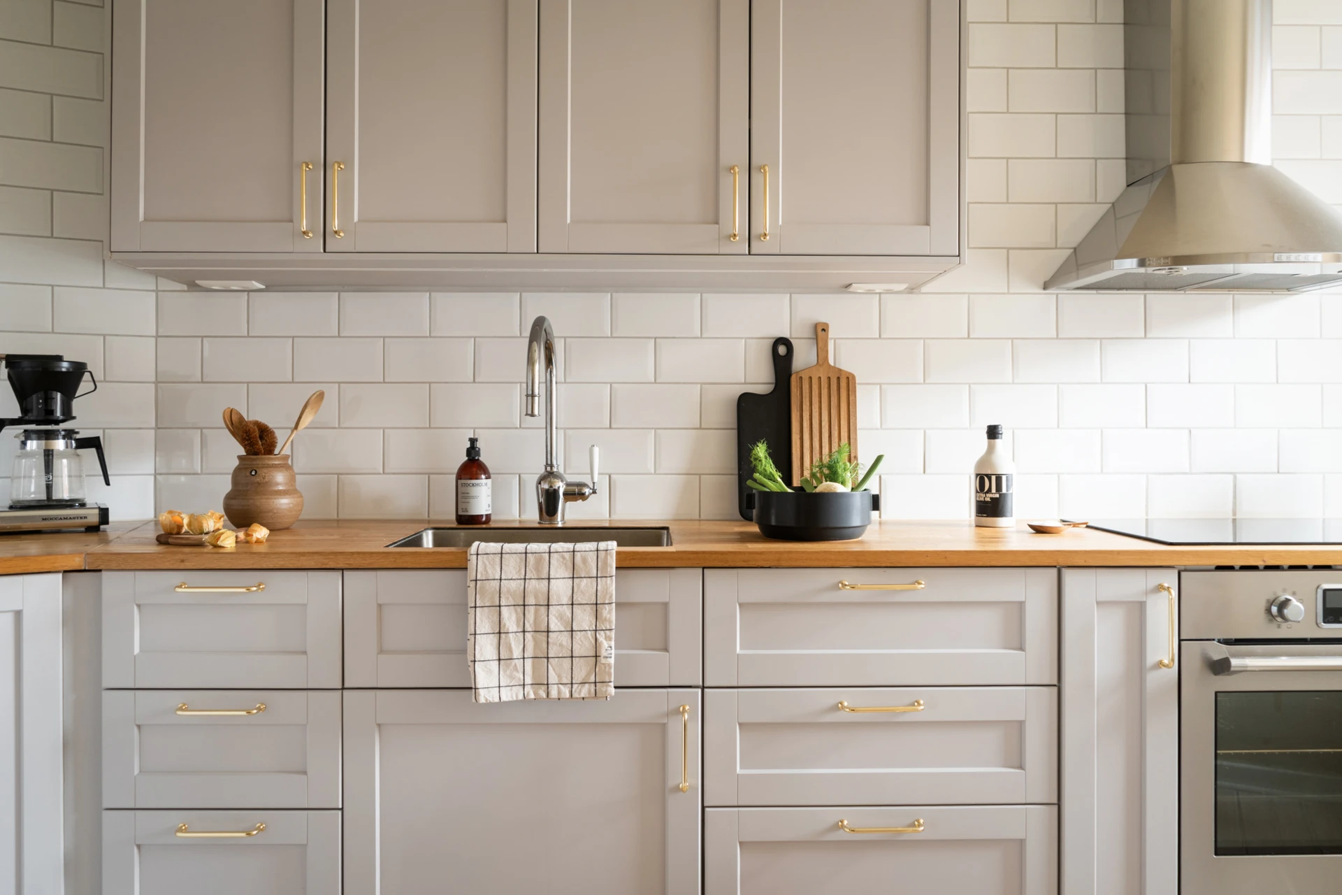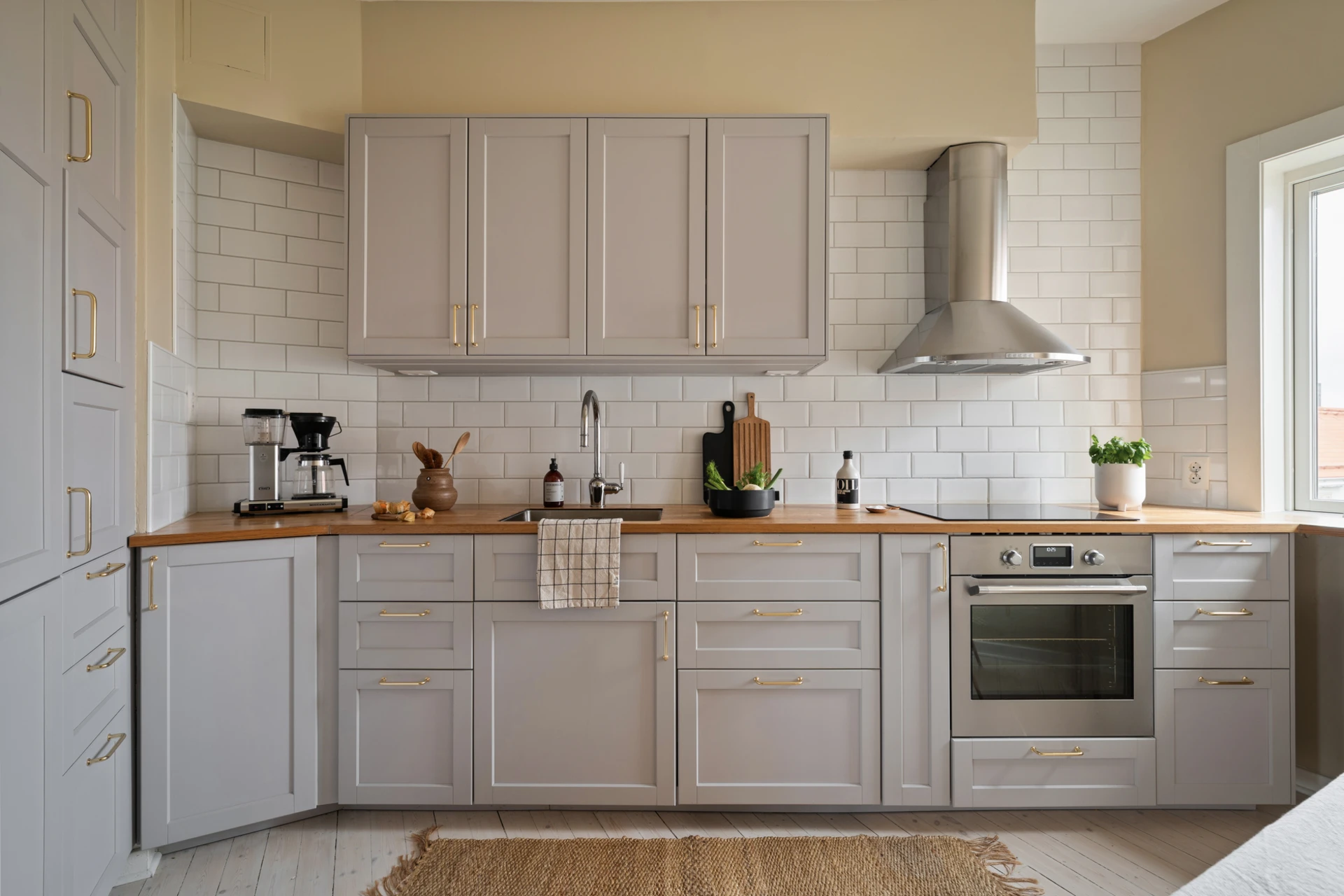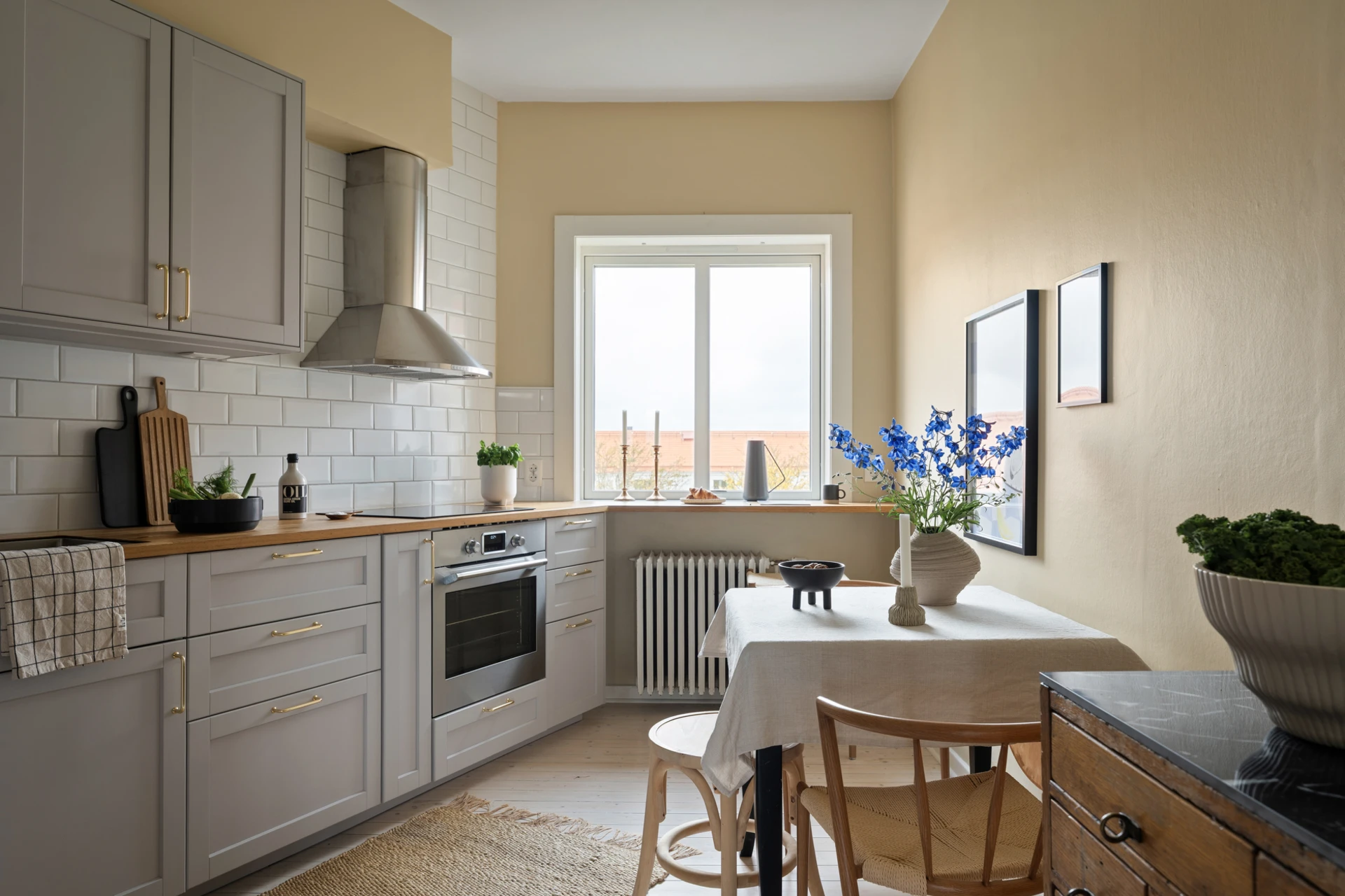 Vitbetsat trägolv och målade väggar i en ljusbrun kulör. Köksinredning i grått och ovanför arbetsbänken i trä sitter vitt kakel med bänkbelysning. Köket är utrustat med kombinerad kyl och frys, integrerad diskmaskin, induktionshäll, köksfläkt samt inbyggnadsugn. Här finns plats för matbord för cirka 2–3 personer. Köket totalrenoverades 2024 och samtliga vitvaror installerades i samband med detta.