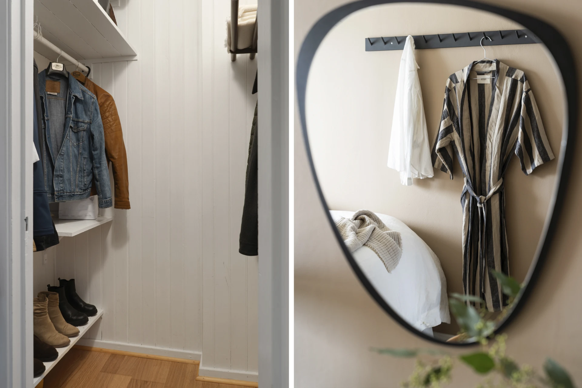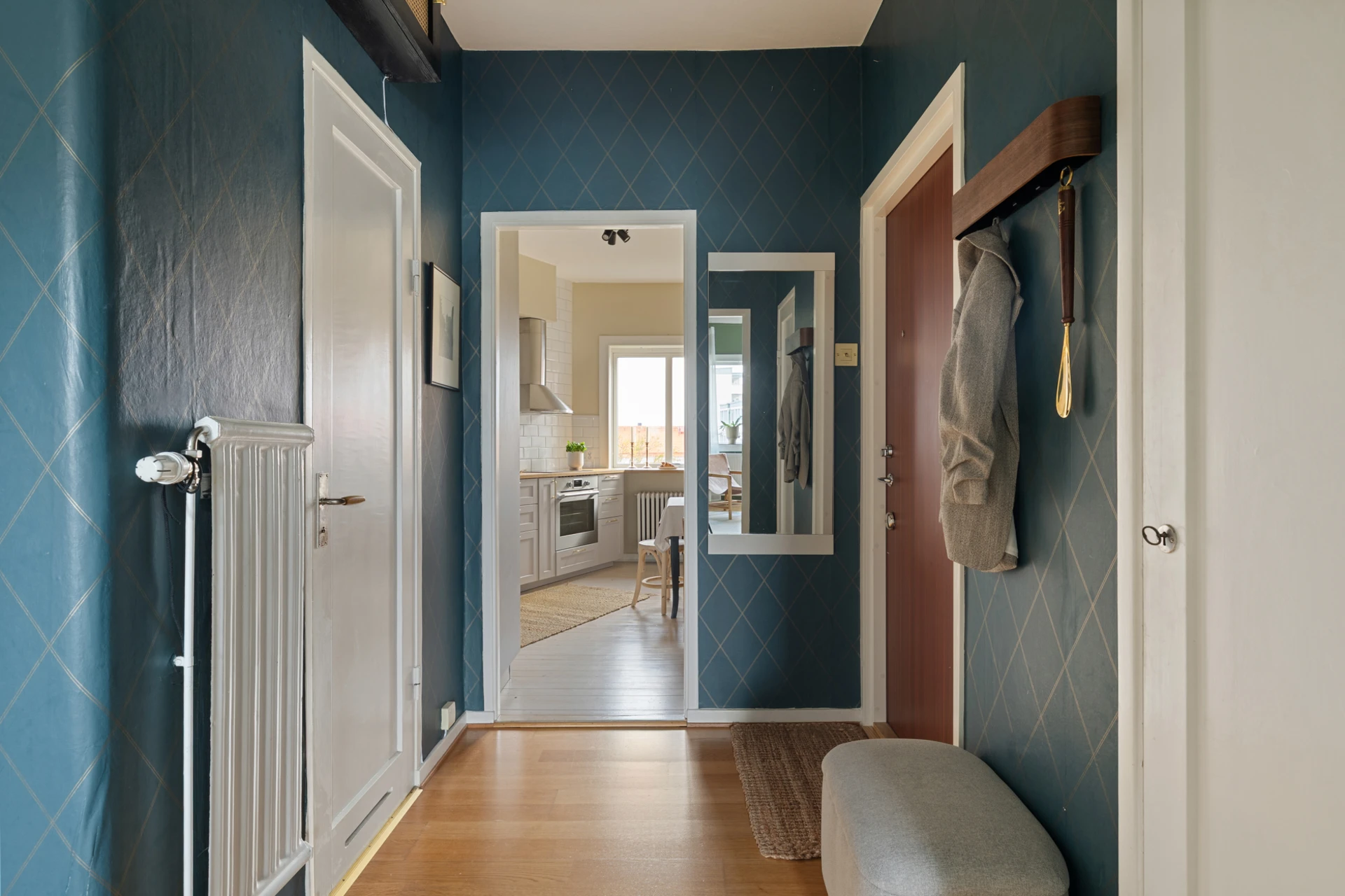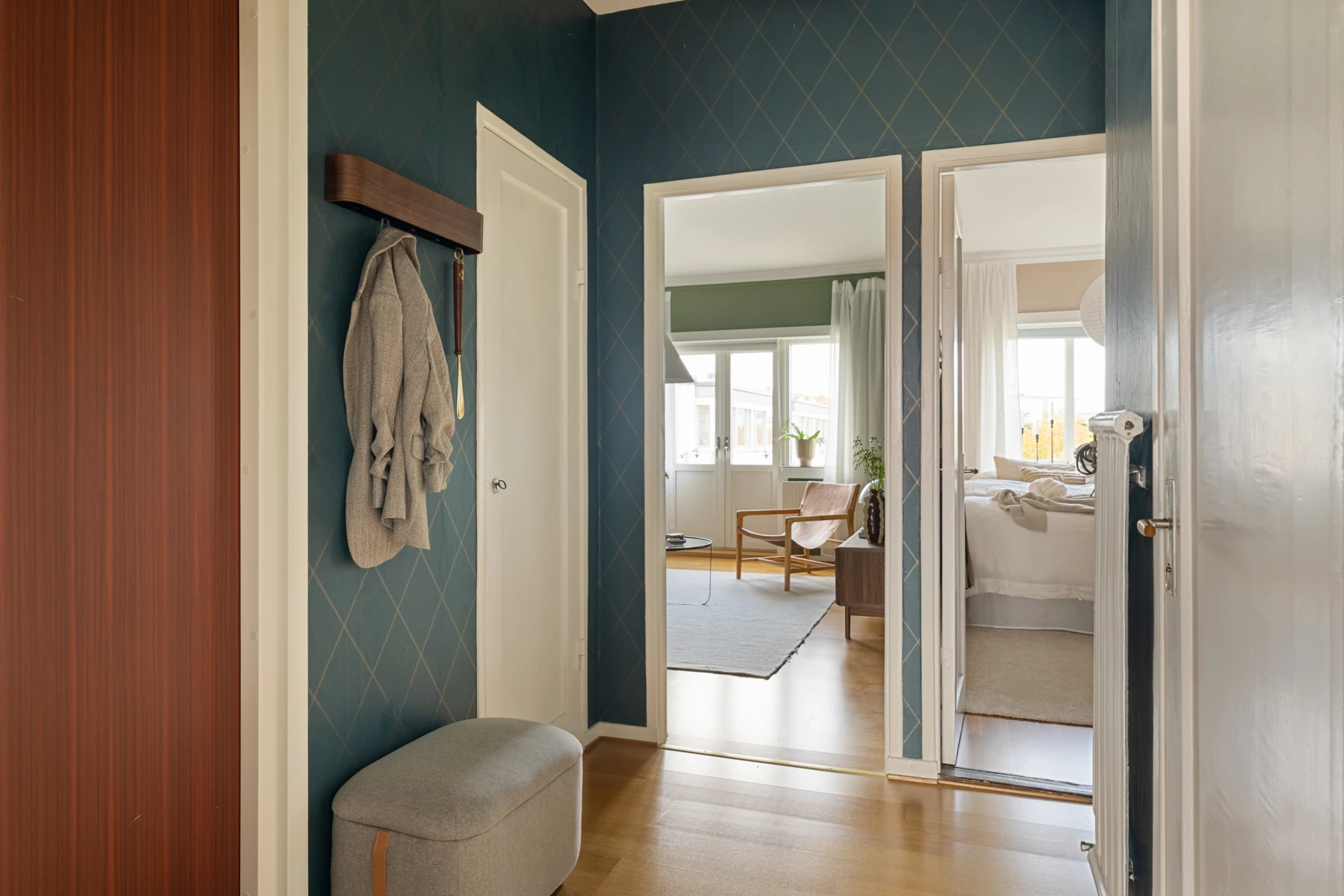 Parkettgolv och väggar i en mönstrad blå tapet. Här finns plats för avhängning och förvaring i en klädkammare.