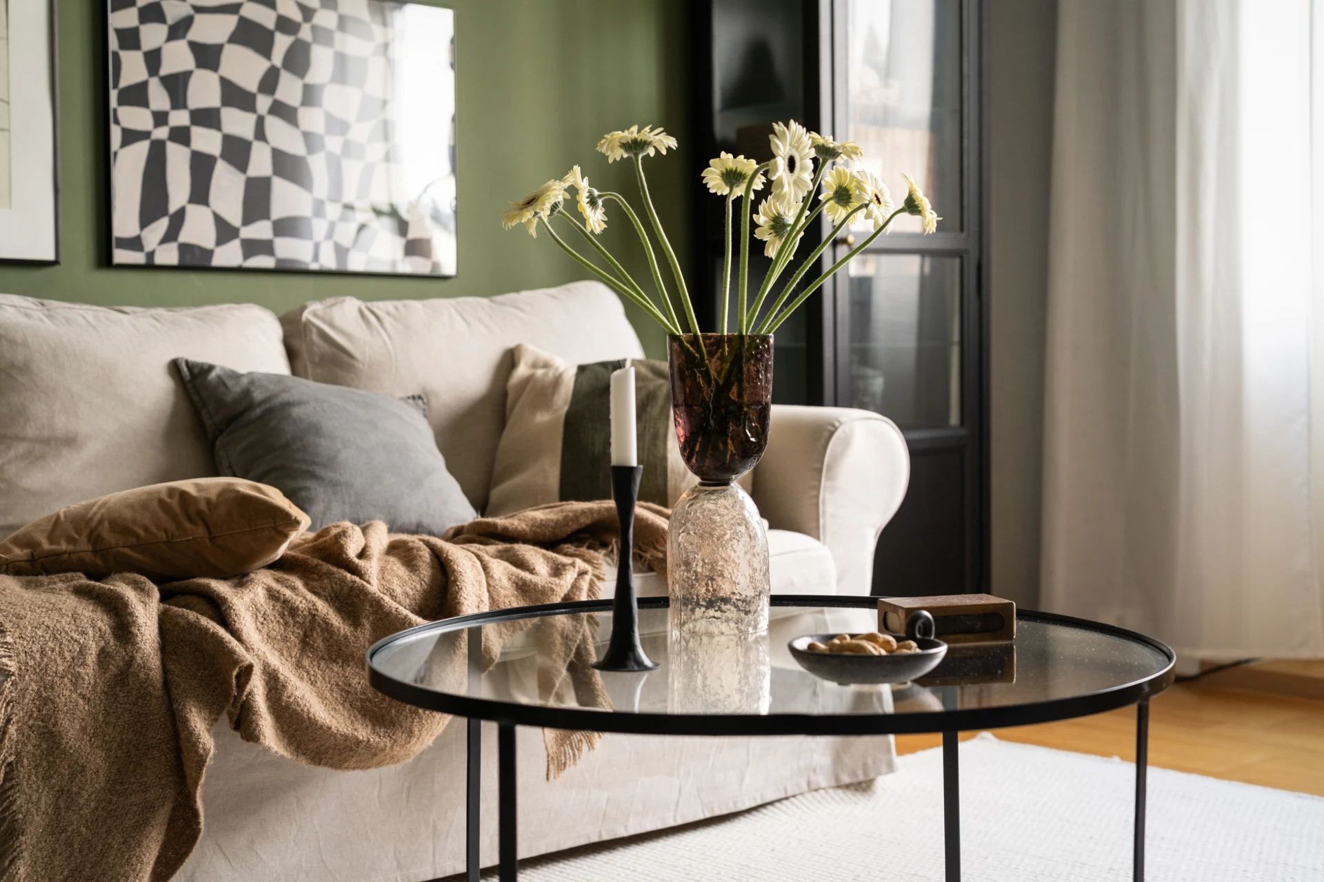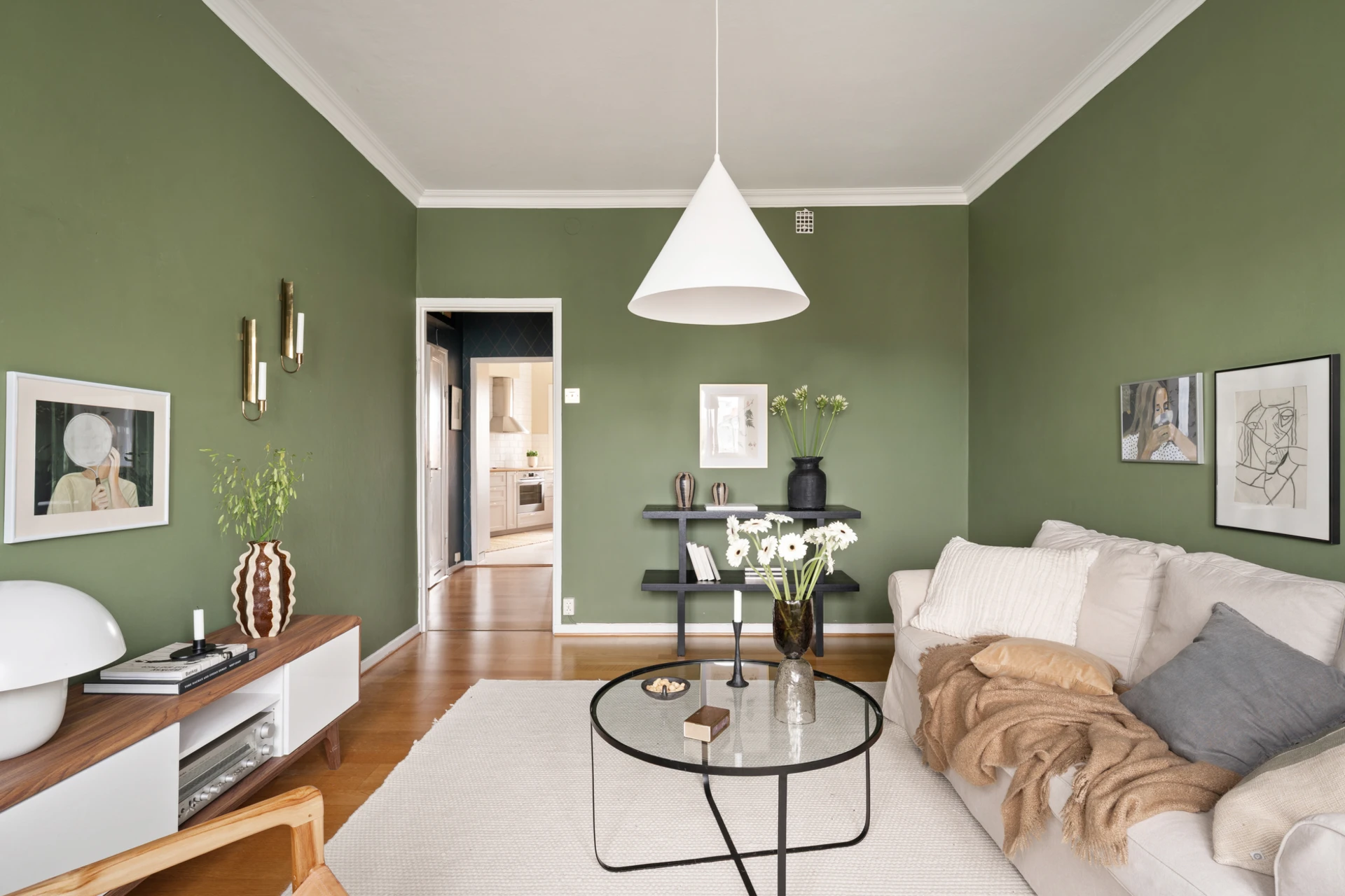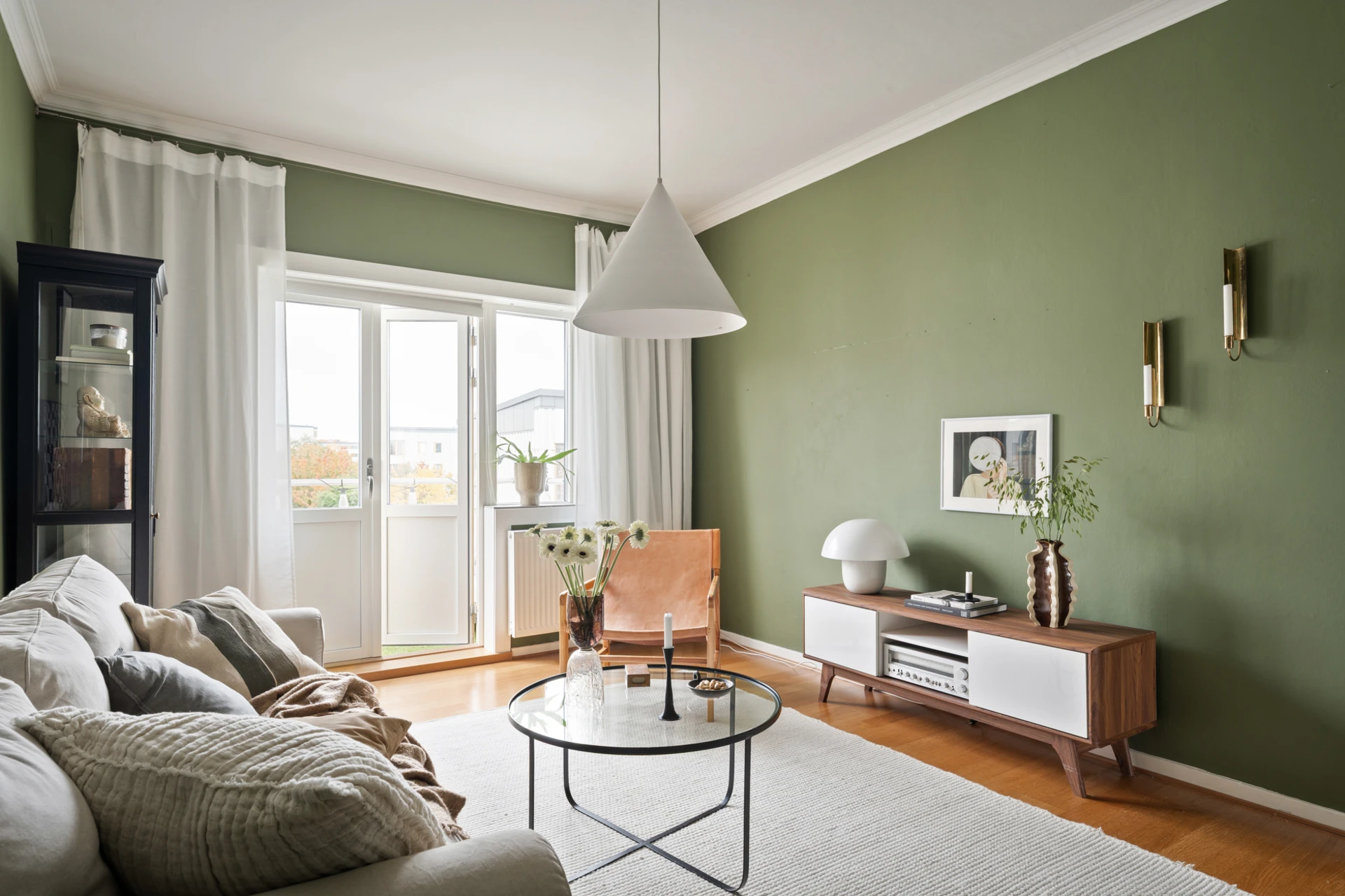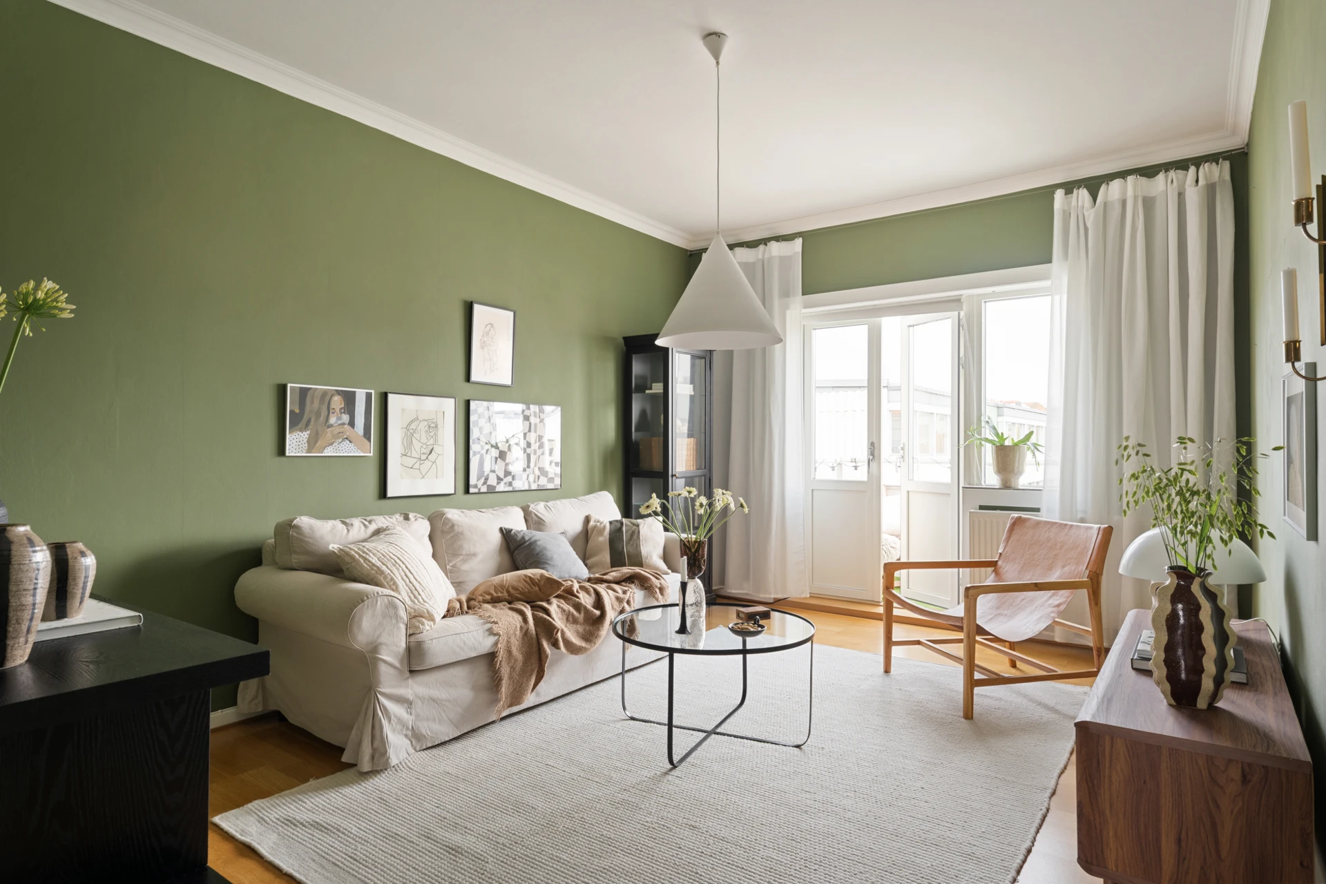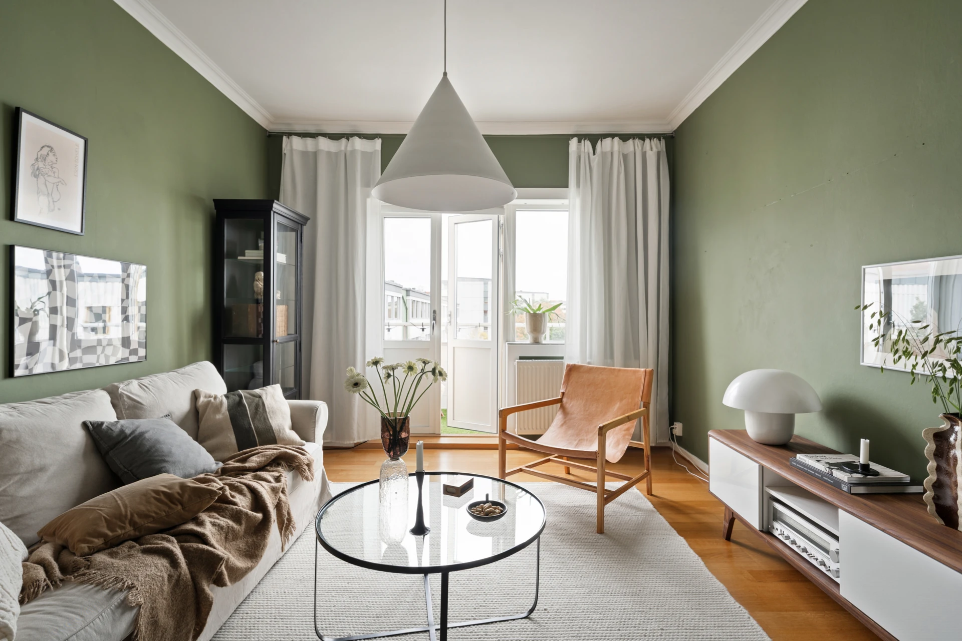 Parkettgolv och målade väggar i en grön nyans. Här finns plats för soffgrupp med tillhörande möblemang. Härifrån nås även bostadens balkong i härligt västerläge.