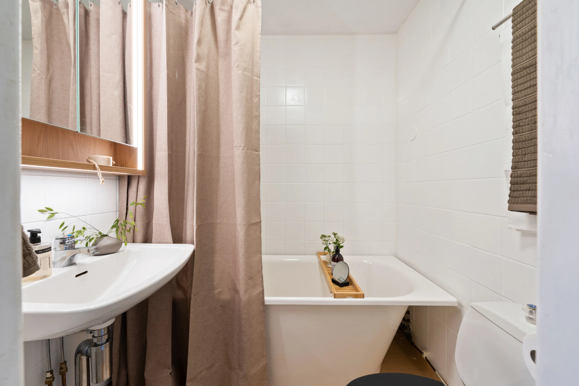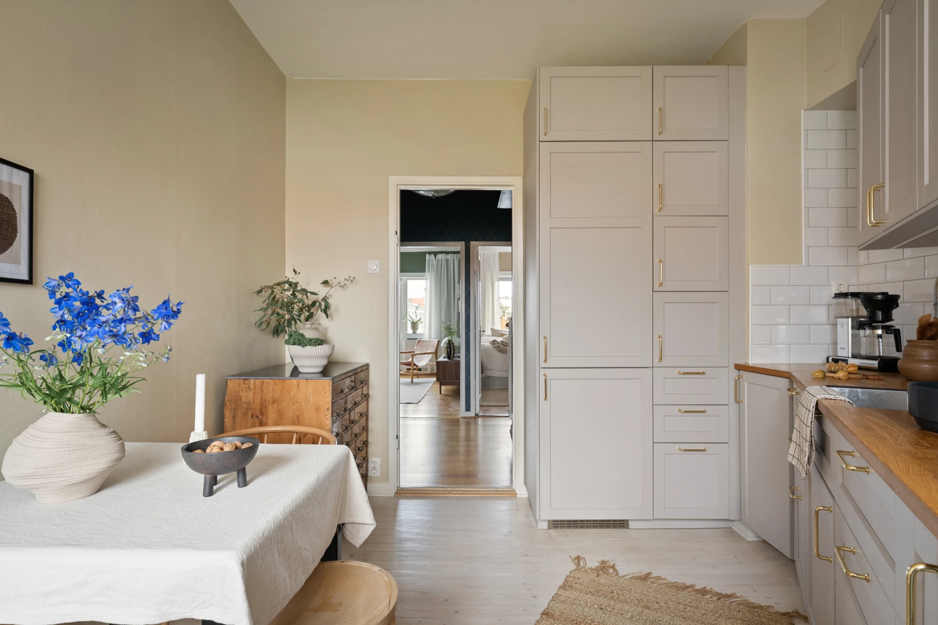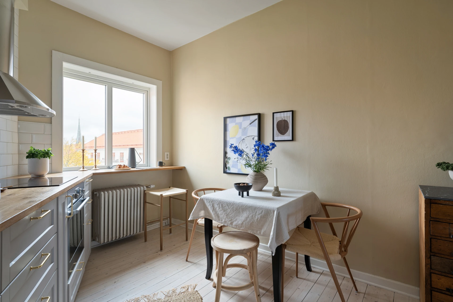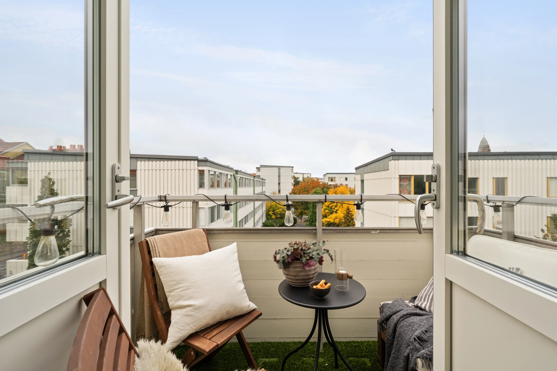 Köket har en smart planlösning där arbetsytan framför fönstret skapar en naturlig plats att både laga mat och sitta och arbeta med utsikt mot den lugna innergården. Köket är välutrustat och renoverat 2024 med nya vitvaror. Vardagsrummet är rymligt och lättmöblerat med utgång till en balkong i högt läge. Härifrån njuter du av sol från tidig morgon till sen kväll under sommarhalvåret.