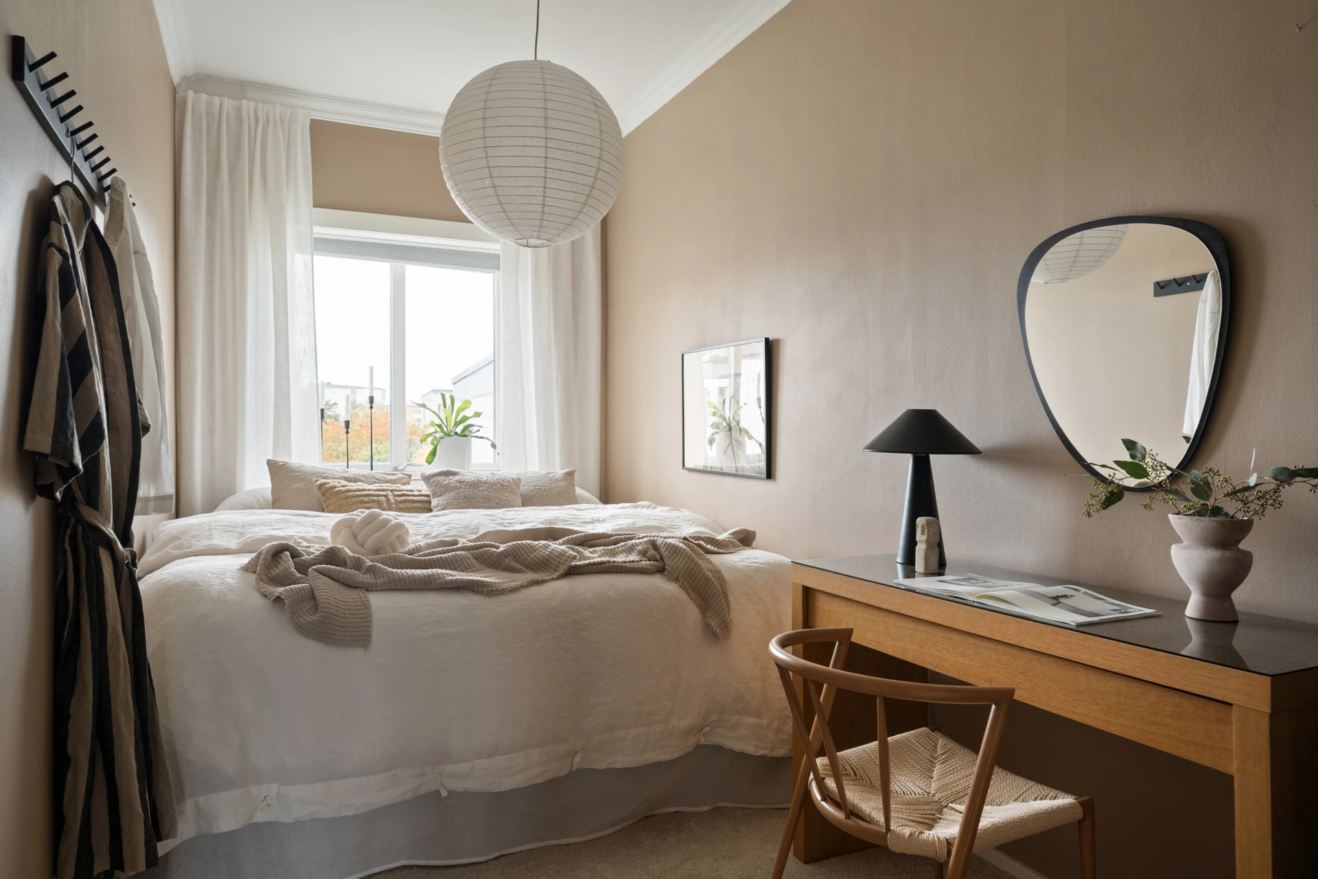 Parkettgolv och målade väggar i en brun nyans. Här finns plats för säng samt ett skrivbord.