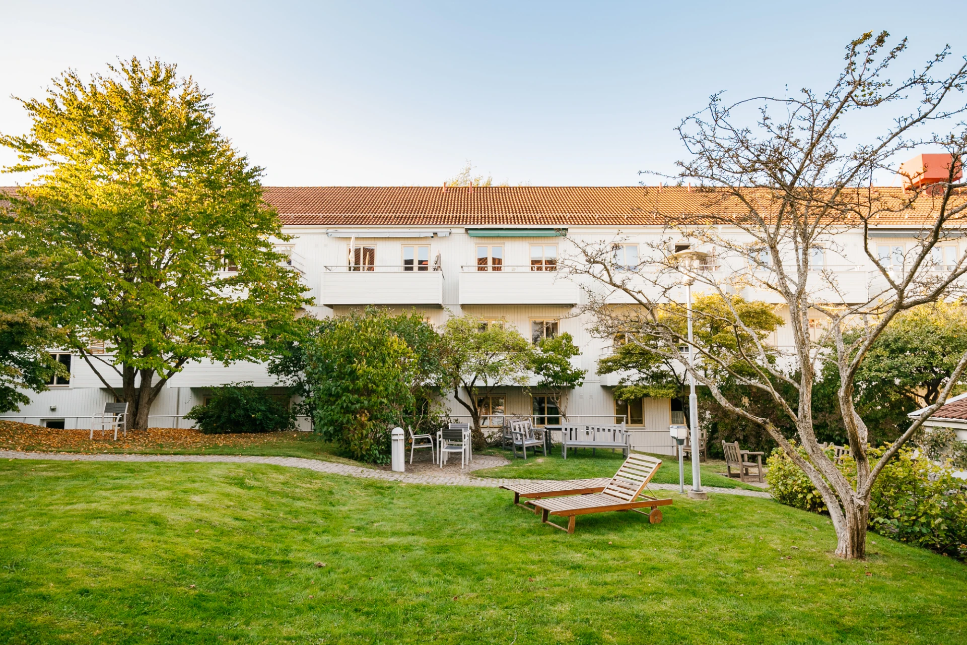 Lummig innergård med möjligheter till att grilla och sitta i solen och njuta en vacker sommardag.