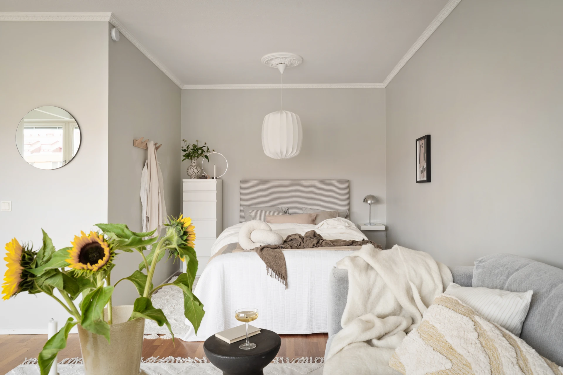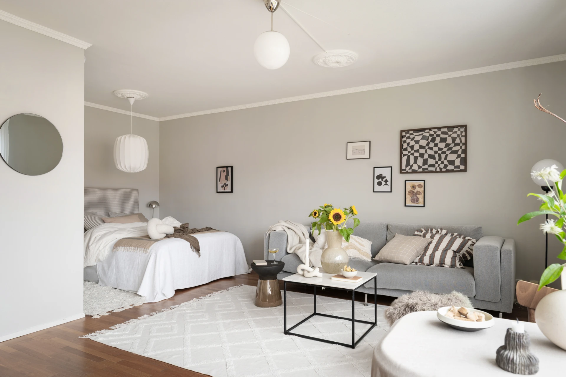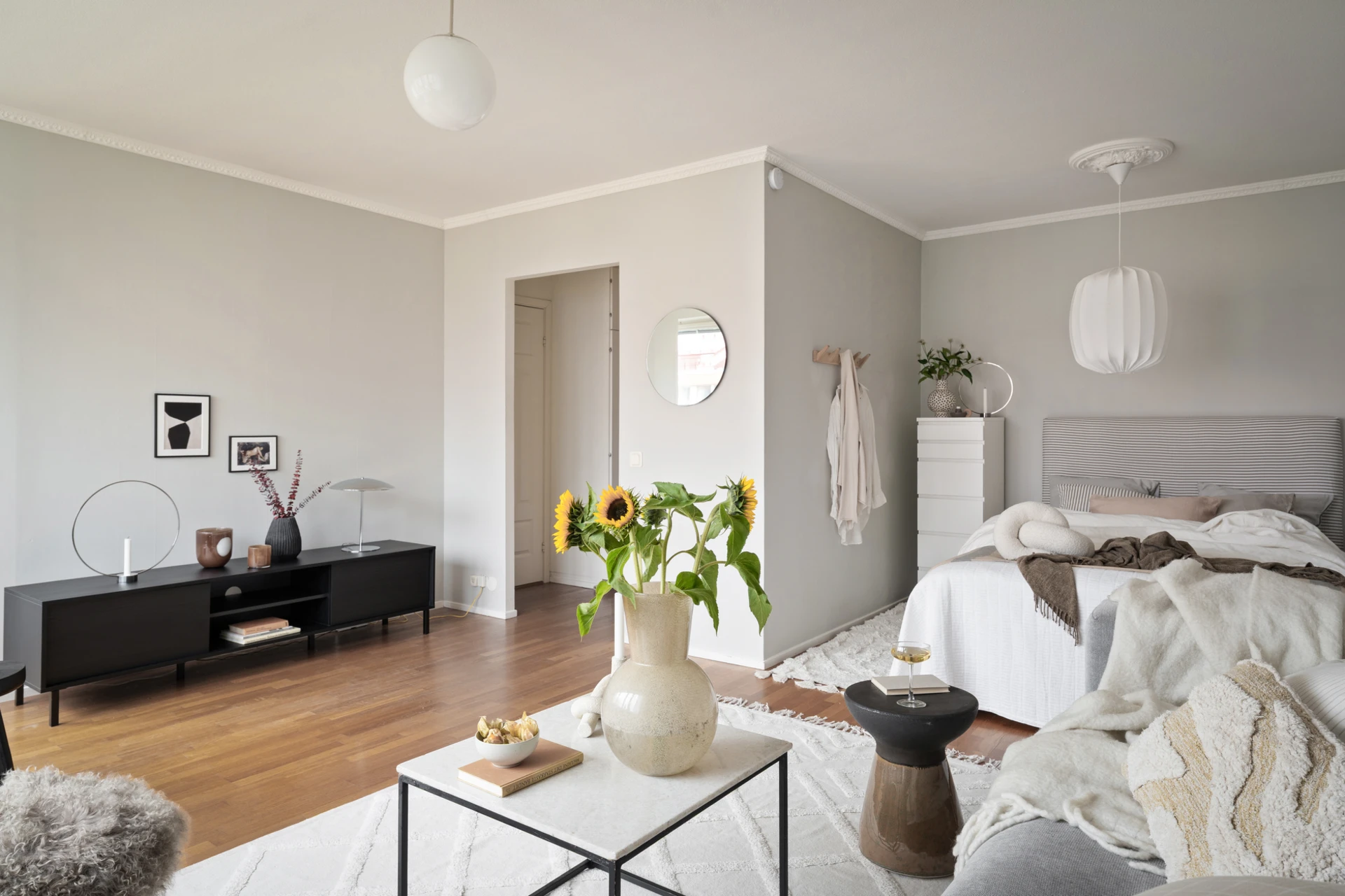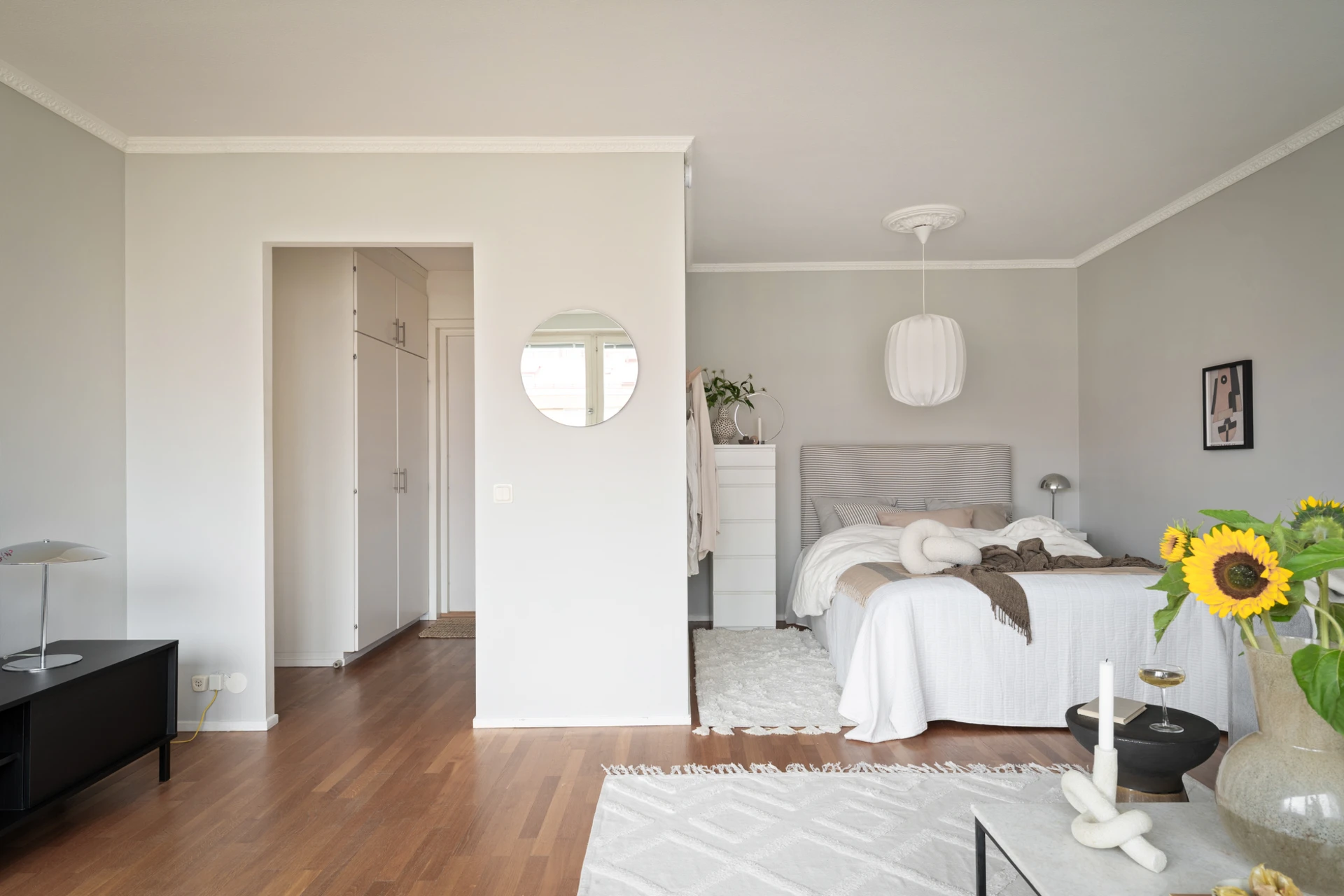 Parkettgolv och ljusgrå väggar. Här finns plats för soffgrupp med tillhörande möblemang, matplats för 2-4 personer samt säng med tillhörande möblemang i en sovalkov.