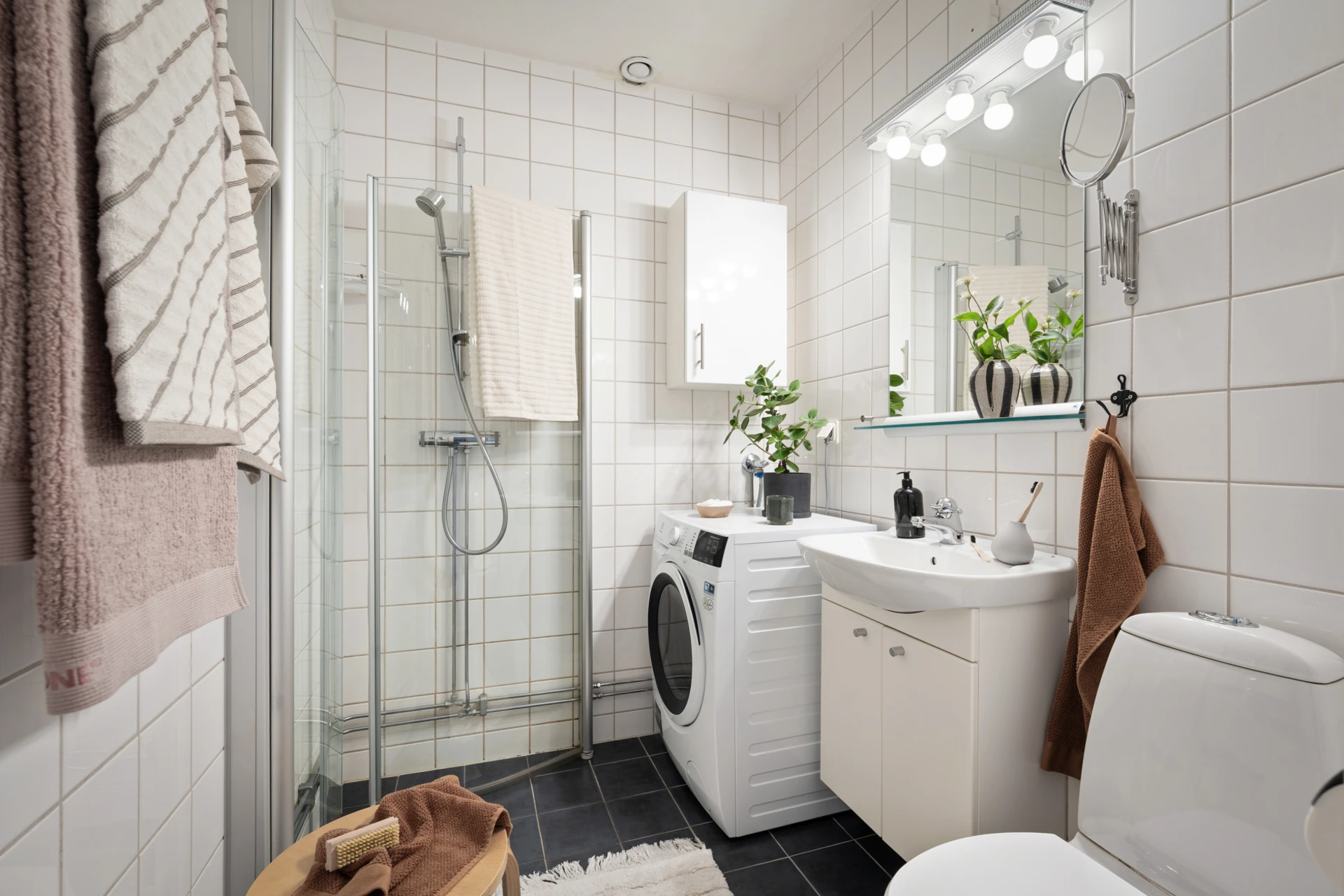 Klinkergolv i en grå nyans och vita helkaklade väggar. Badrummet är utrustat med WC, handfat med kommod, spegel, dusch med vikbara glasdörrar, handdukstork samt kombinerad tvättmaskin och torktumlare.
