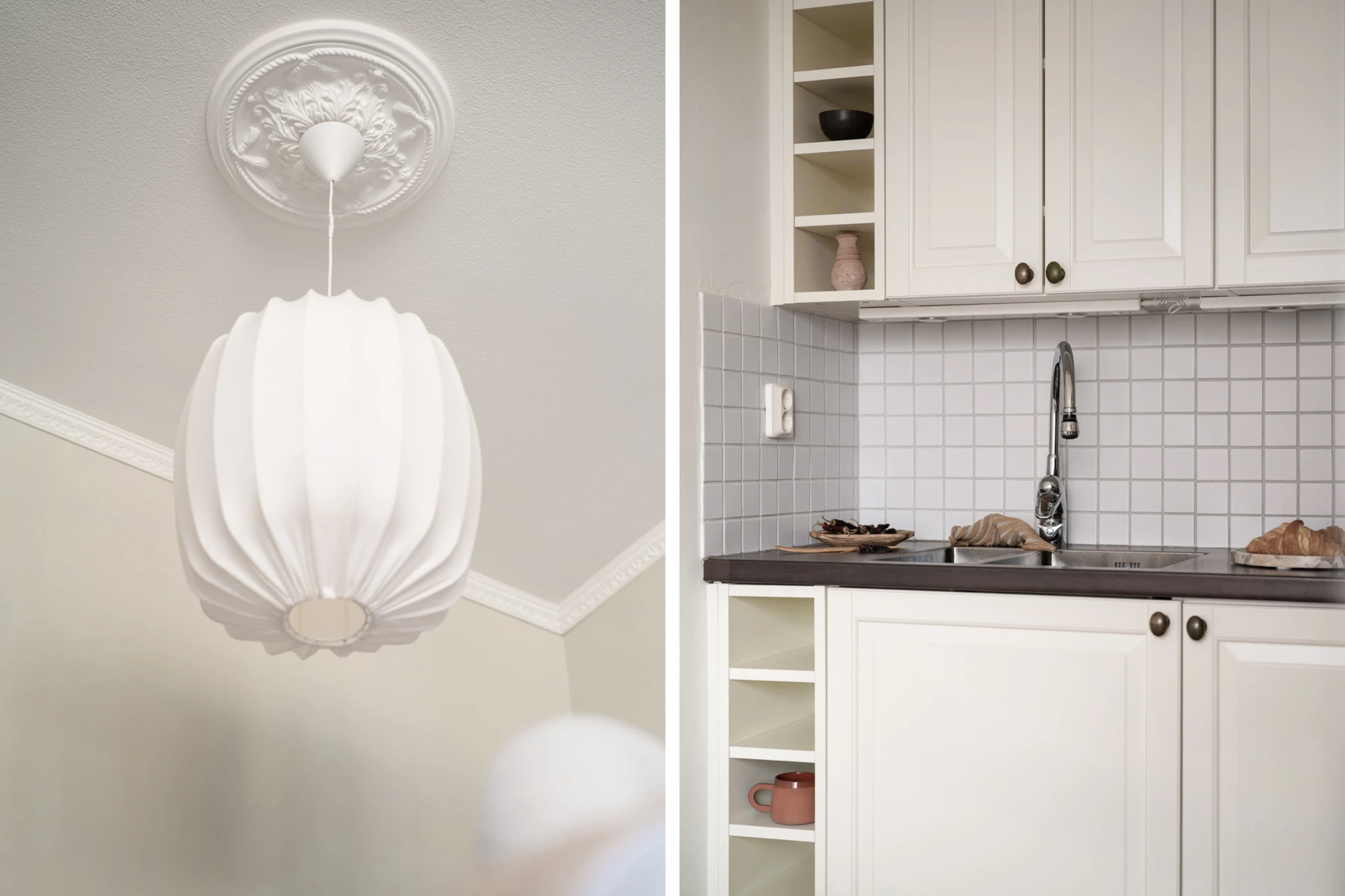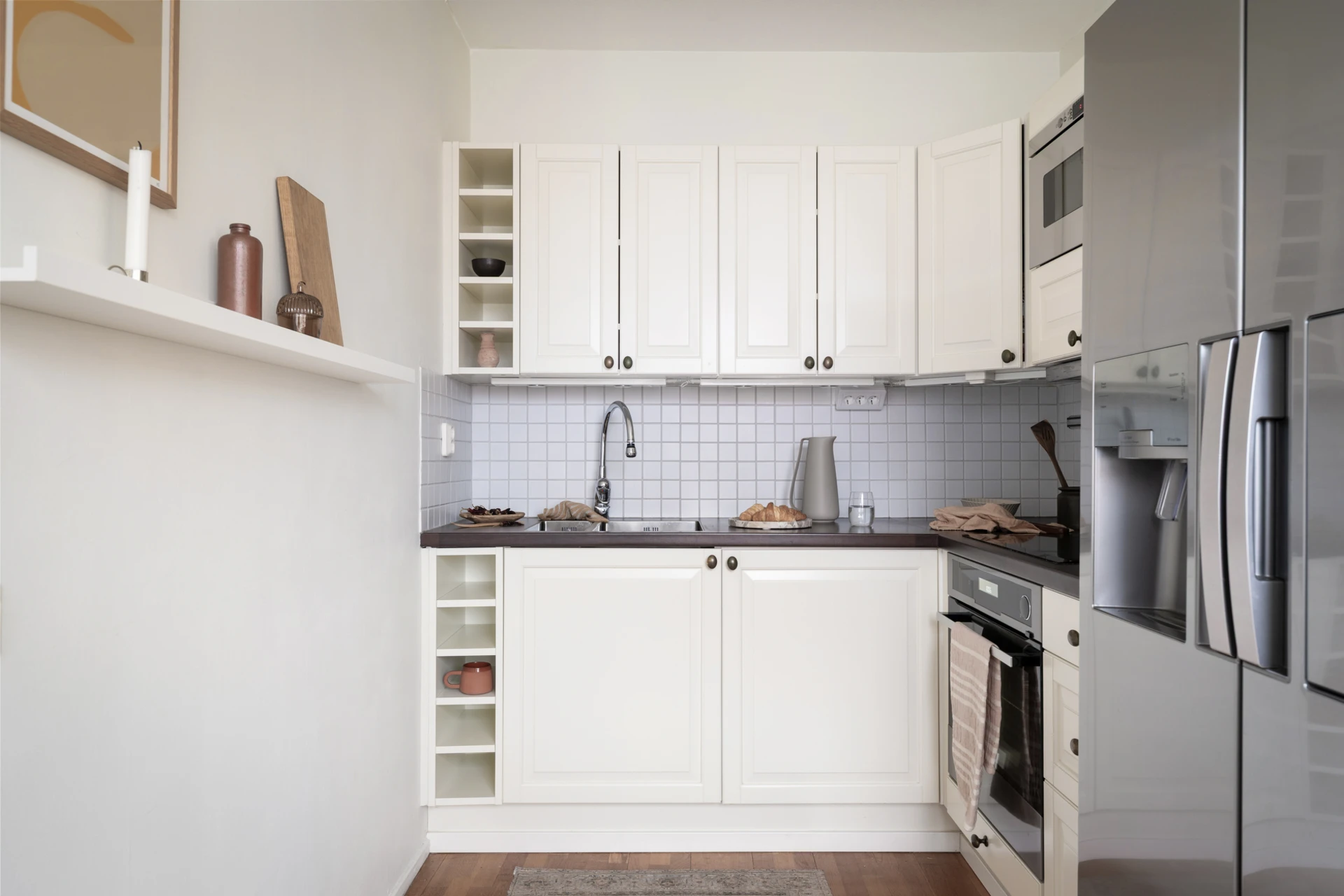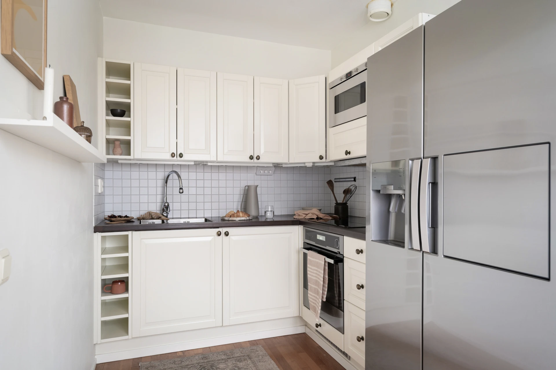 Parkettgolv och vita väggar. Köksinredning i vitt och ovanför den mörka arbetsbänken sitter vitt kakel samt bänkbelysning. Vitvarorna består av kyl och frys, induktionshäll, köksfläkt samt inbyggnadsugn och mikro.