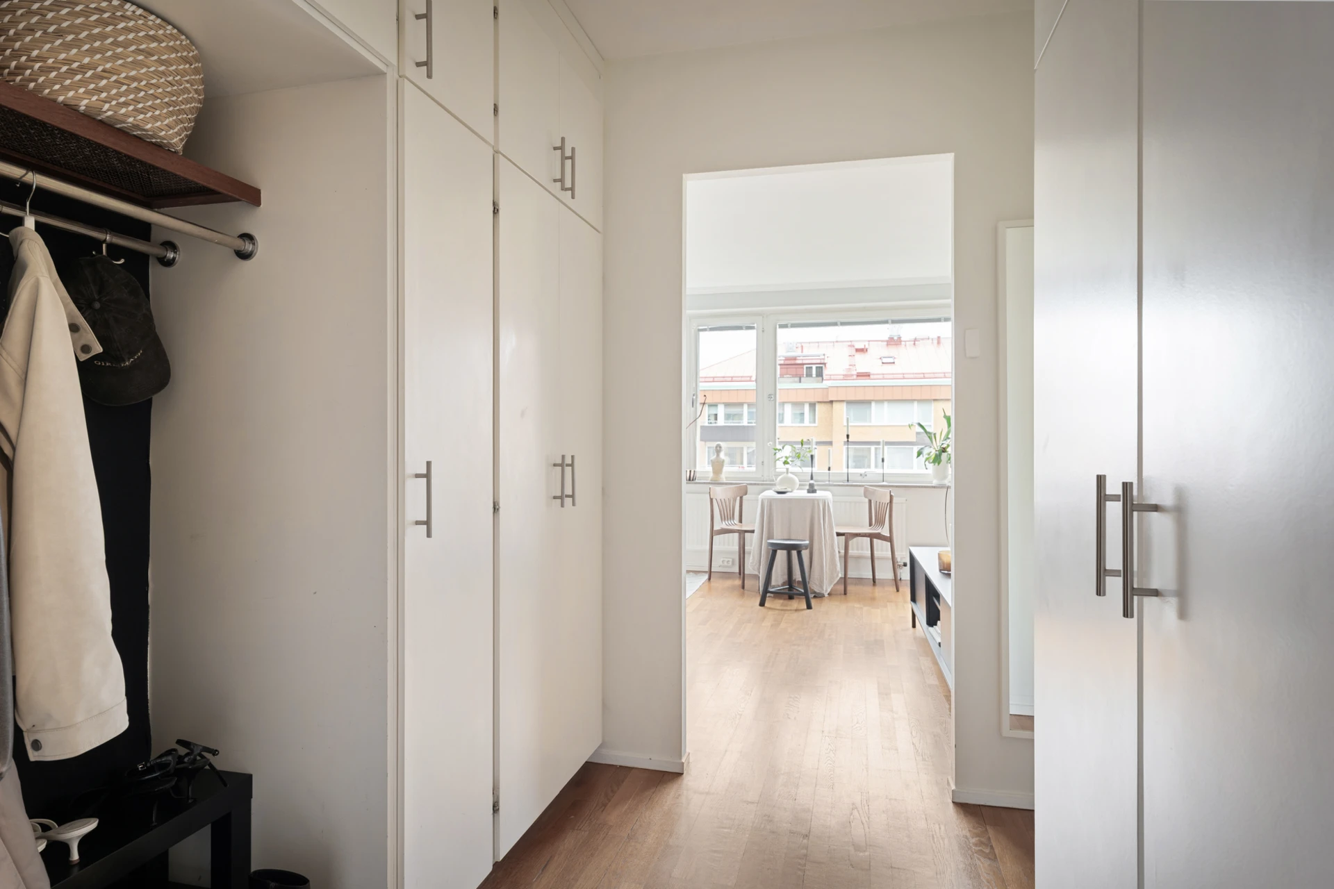 Parkettgolv och vita väggar. Här finns plats för avhängning och förvaring i garderober samt i skåp. Bostaden är utrustad med säkerhetsdörr.