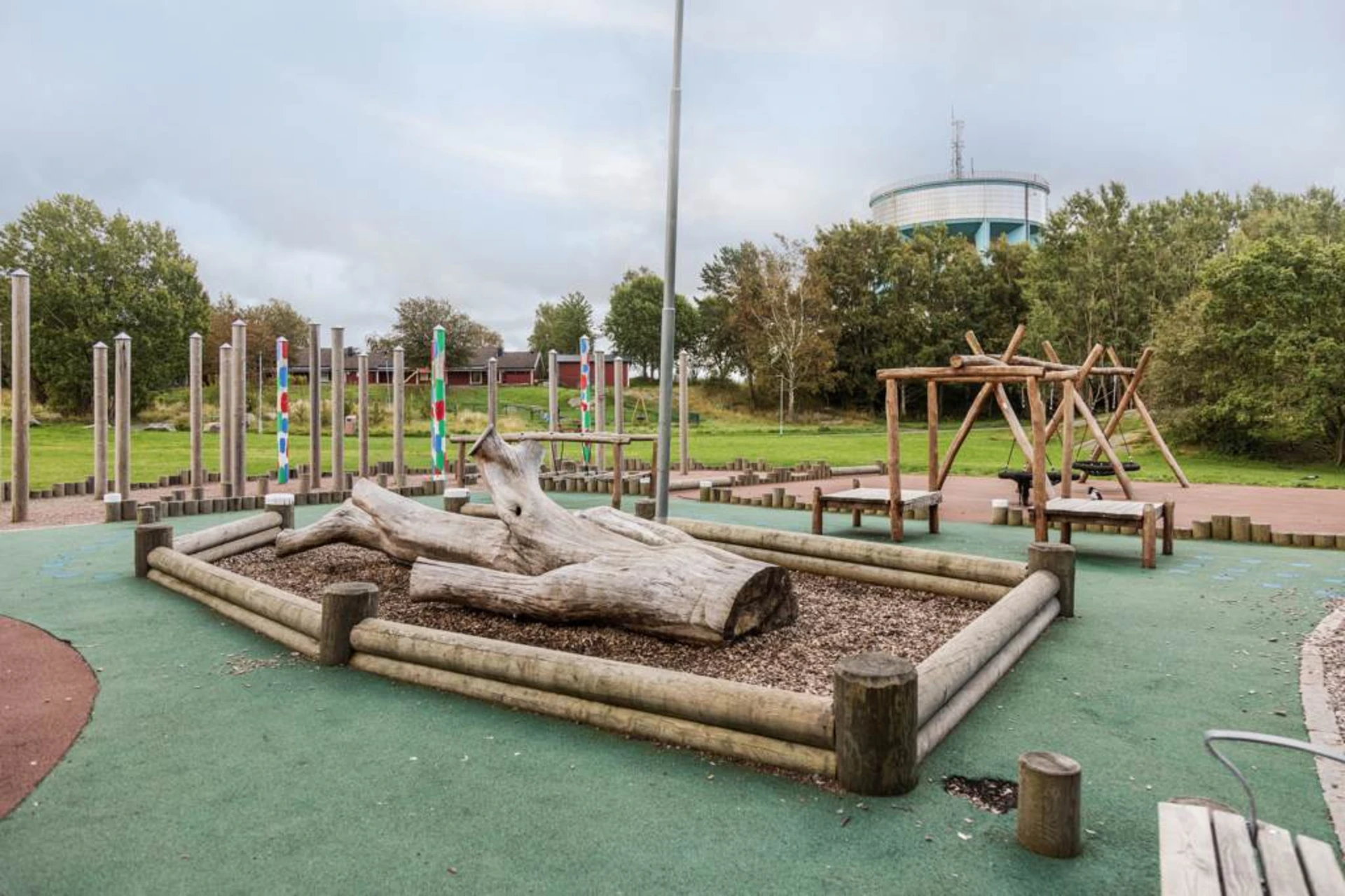 Välskött gård med fina planteringar, utemöbler, grill och lekplats. En bergsknalle med lummig grönska gränsar av samt skapar en härlig miljö att vistas i och en spännande plats att leka på. Det finns även boulebana att nyttja.