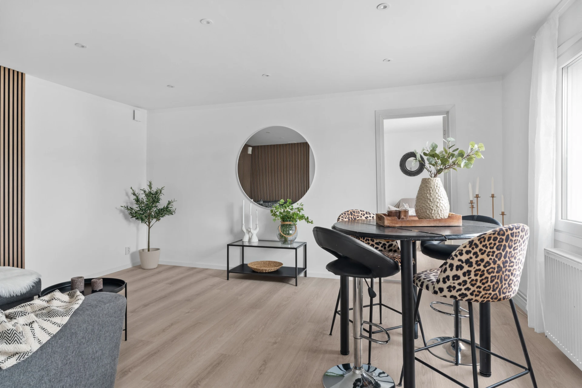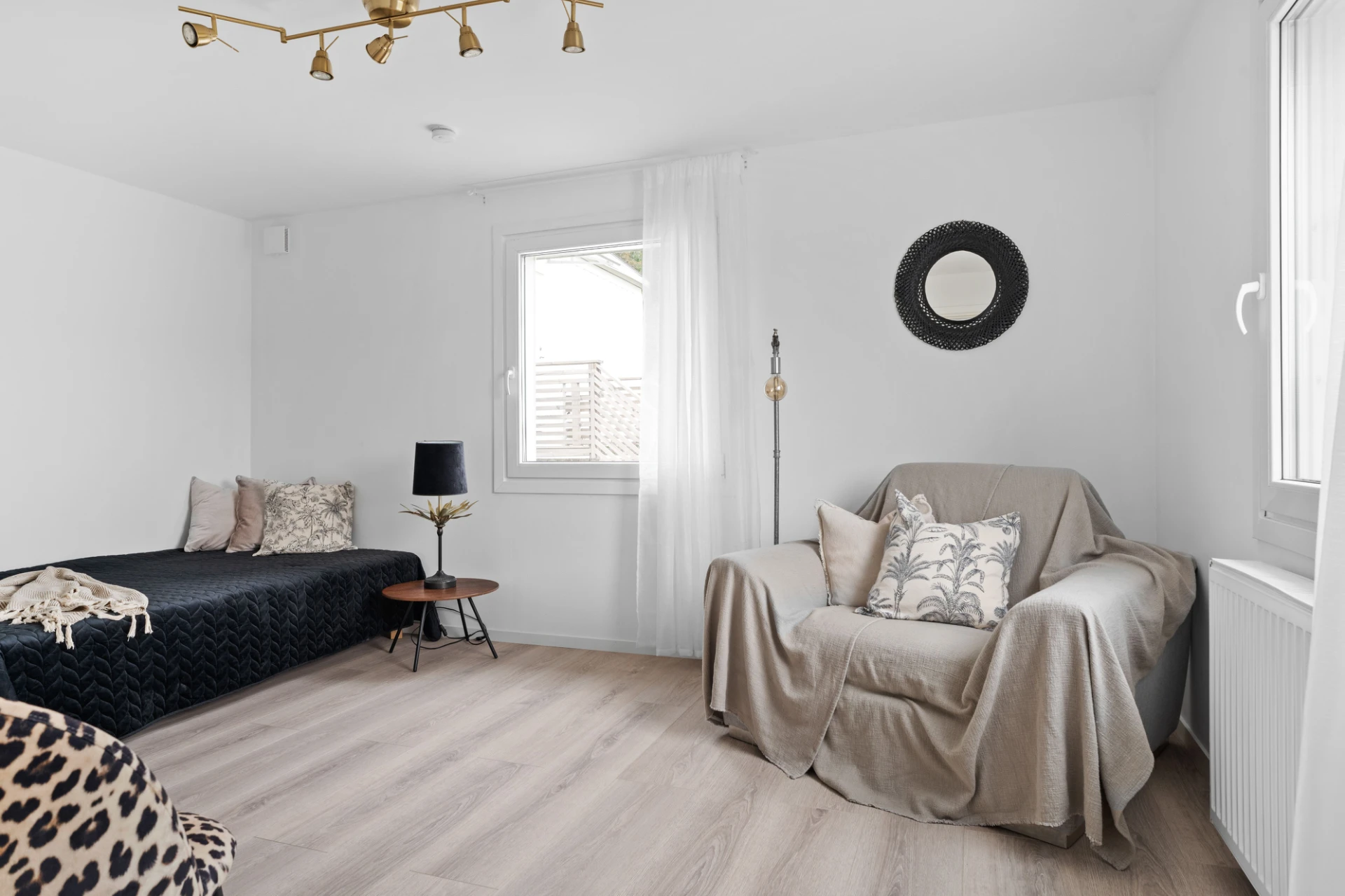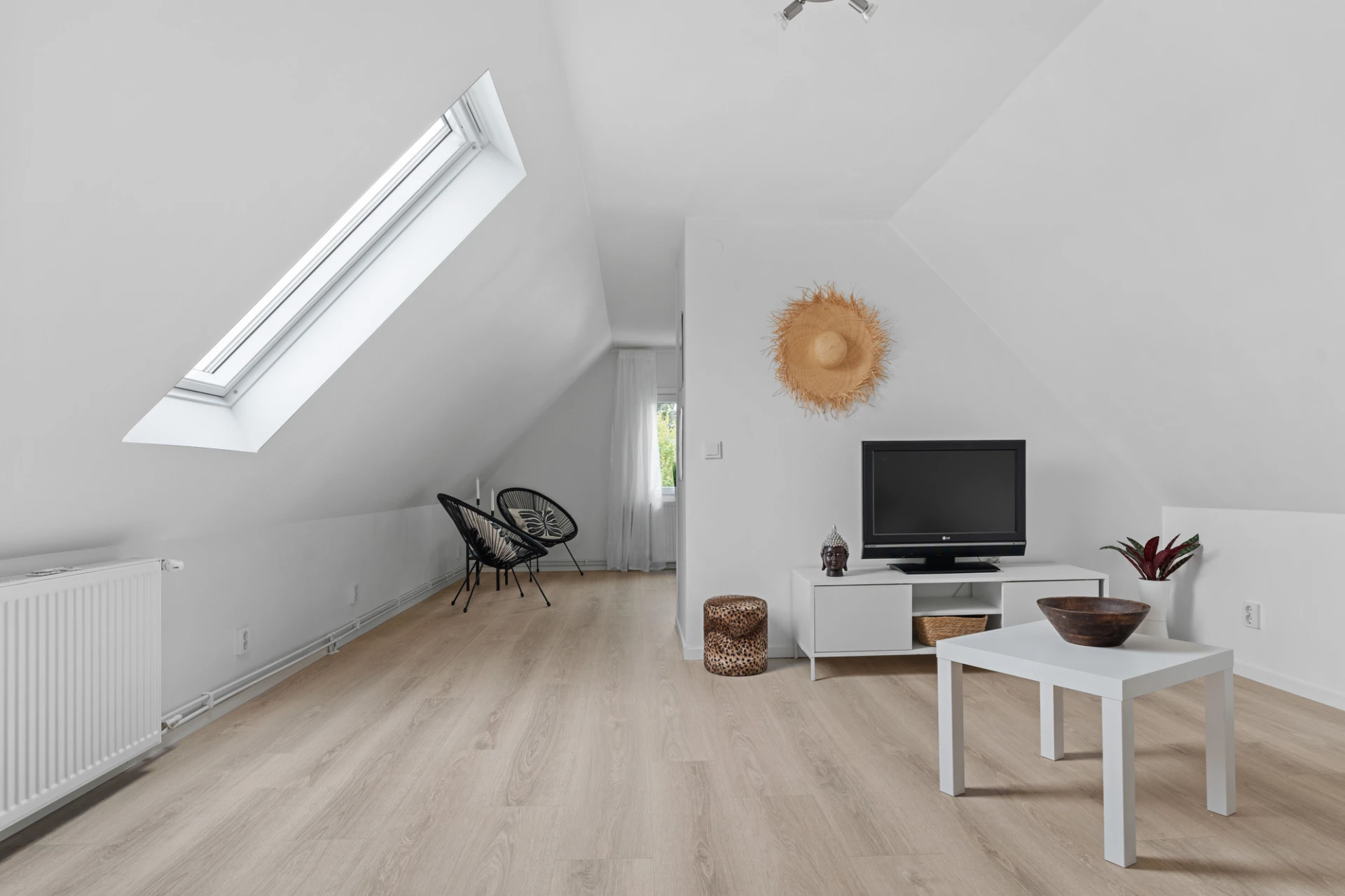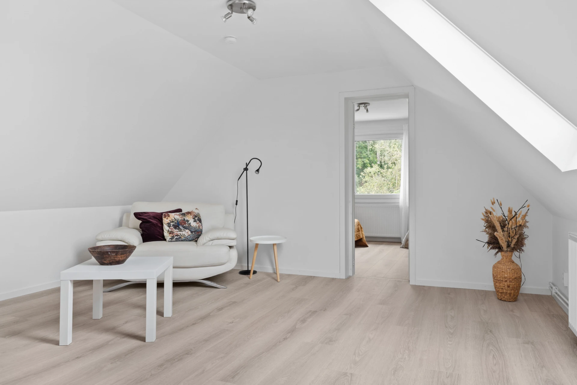 Laminatgolv och vita väggar. Här finns plats för en tv-höra med tillhörande möblemang.