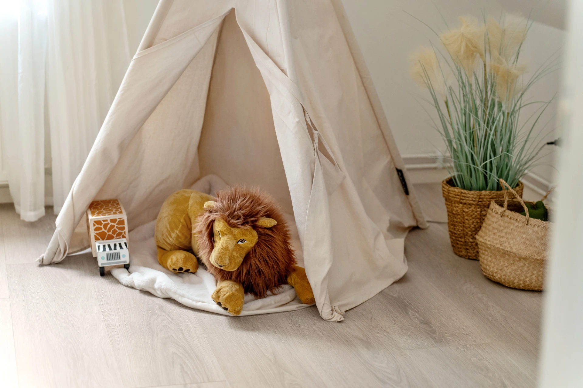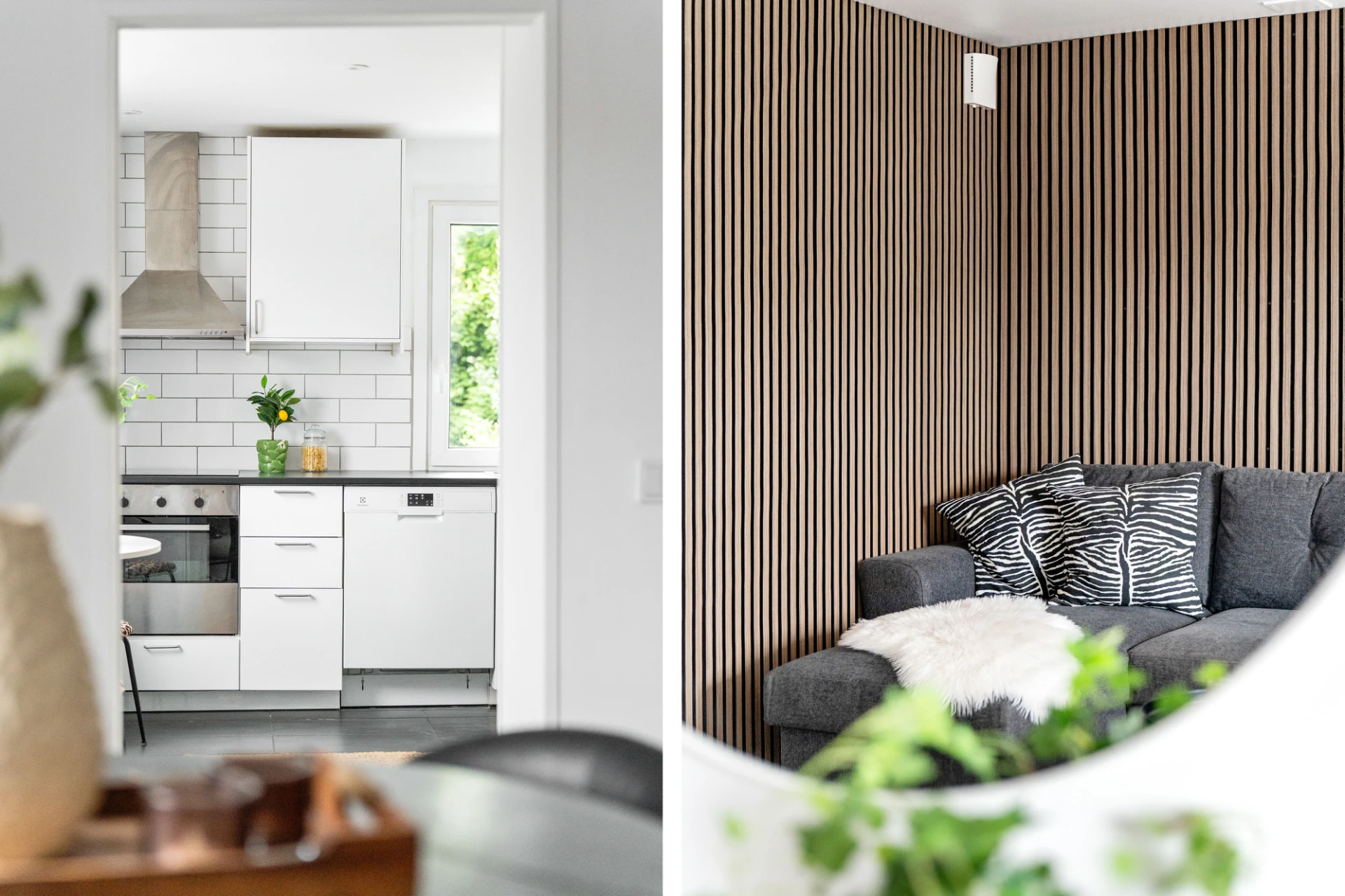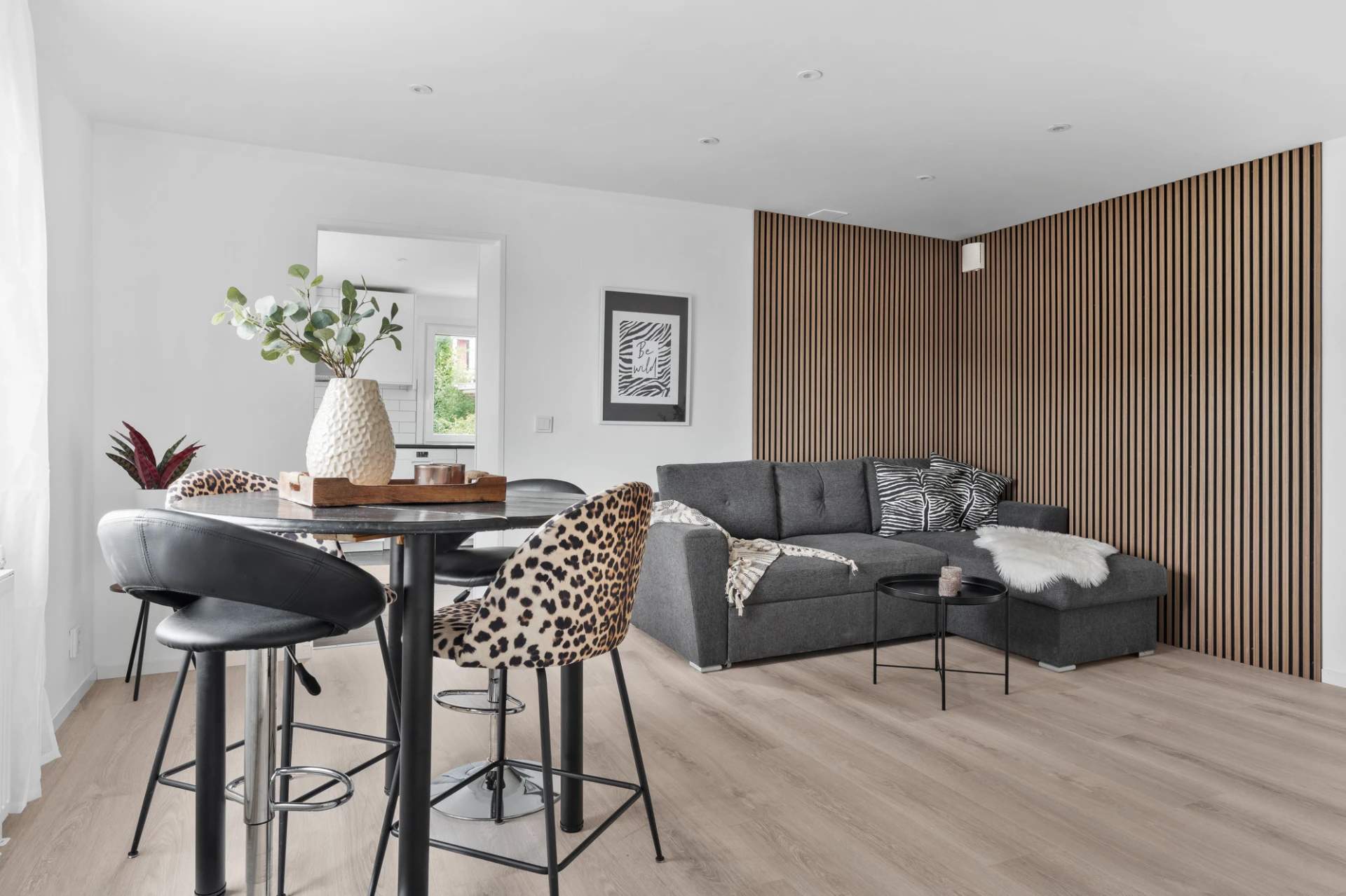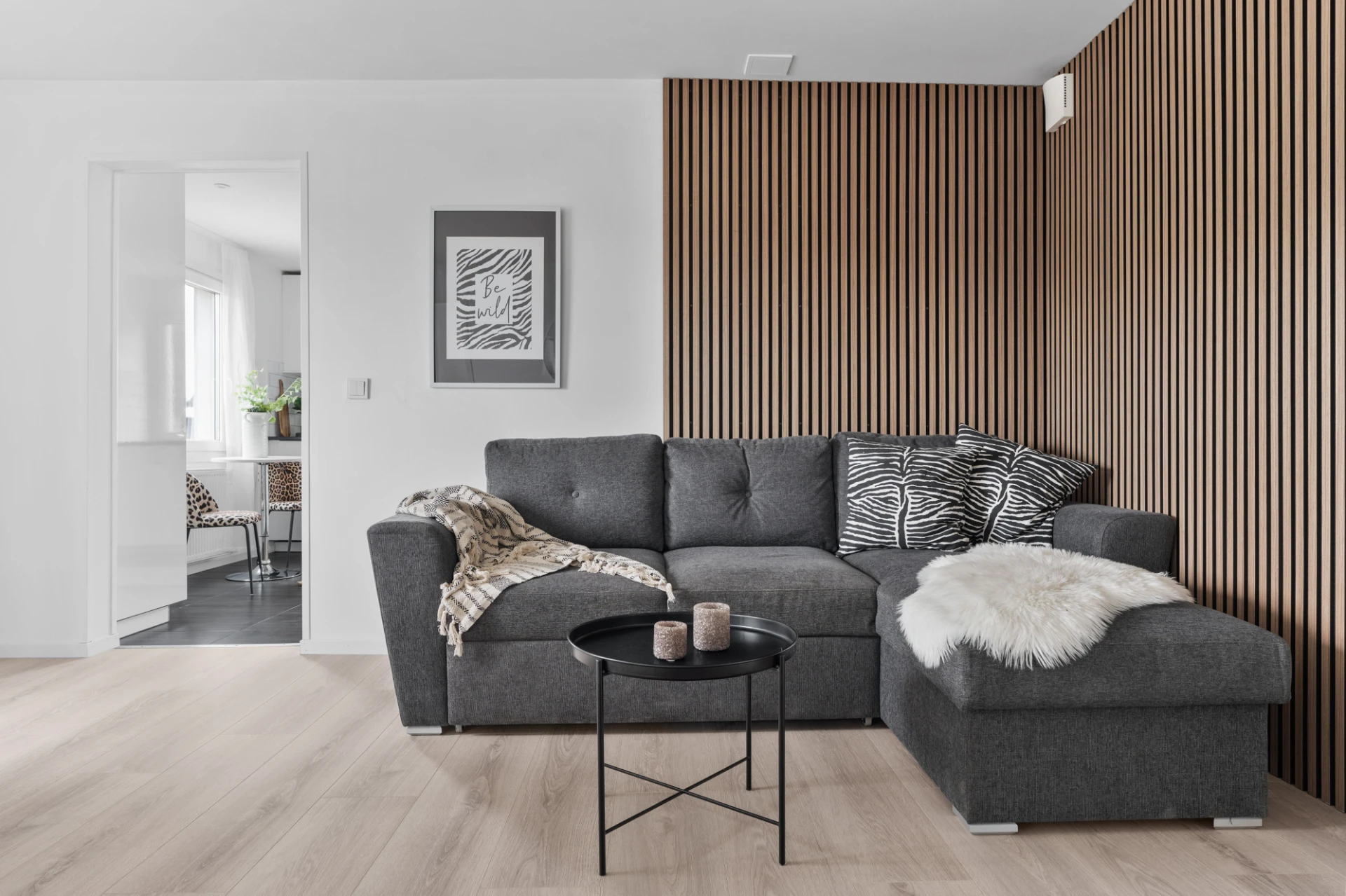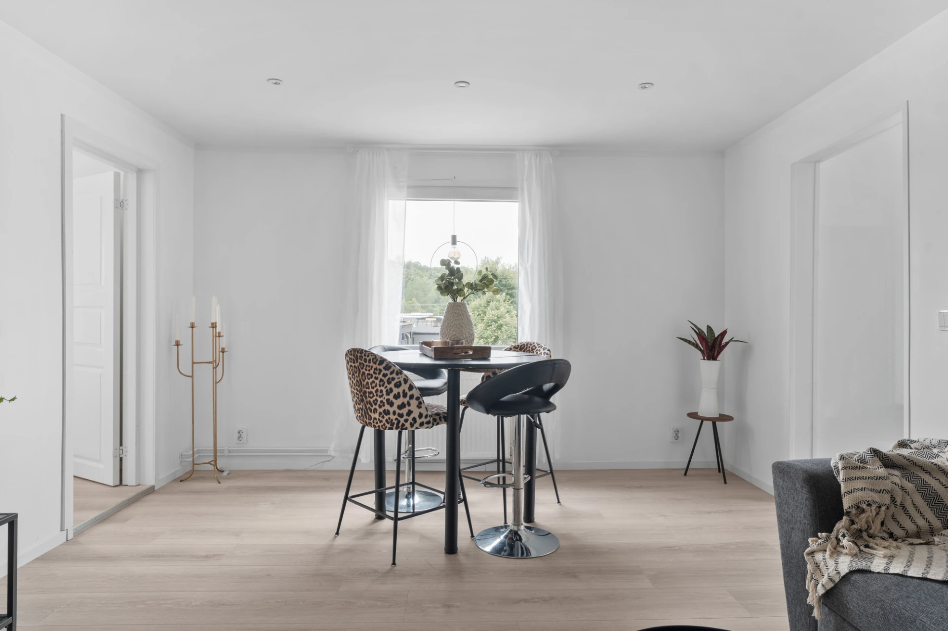 Laminatgolv och vita väggar. Här finns plats för en tv-höra med tillhörande möblemang.