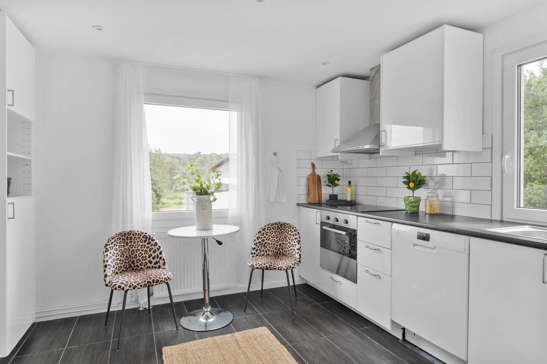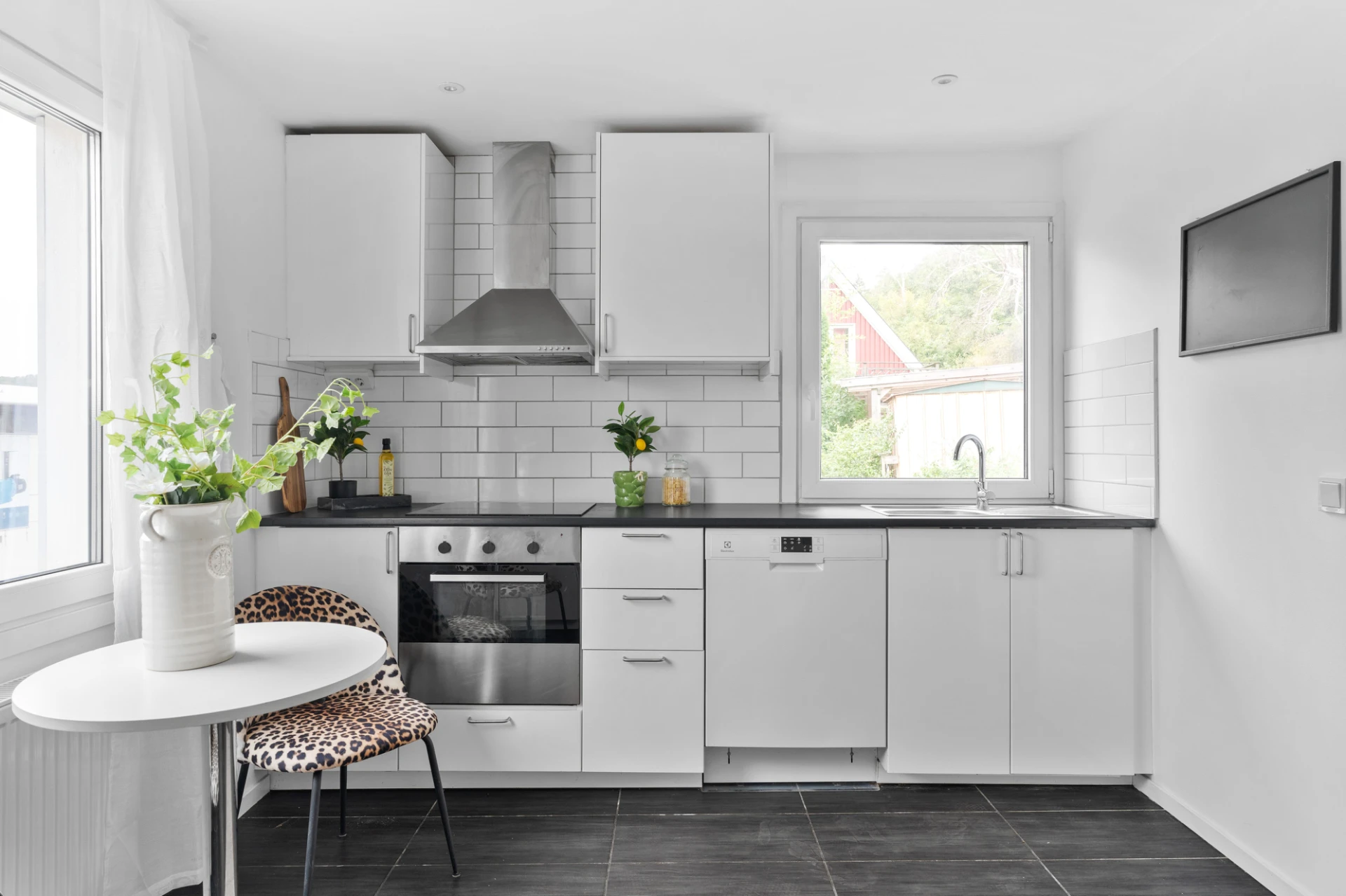 Klinkergolv och vita väggar. Köksinredning med vita luckor, arbetsbänk i laminat samt stänkskydd i vitt kakel. Köket är utrustat med spishäll, inbyggd ugn, diskmaskin, köksfläkt samt kyl/frys. Här ges plats för matbord för 4 personer. Belysning i form av spotlights i tak.