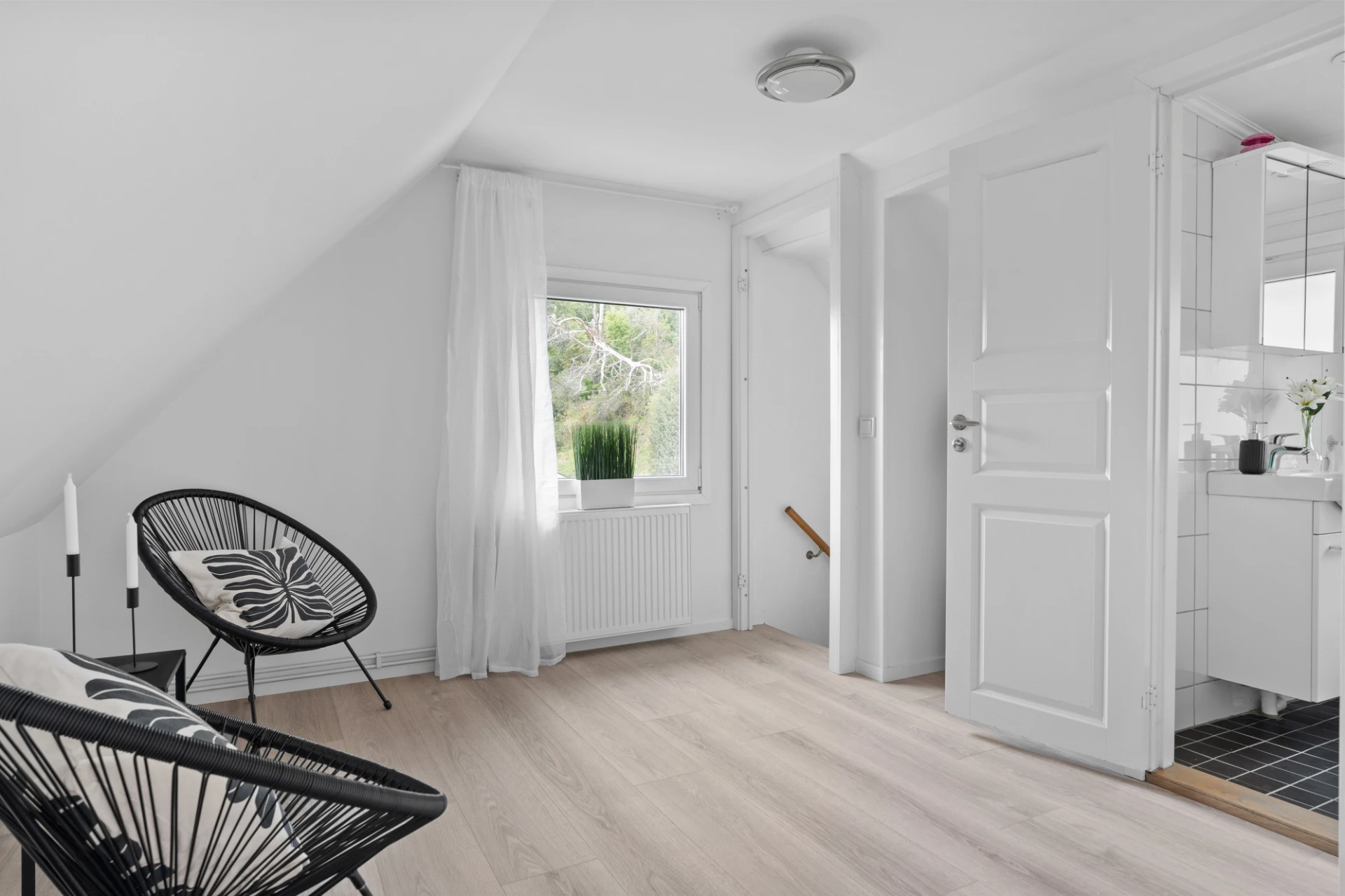 Laminatgolv och vita väggar. Rummet ger möjlighet att användas som exempelvis klädkammare, lekrum eller hemmakontor. Den befintliga klädkammaren kan med enkla medel tas bort utan att ge större åverkan på väggar och golv.