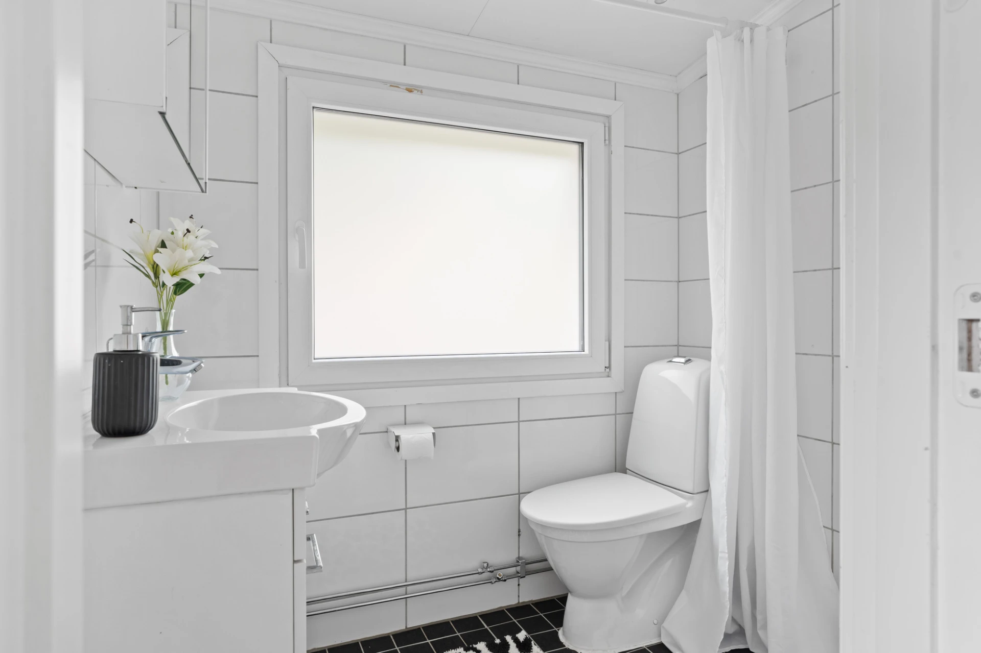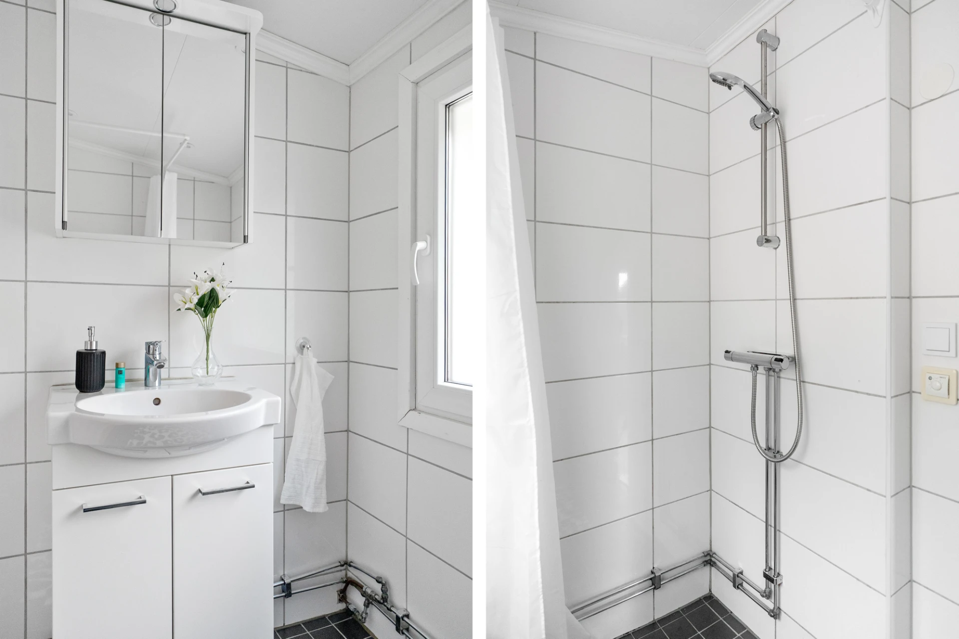 Svart klinkergolv och vitt kakel på väggar. Badrummet är inrett med WC, handfat med kommod, spegelskåp och dusch. Belysning i form av spotlights samt en öppningsbart fönster för vädring.