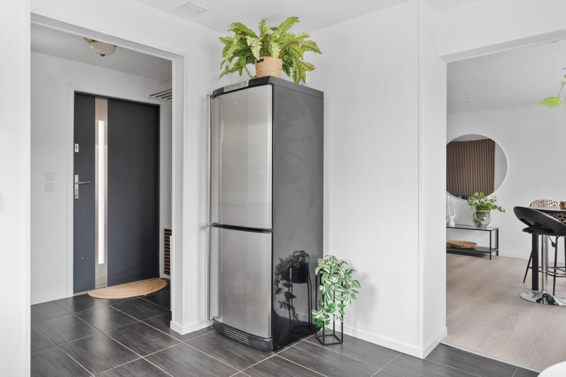 Egen entré. Golvmatta och vita väggar. Här finns plats att inreda med förvaringsmöbel och annan möblemang som exempelvis säng eller sittgrupp.