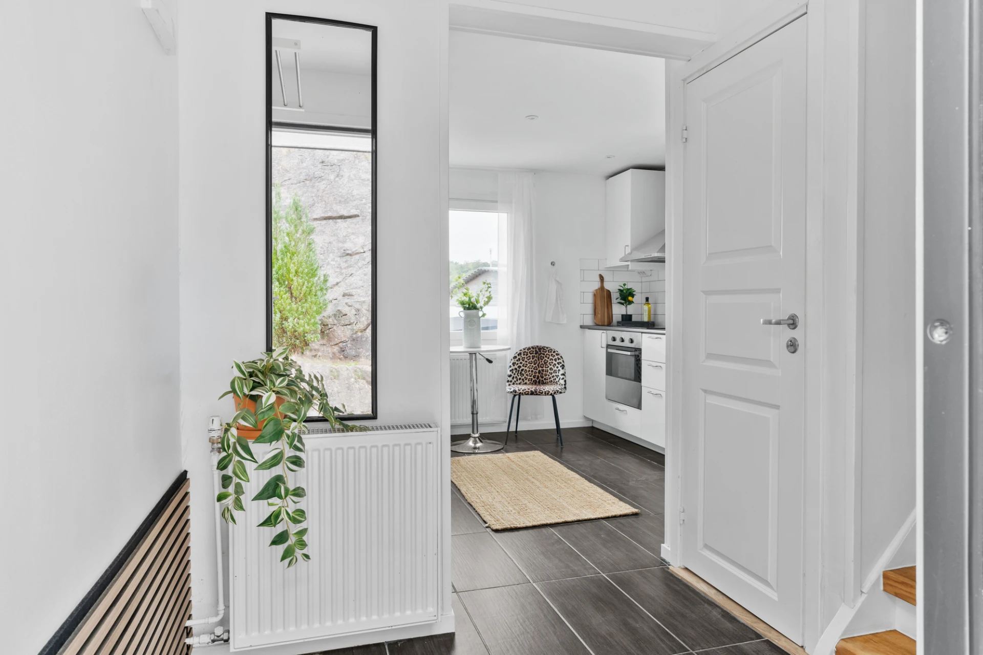 Klinkergolv och vita väggar. Hallen är inredd med hatthylla för avhängning av ytterkläderna.