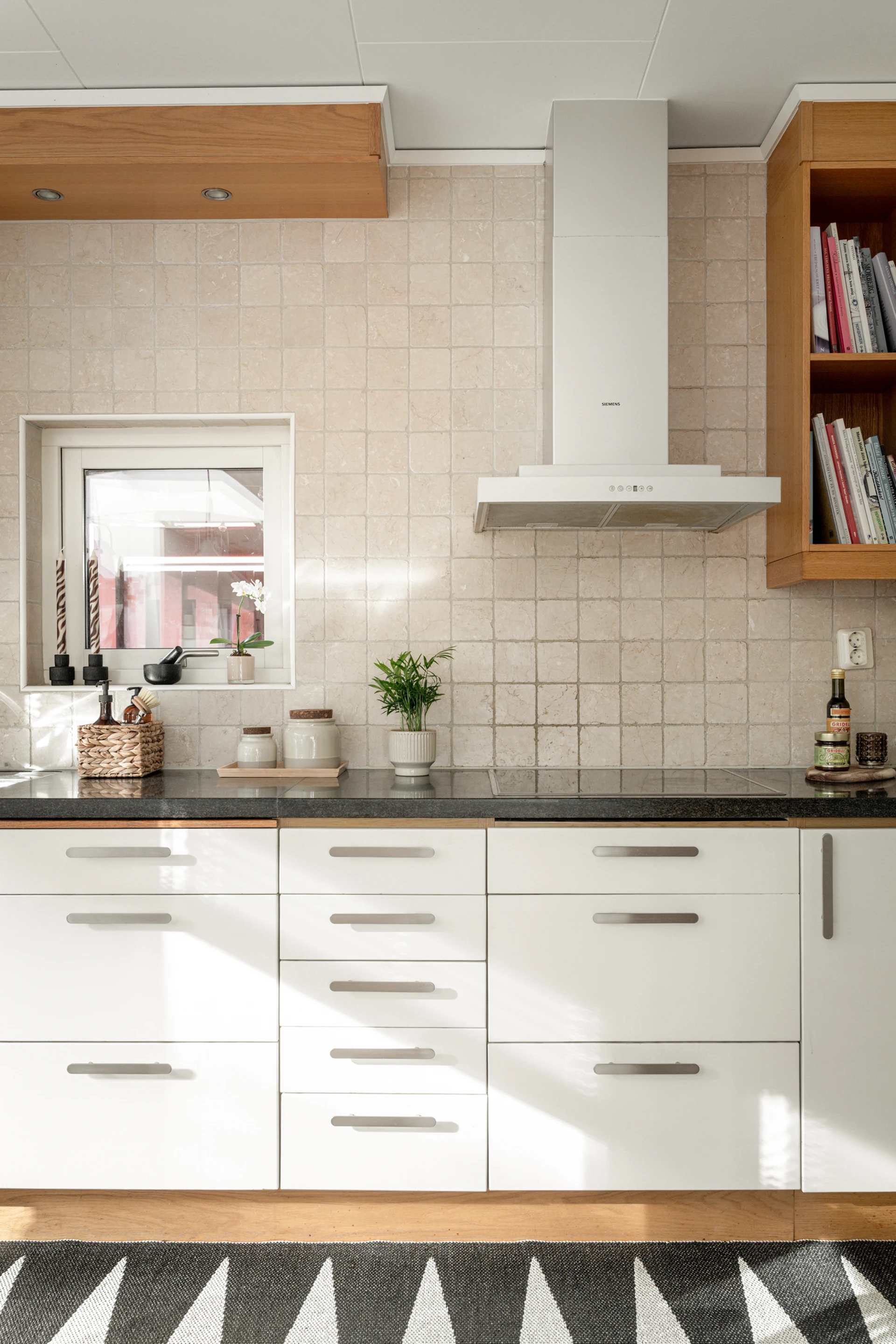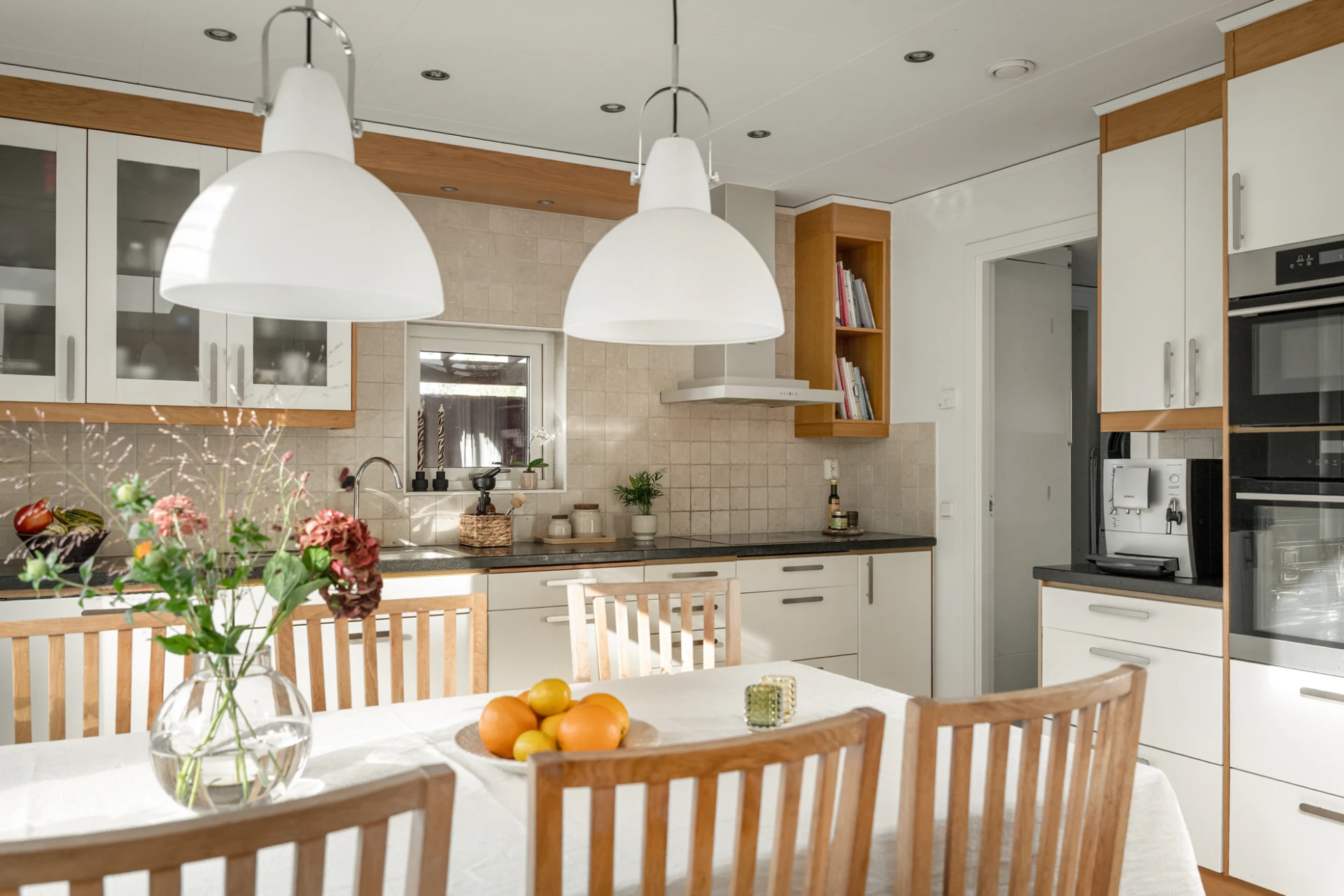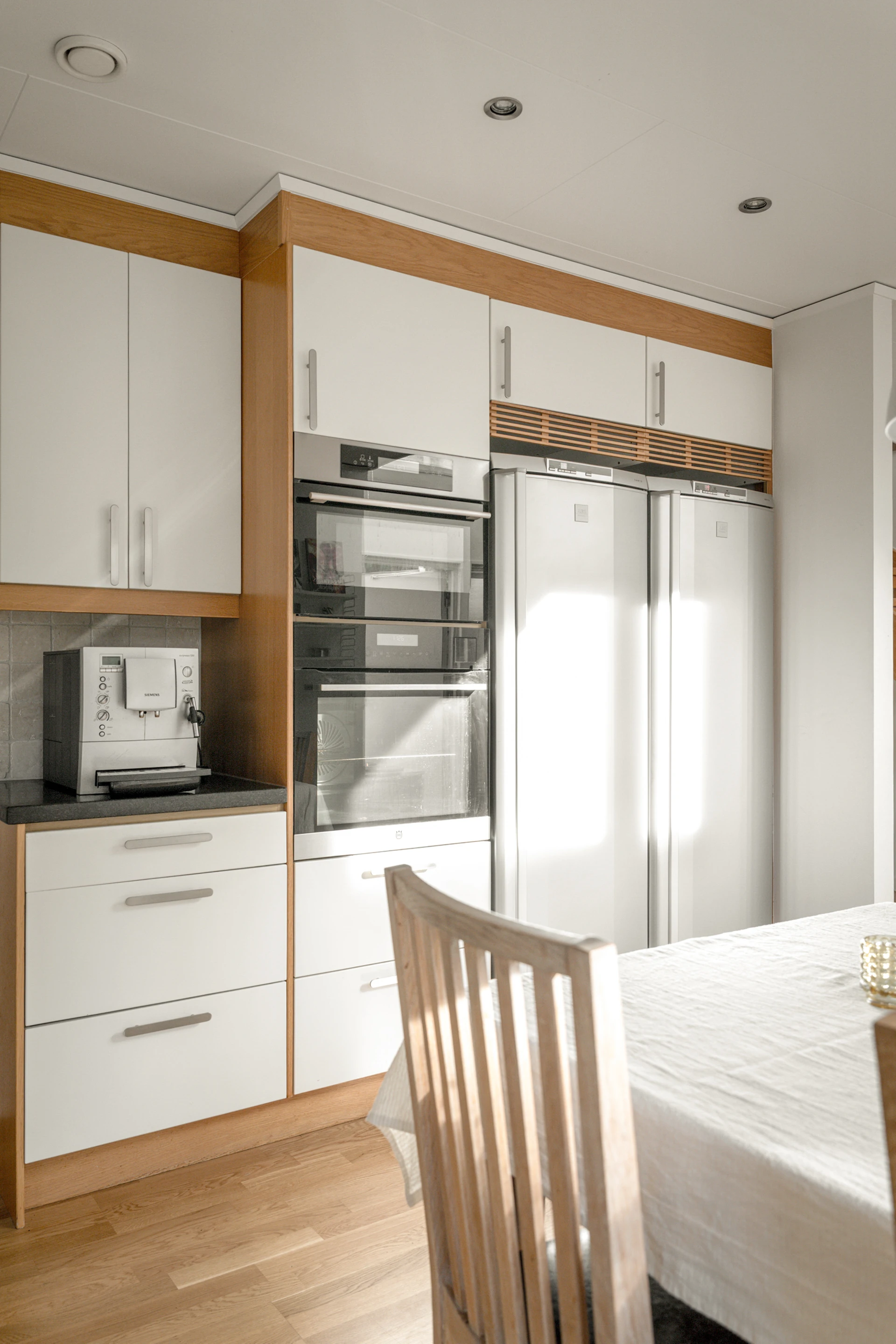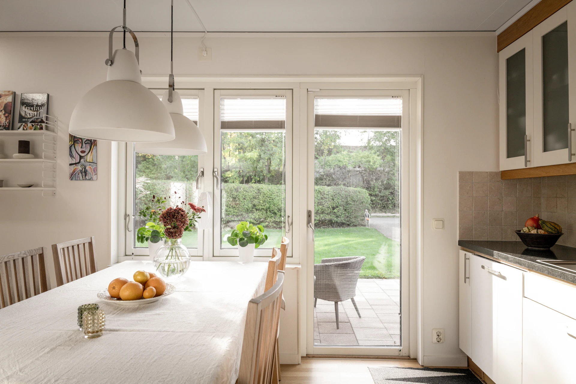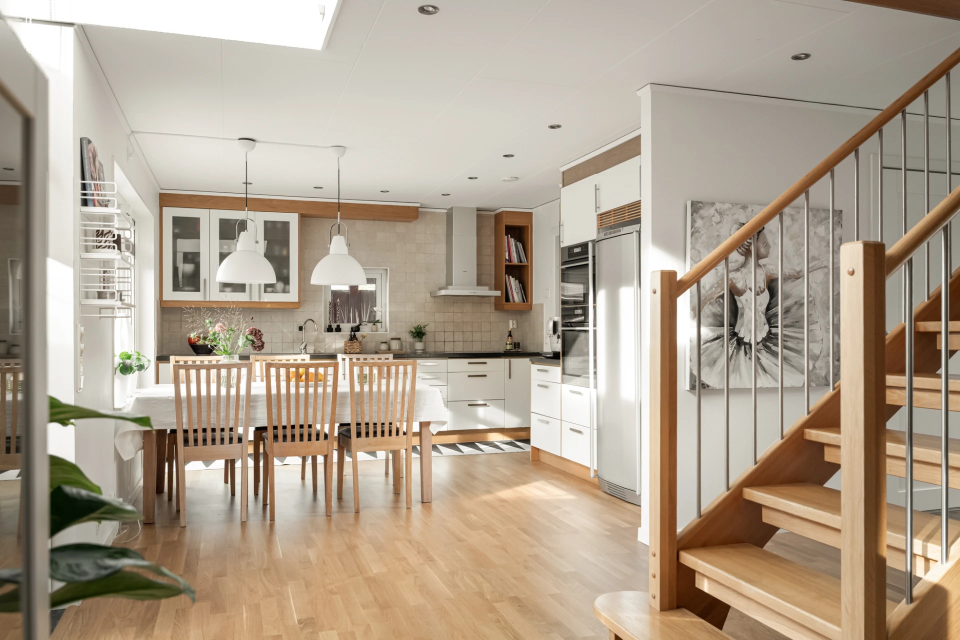 Ekparkett på golvet och vita väggar ger ett sobert, tidlöst intryck som förstärks av köksinredningen i ek och vitt. Stänkskydd i beige och arbetsytor med mörka stenskivor höjer helhetskänslan. Vitvarorna består av kyl, frys, induktionshäll, inbyggd ugn, ångugn, mikro, diskmaskin samt fläkt. Golvvärme ger extra komfort, och dimbara spotlights i taket samt över arbetsbänkarna står för belysningen. Den praktiska planlösningen skapar en naturlig närhet mellan inne och ute.