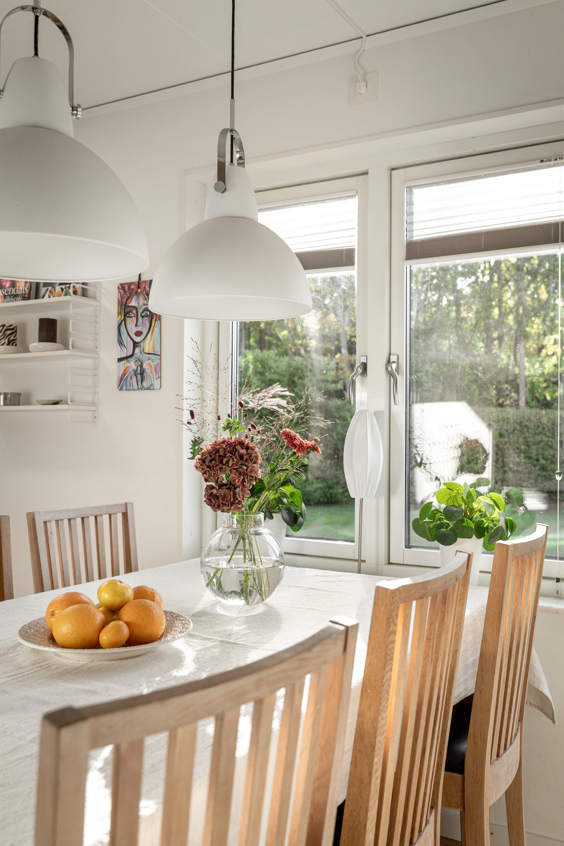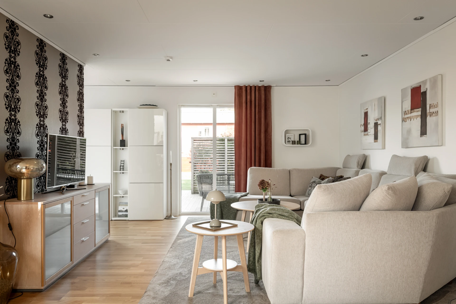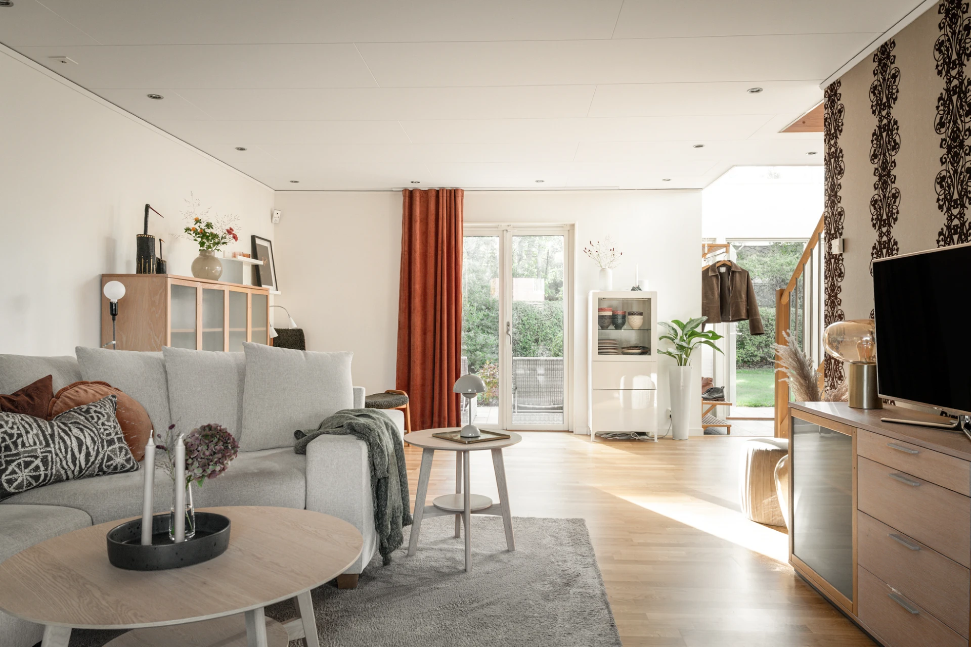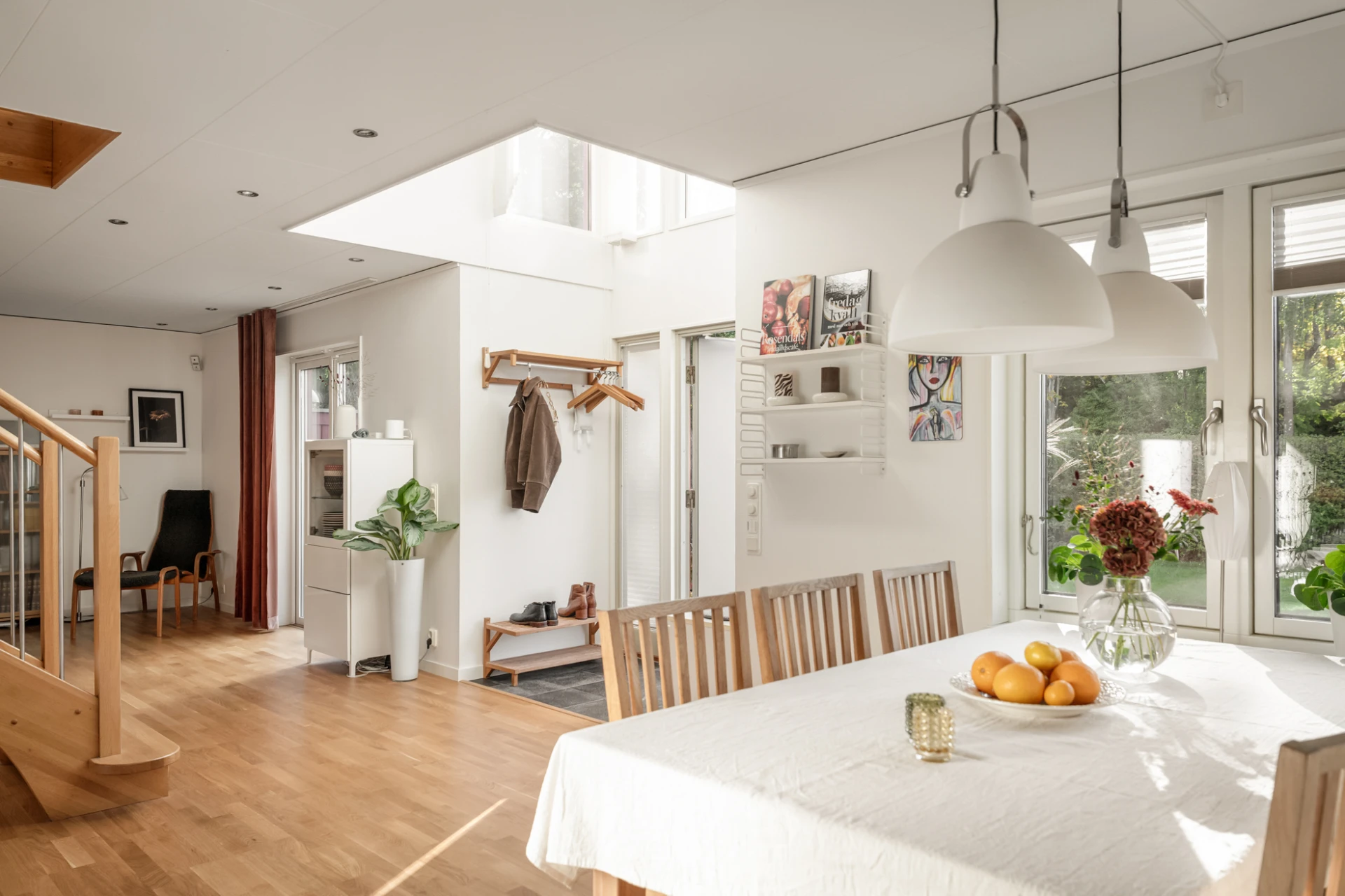 Ett stort och genomgående rum, perfekt för sociala umgängen men också för lek och vardagsliv. Härifrån nås altanerna både på entrésidan och trädgårdssidan. På golvet ligger varm och skön ekparkett, väggarna är målade i vitt och bryts av med en fondtapet. Dimbara spotlights ger flexibel belysning.