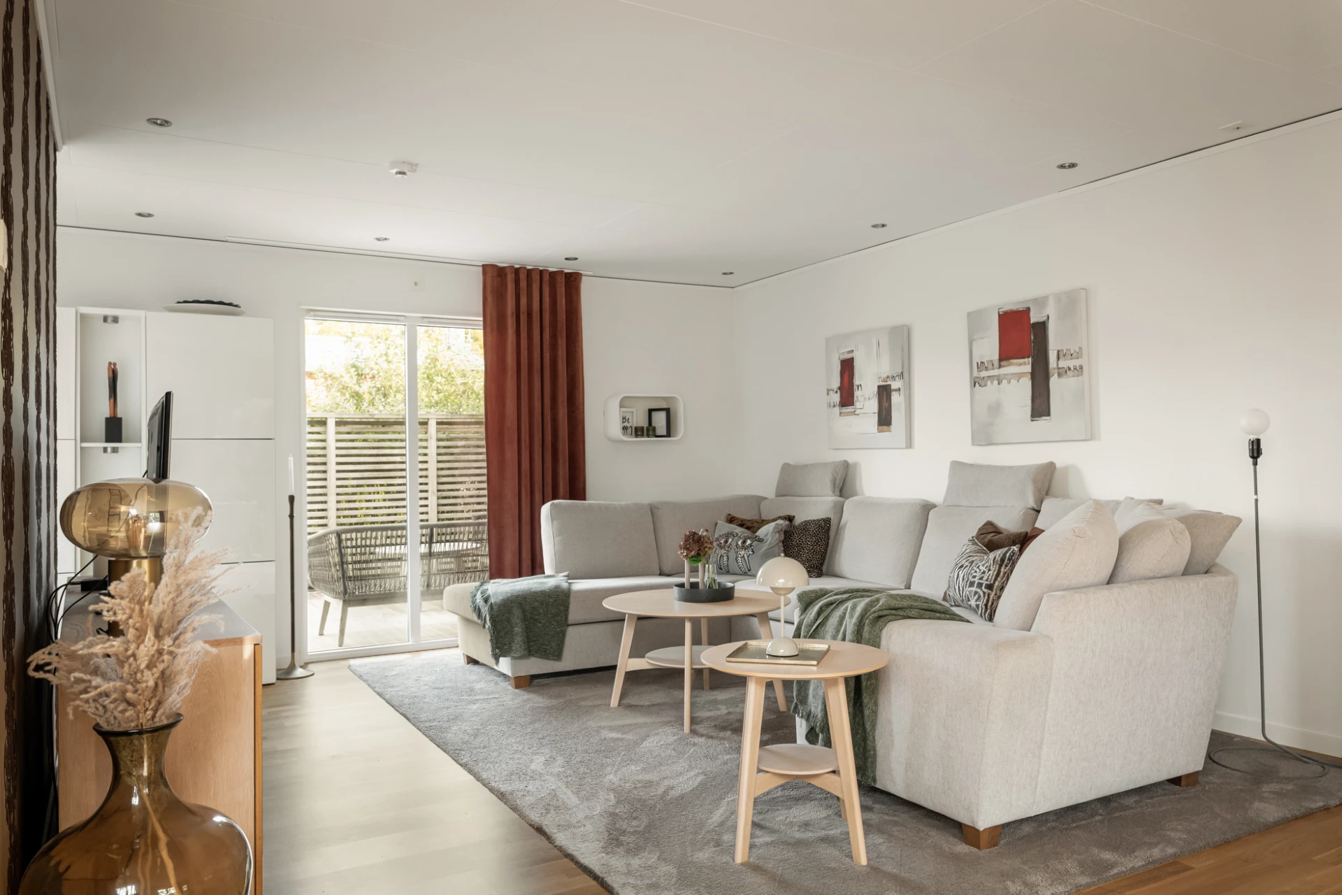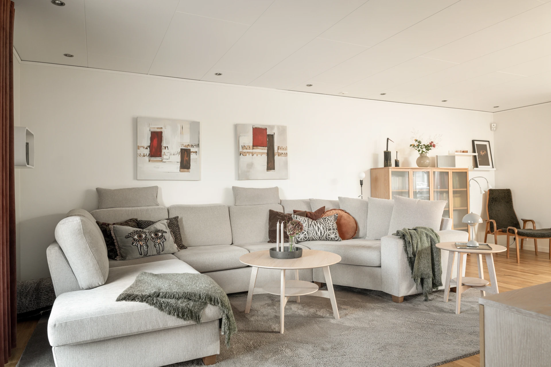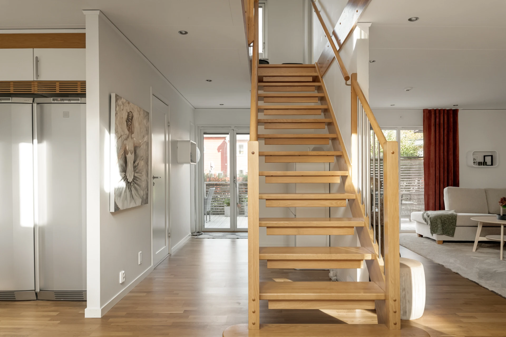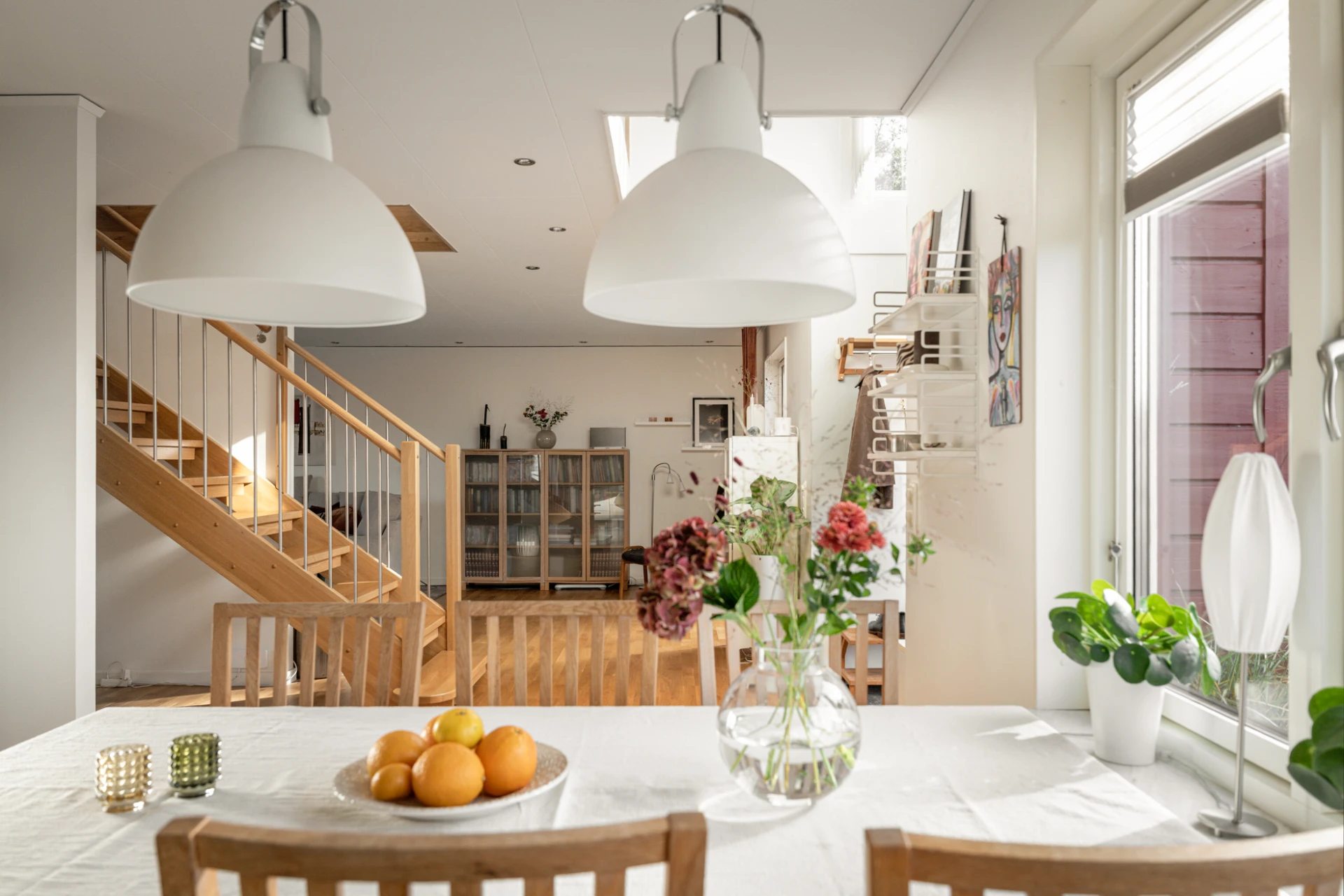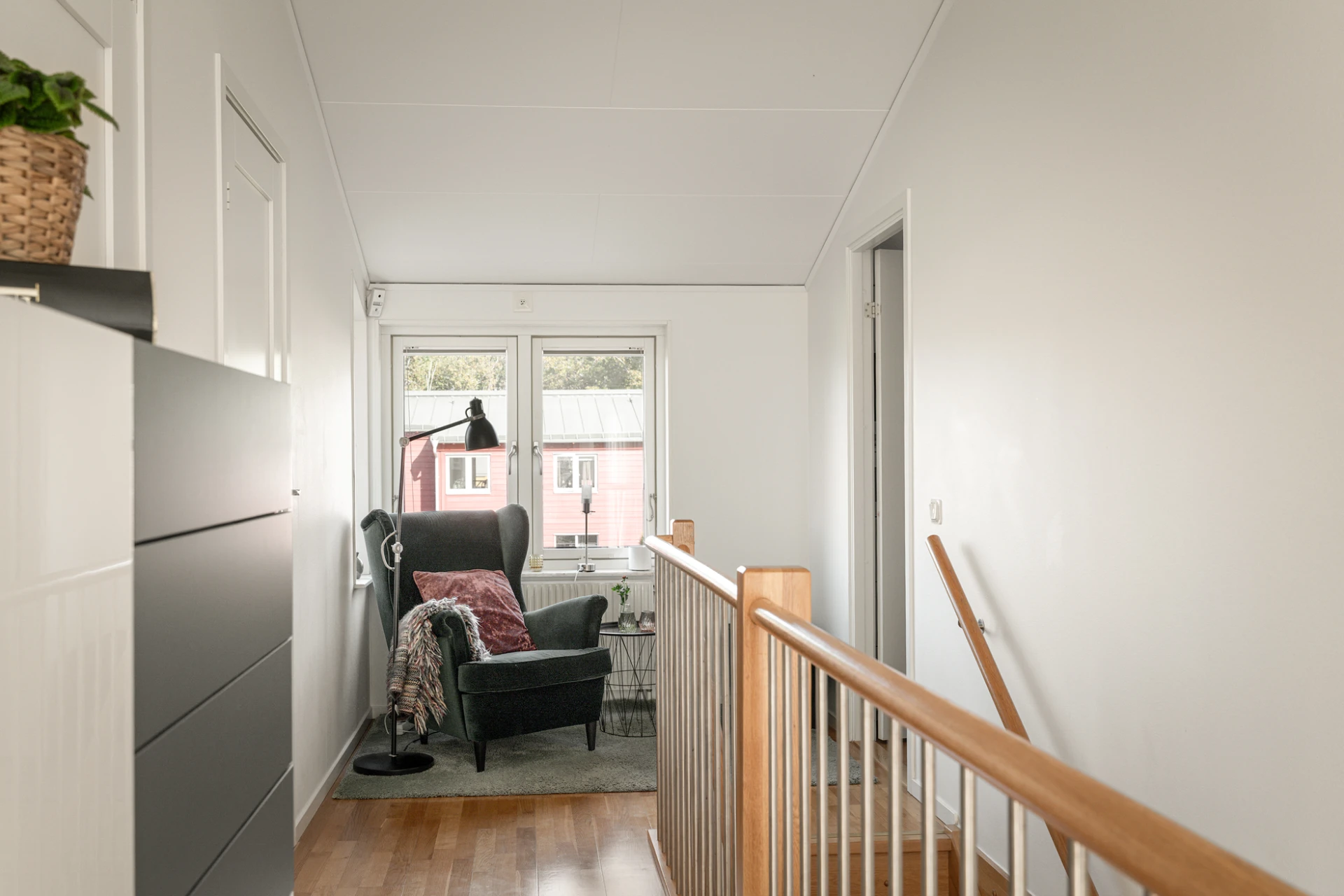 Ett stort och genomgående rum, perfekt för sociala umgängen men också för lek och vardagsliv. Härifrån nås altanerna både på entrésidan och trädgårdssidan. På golvet ligger varm och skön ekparkett, väggarna är målade i vitt och bryts av med en fondtapet. Dimbara spotlights ger flexibel belysning.
