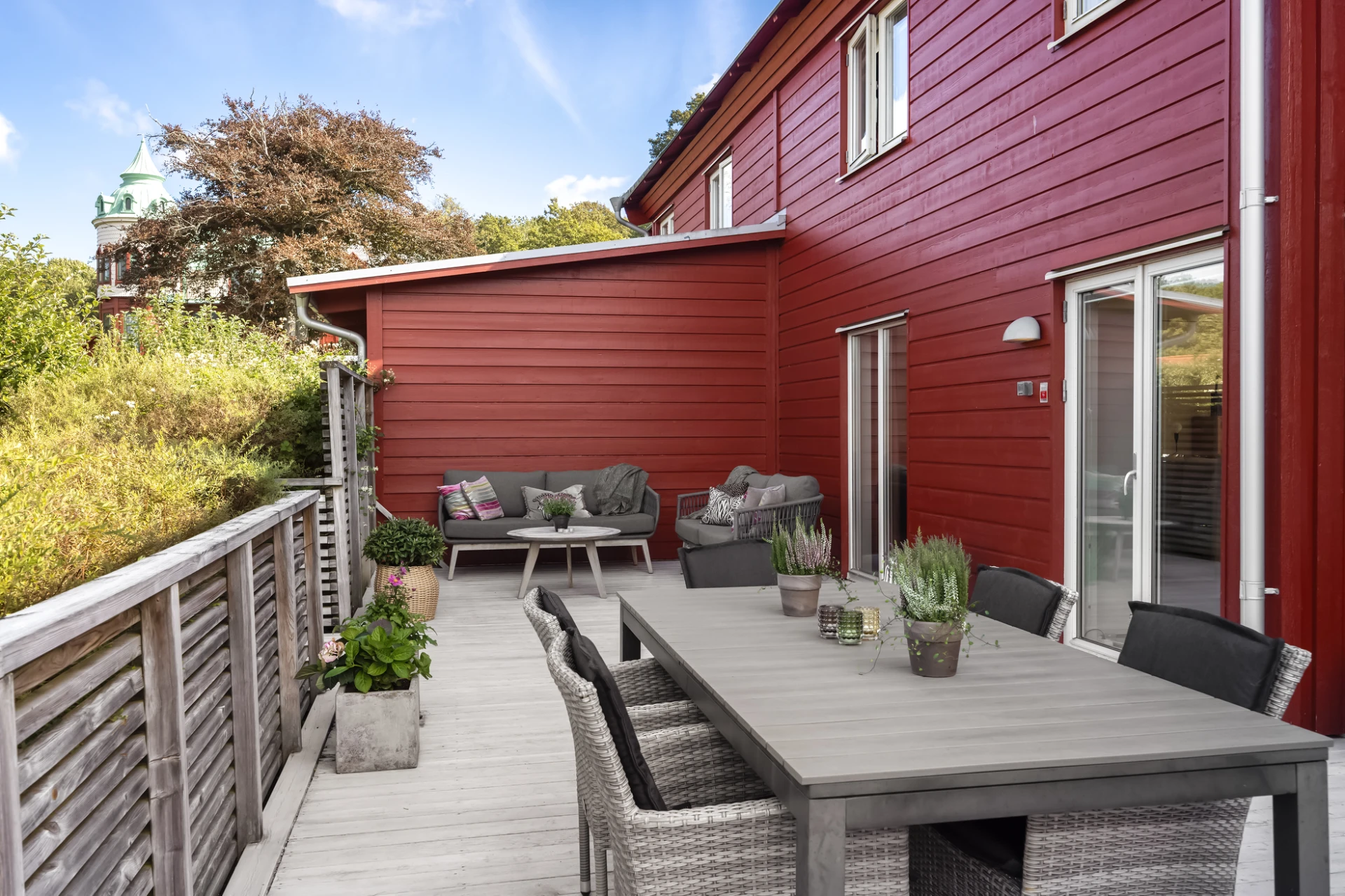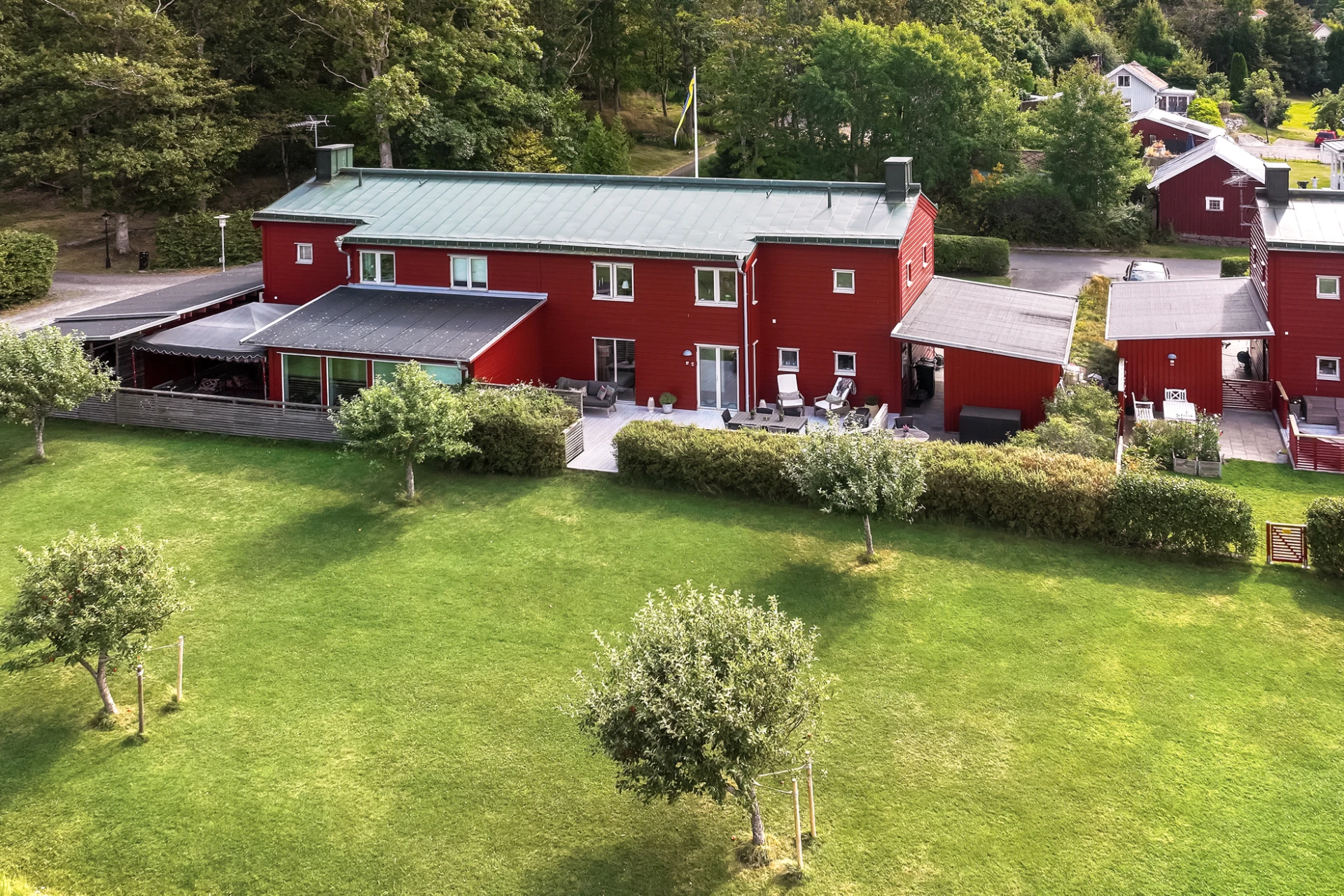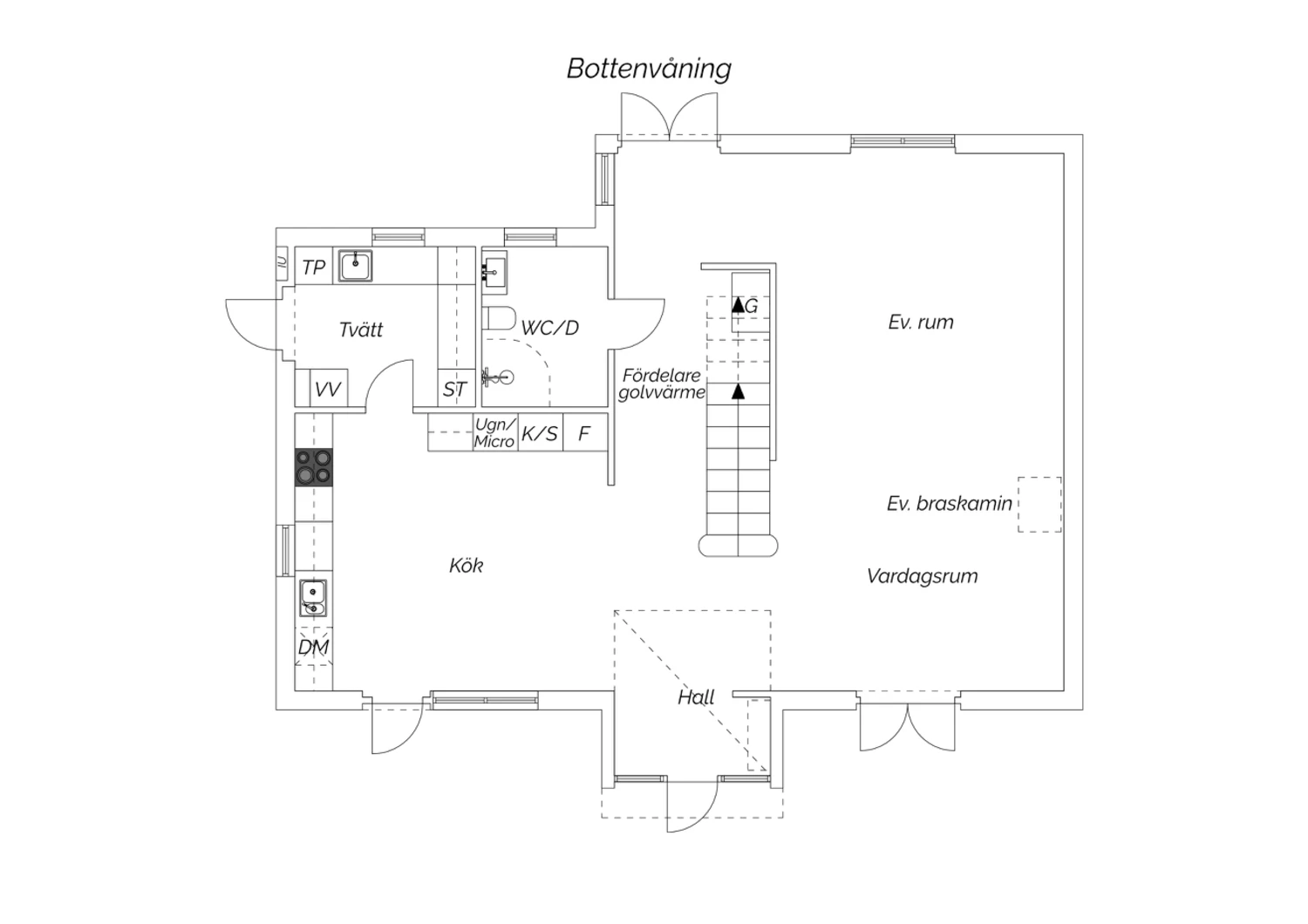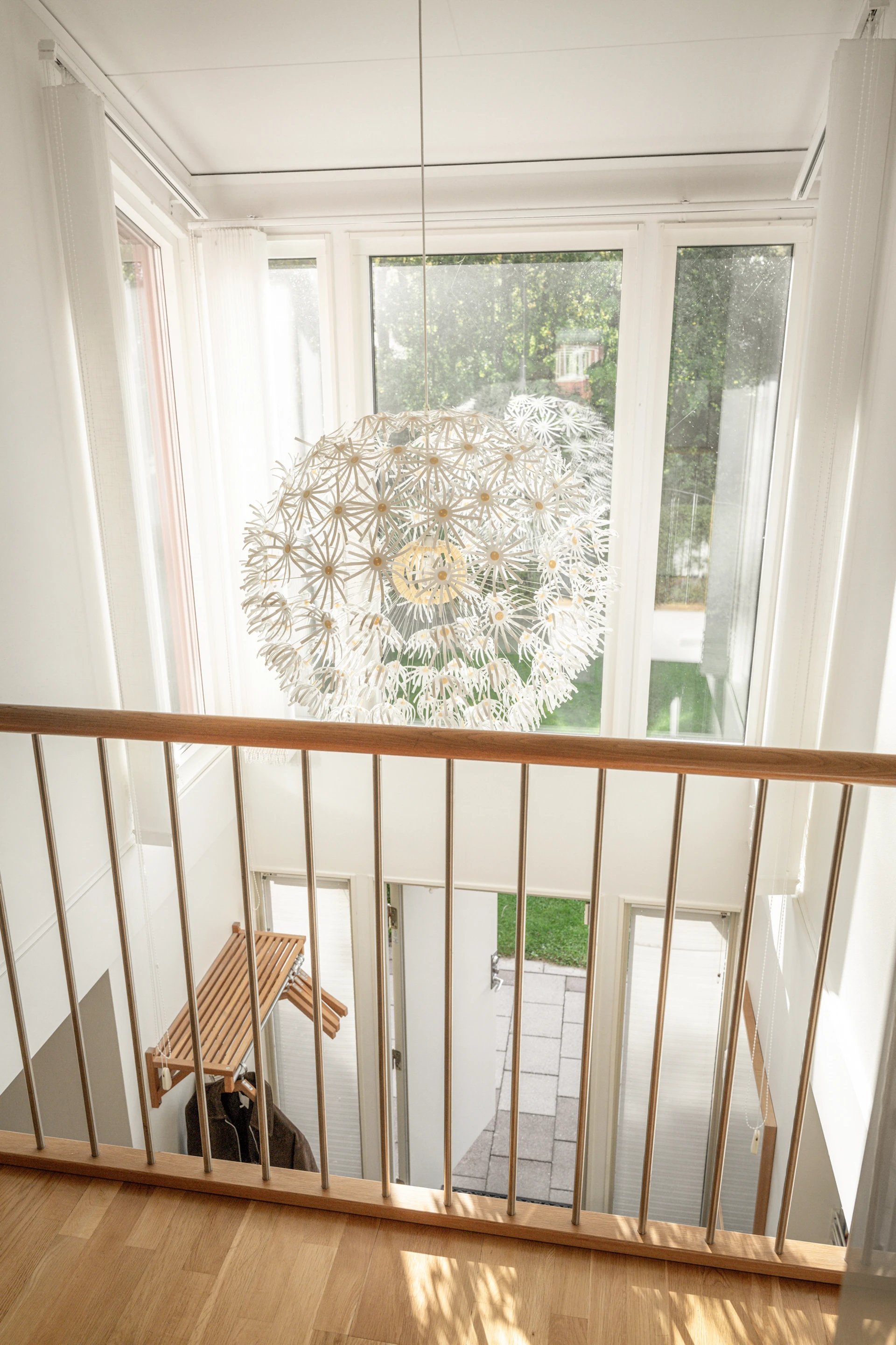 Ett stort och genomgående rum, perfekt för sociala umgängen men också för lek och vardagsliv. Härifrån nås altanerna både på entrésidan och trädgårdssidan. På golvet ligger varm och skön ekparkett, väggarna är målade i vitt och bryts av med en fondtapet. Dimbara spotlights ger flexibel belysning.
