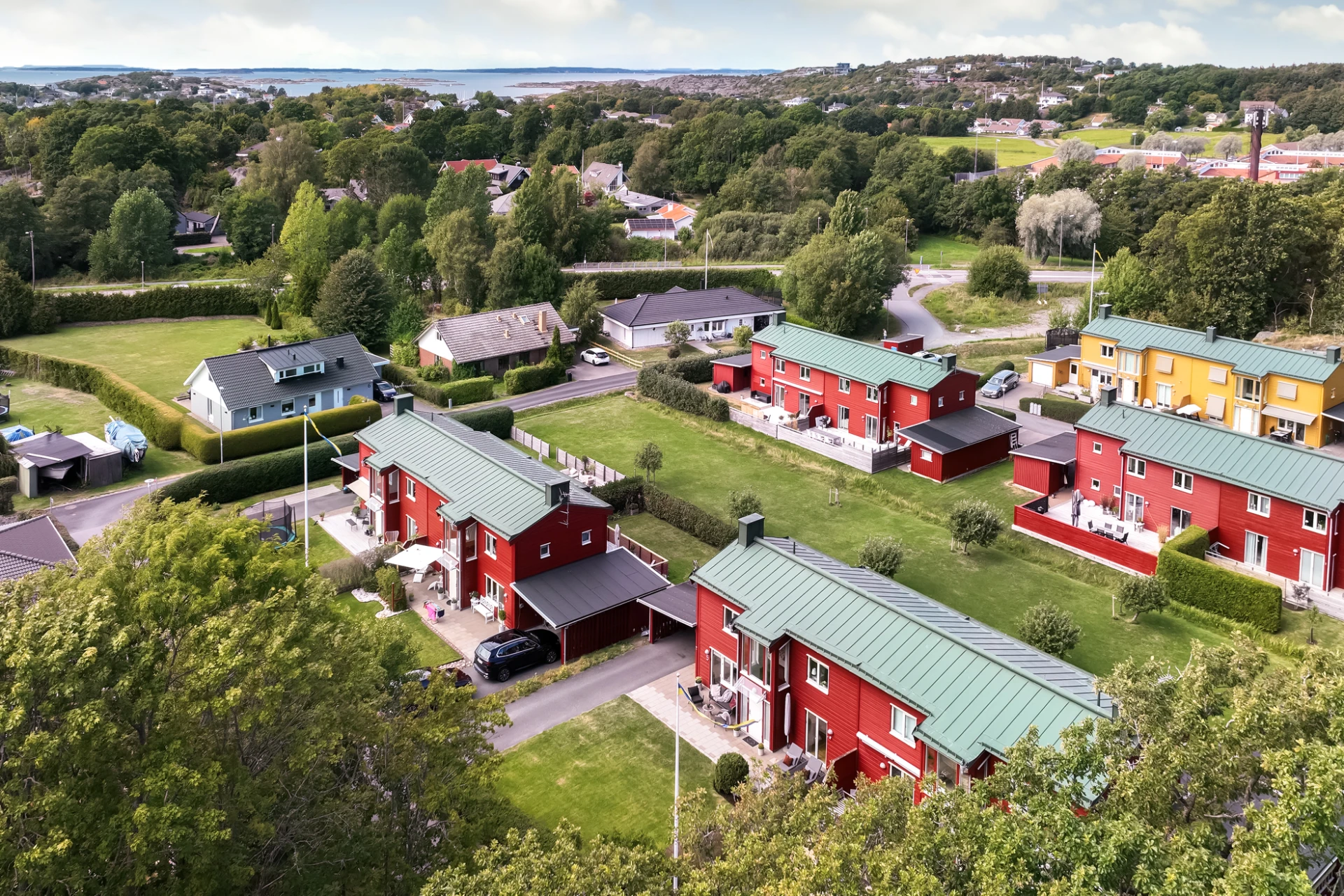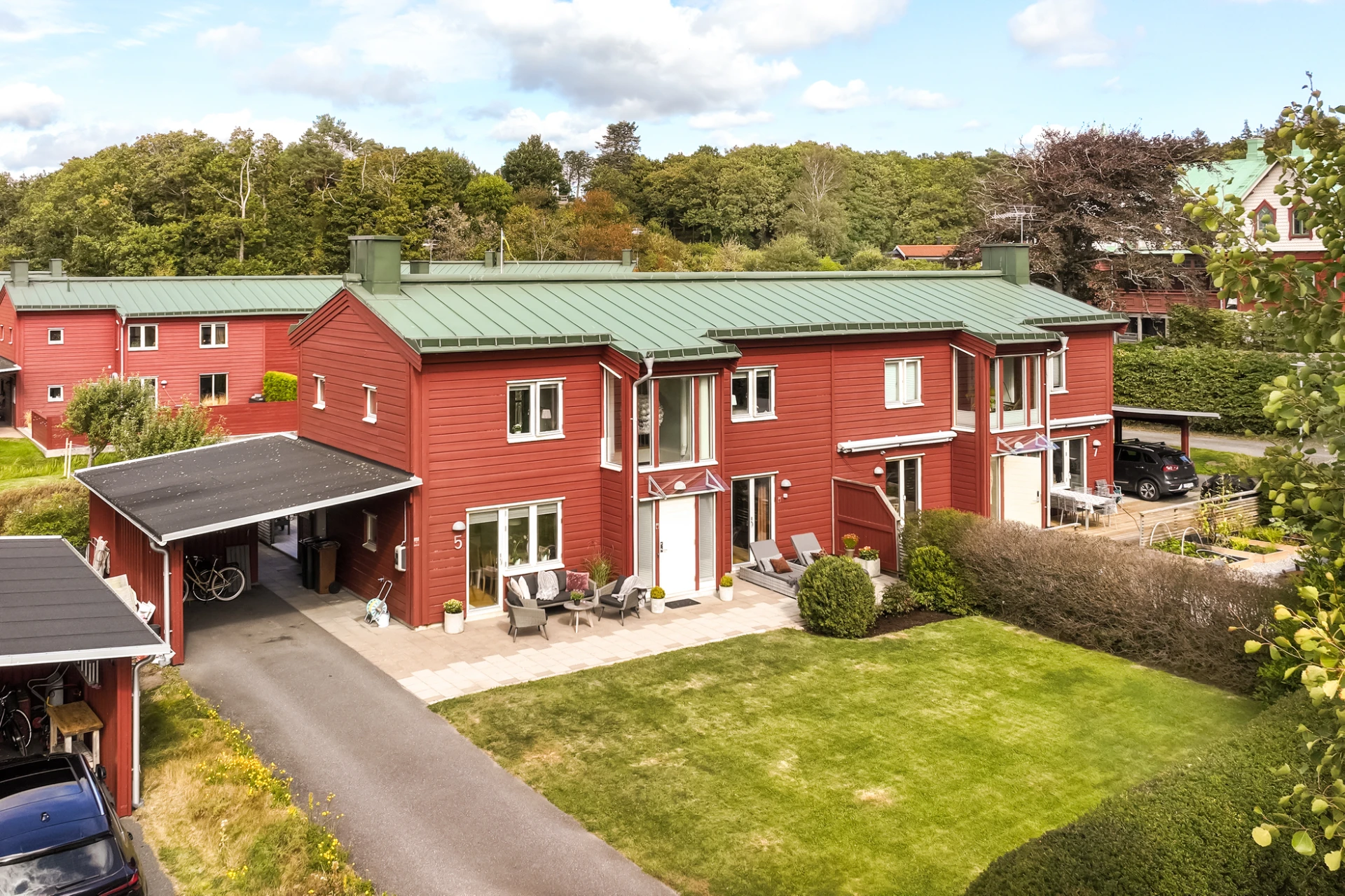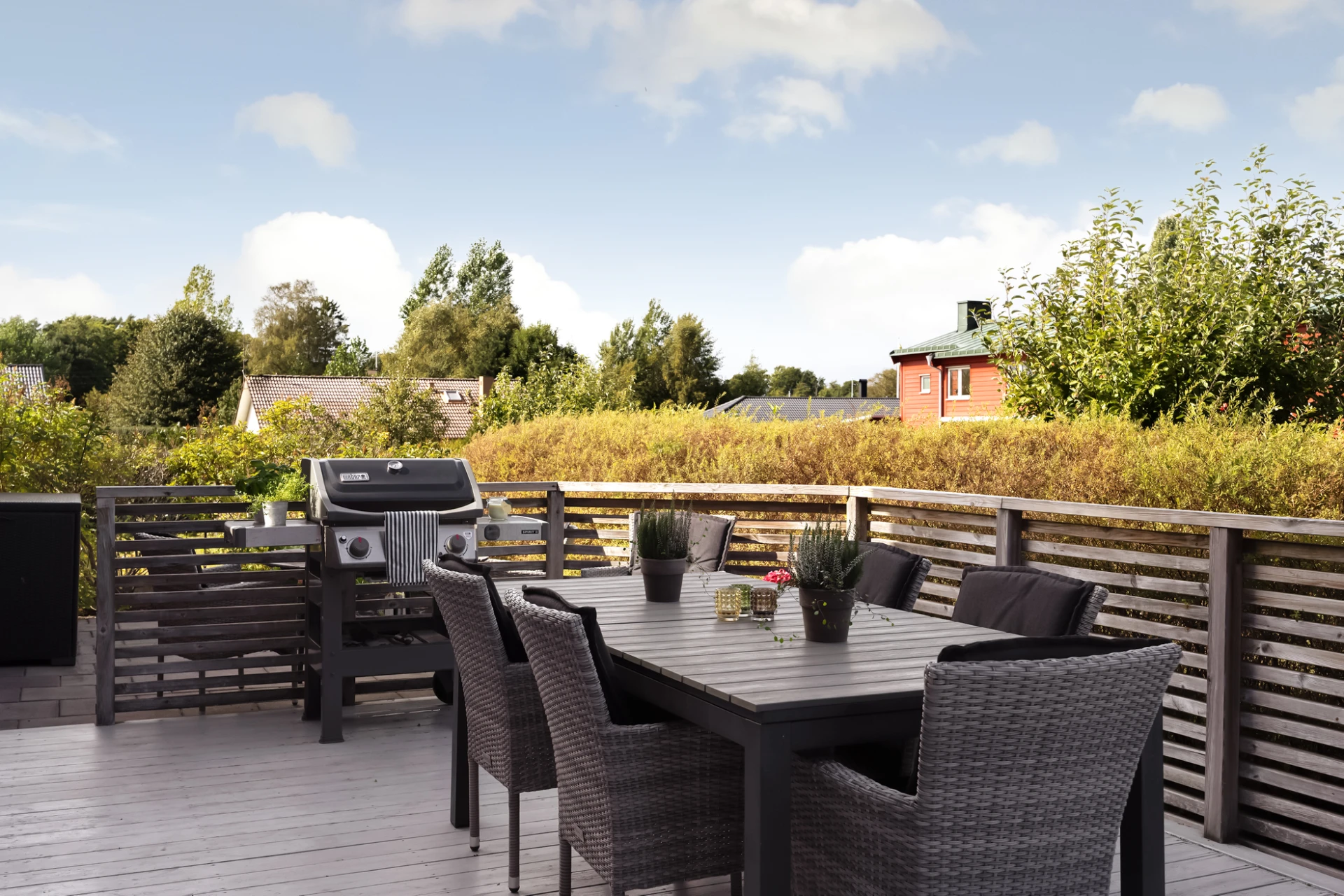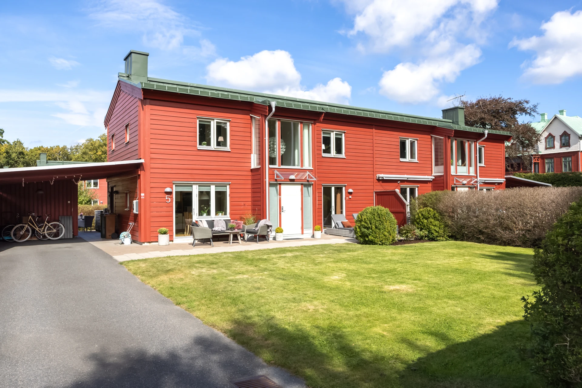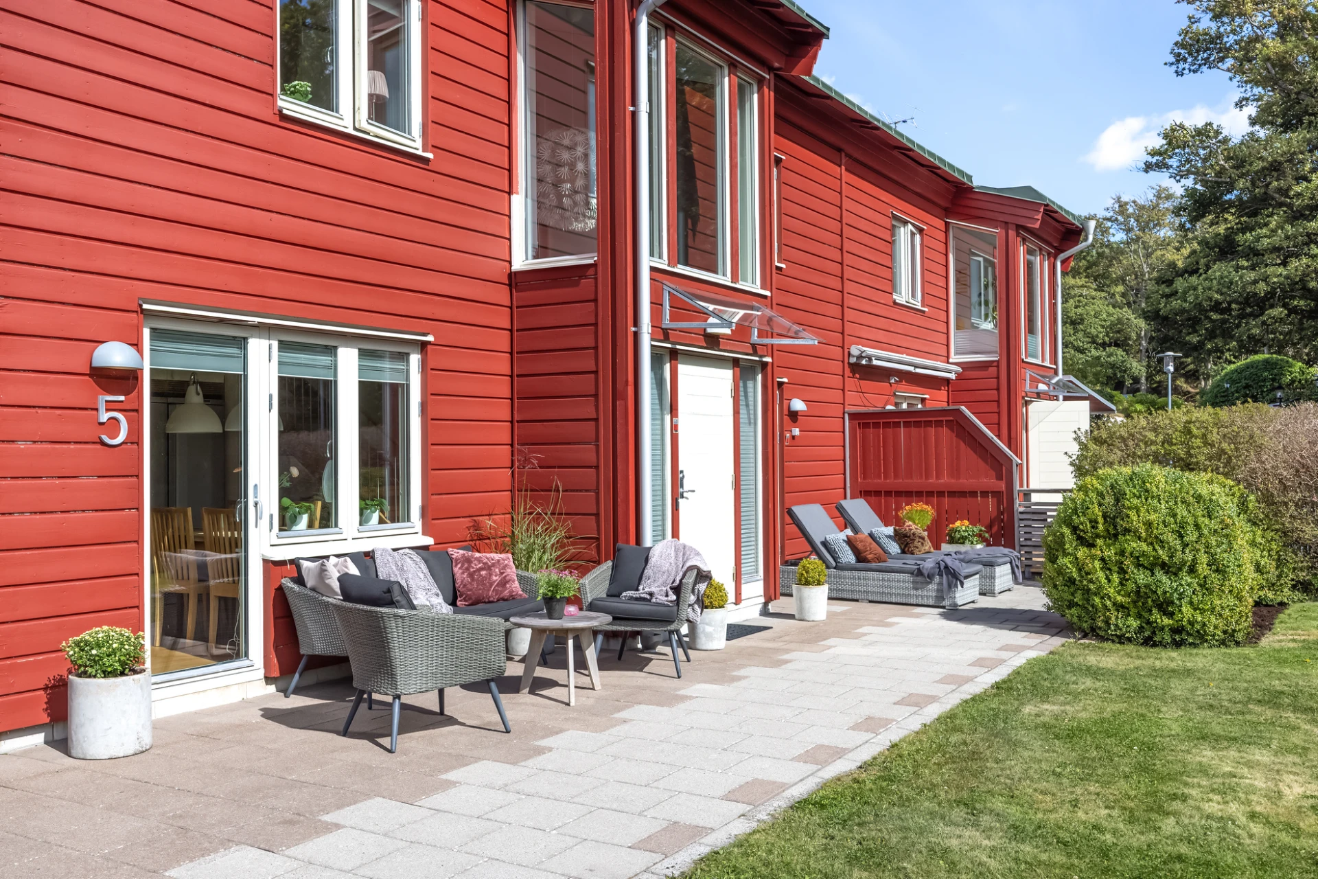 Ett stort och genomgående rum, perfekt för sociala umgängen men också för lek och vardagsliv. Härifrån nås altanerna både på entrésidan och trädgårdssidan. På golvet ligger varm och skön ekparkett, väggarna är målade i vitt och bryts av med en fondtapet. Dimbara spotlights ger flexibel belysning.