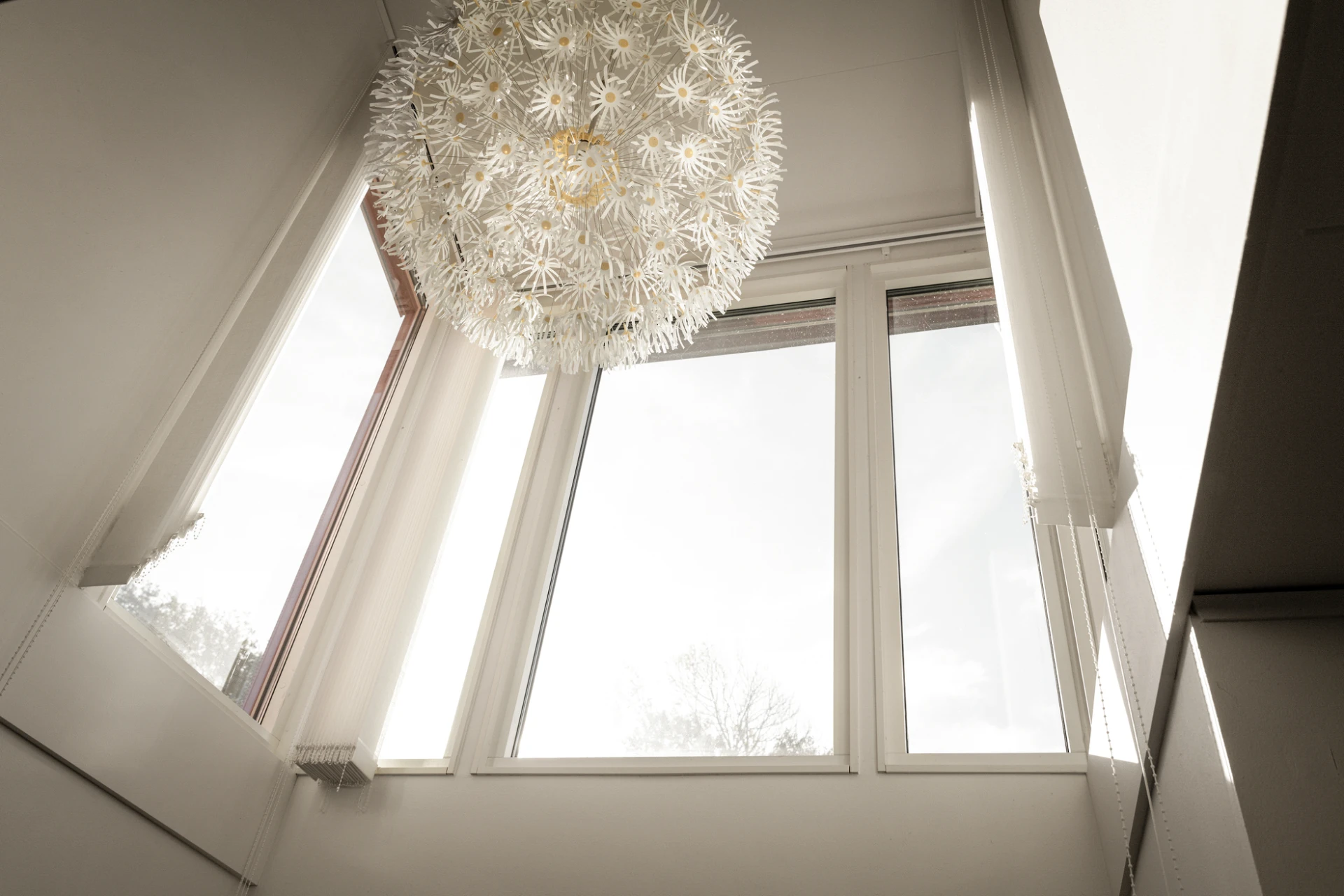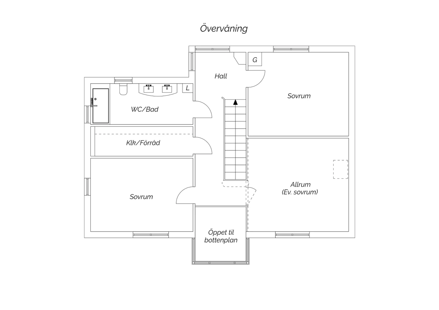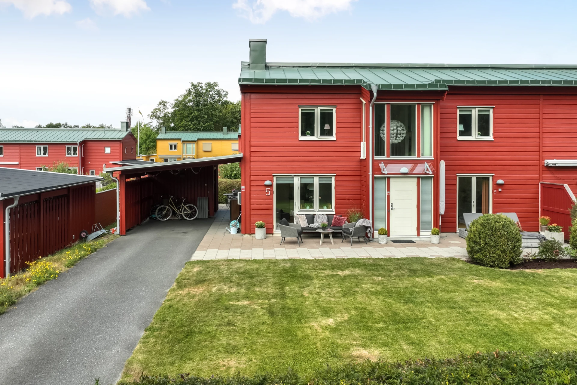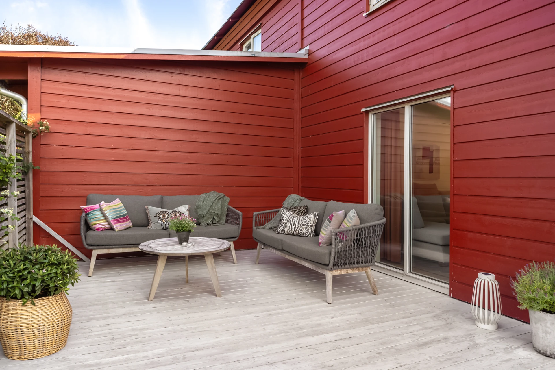 Ett stort och genomgående rum, perfekt för sociala umgängen men också för lek och vardagsliv. Härifrån nås altanerna både på entrésidan och trädgårdssidan. På golvet ligger varm och skön ekparkett, väggarna är målade i vitt och bryts av med en fondtapet. Dimbara spotlights ger flexibel belysning.