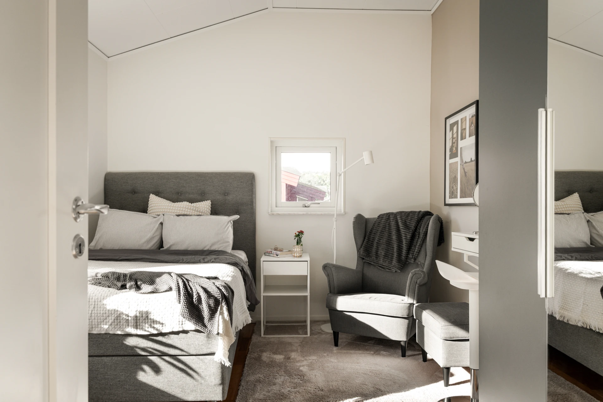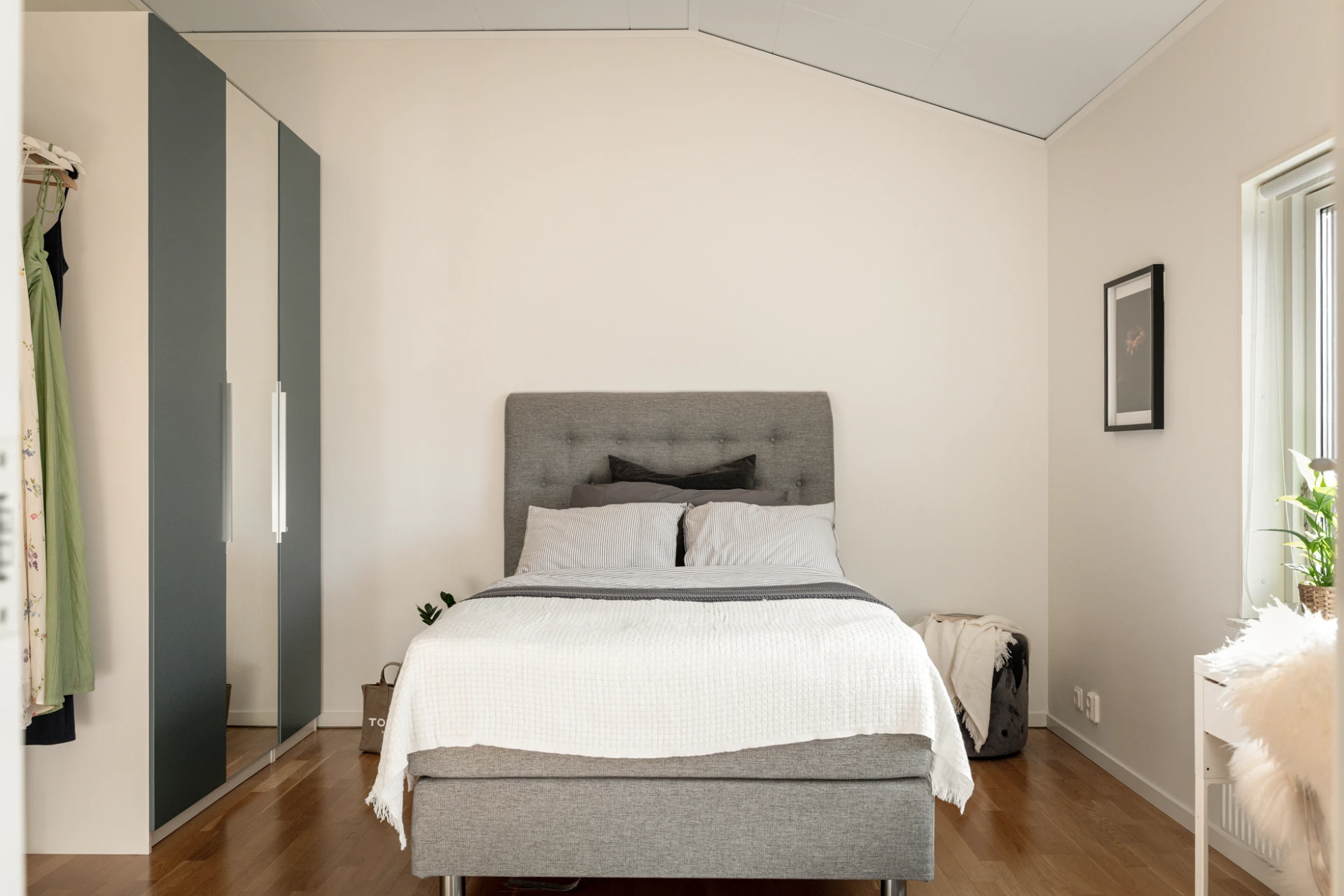 Ekparkett på golvet och vita väggar med fondtapet i beige ton. Förvaringen sker i två garderober.