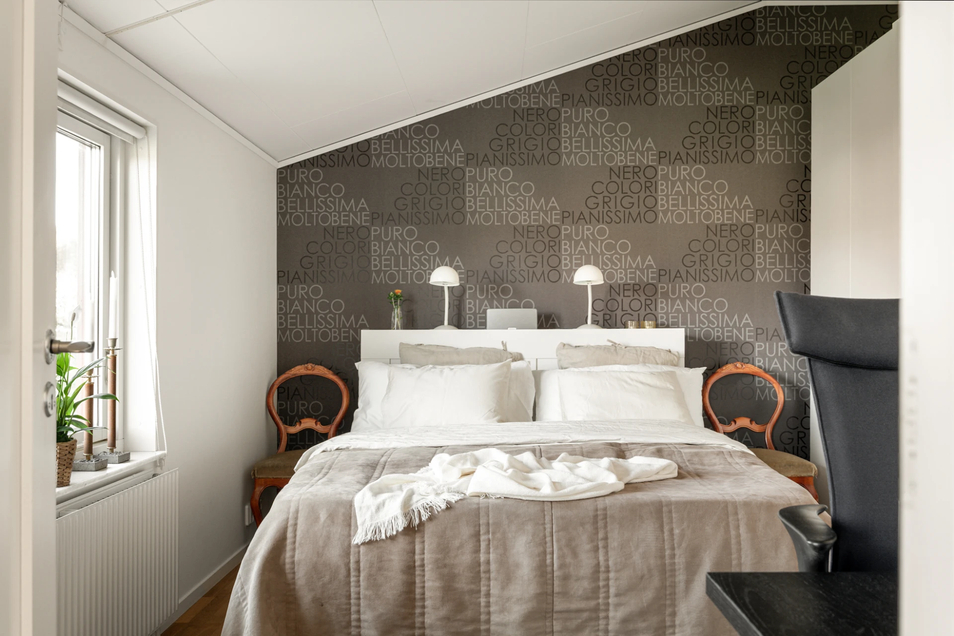 Ekparkett på golvet och vita väggar som bryts av med en fondtapet i brun ton. Förvaring finns i garderob med skjutdörr.
