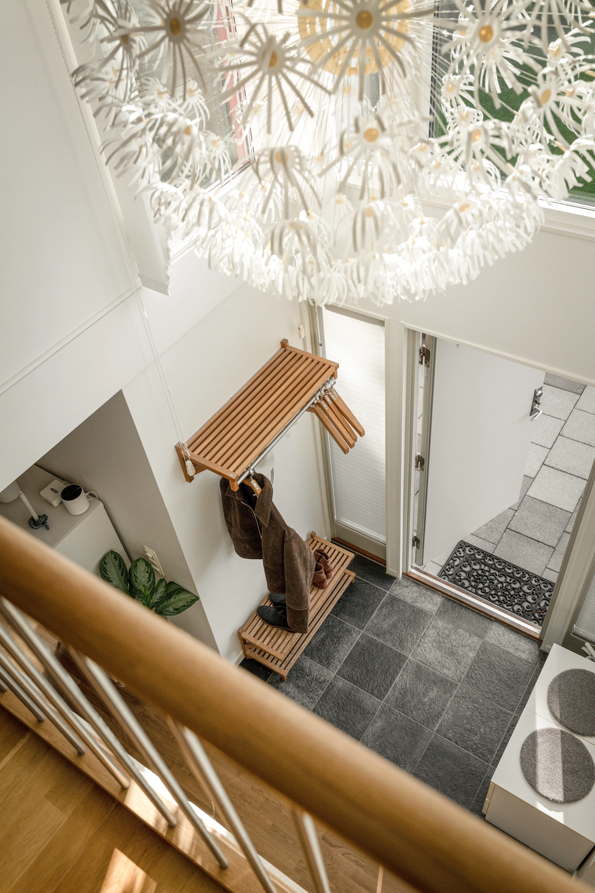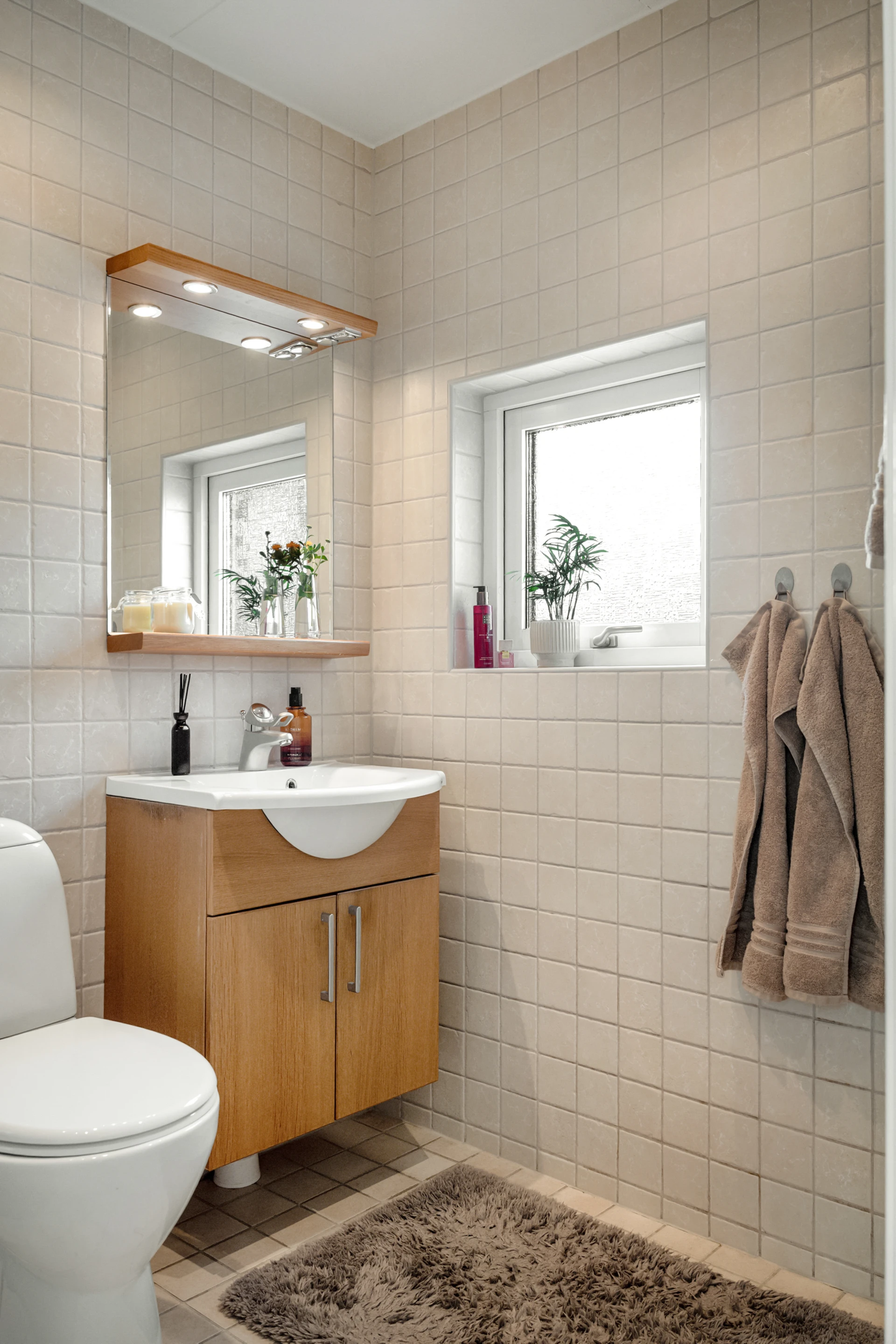 Praktisk och stilren klinker på golvet möter vita väggar. Golvvärmen ger ett skönt välkomnande, medan dimbara spotlights skapar både mysig stämning och god städbelysning.