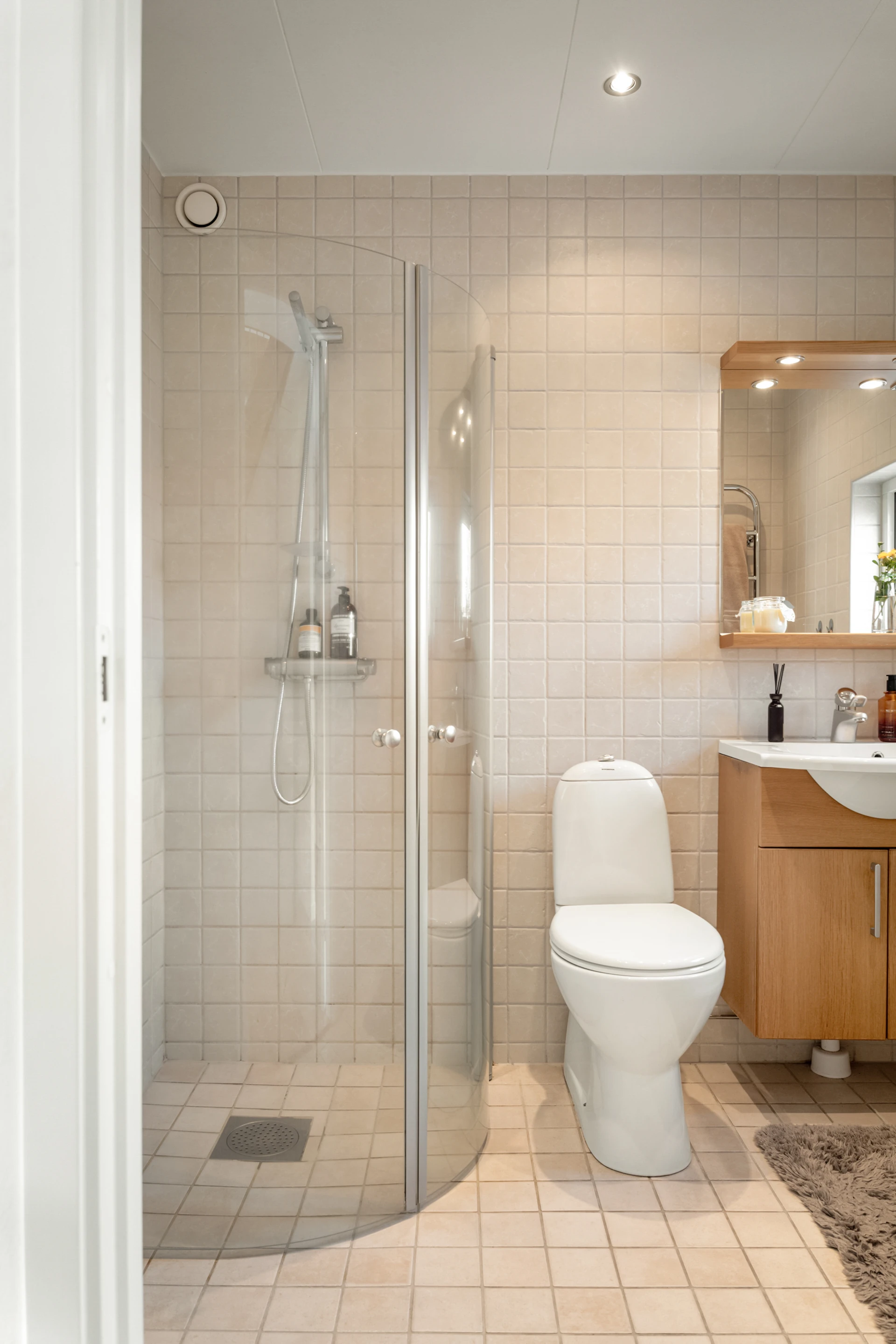 Helkaklat med klinkergolv. Väggarna går i beige och golvet i brunt. Golvvärme skapar en behaglig miljö. Utrustningen består av toalett, dusch, handfat med spegel samt handdukstork.
