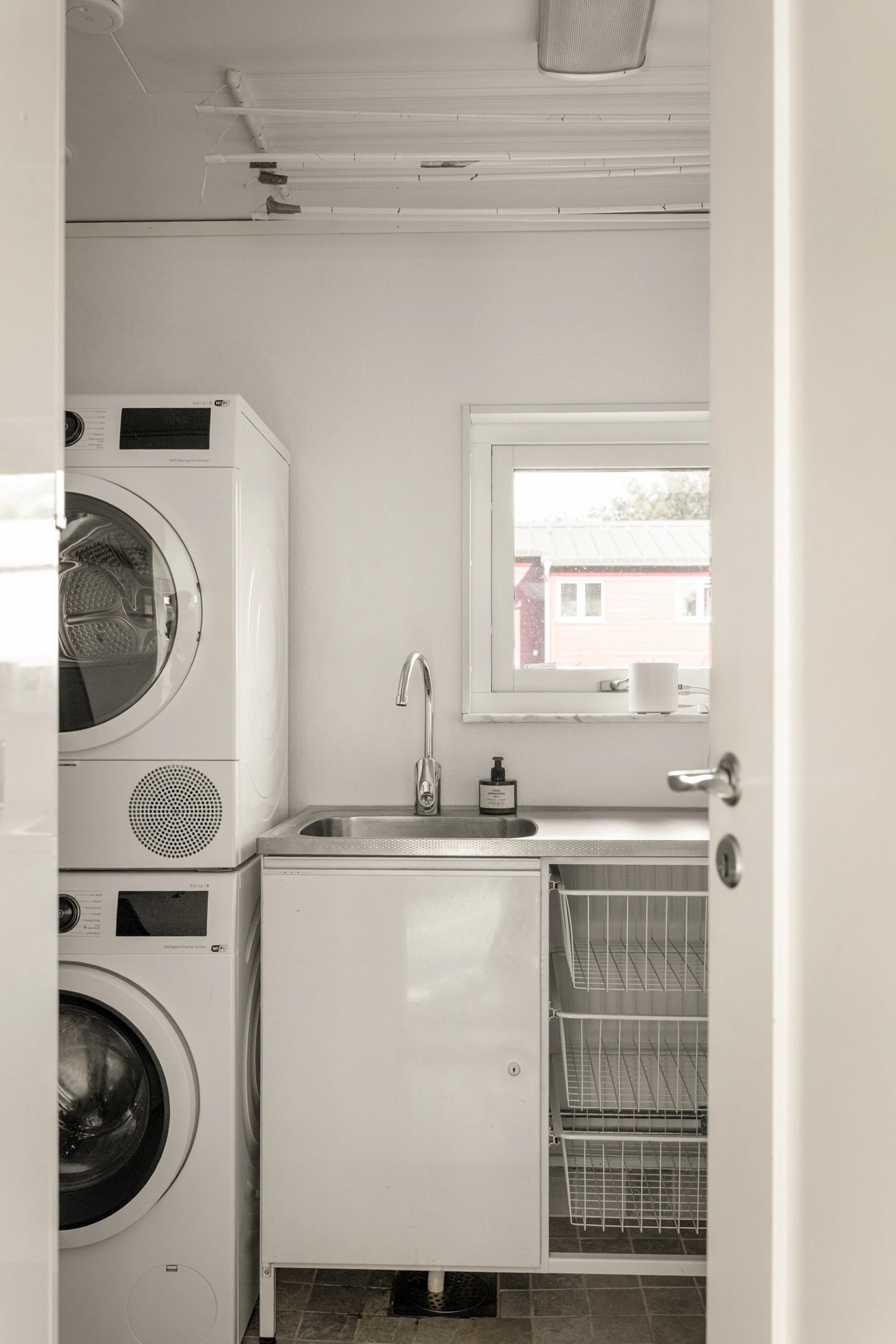 Praktiskt placerad intill köket med groventré. Här finns tvättpelare och tvättbänk.