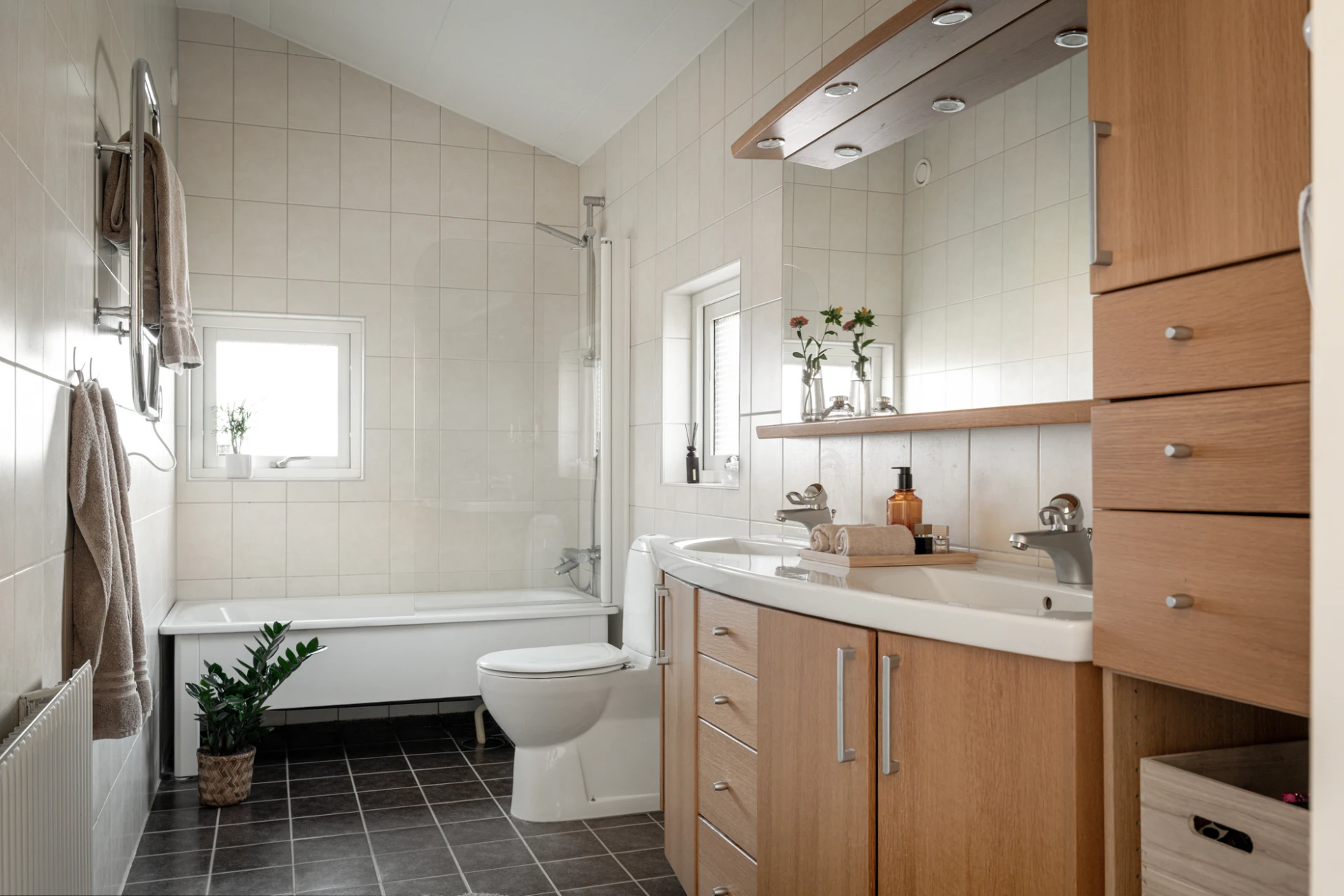 Helkaklat med klinkergolv. Väggarna går i beige och golvet i brunt. Golvvärme skapar en trivsam miljö. Utrustningen består av toalett, badkar, handfat med spegel samt handdukstork.