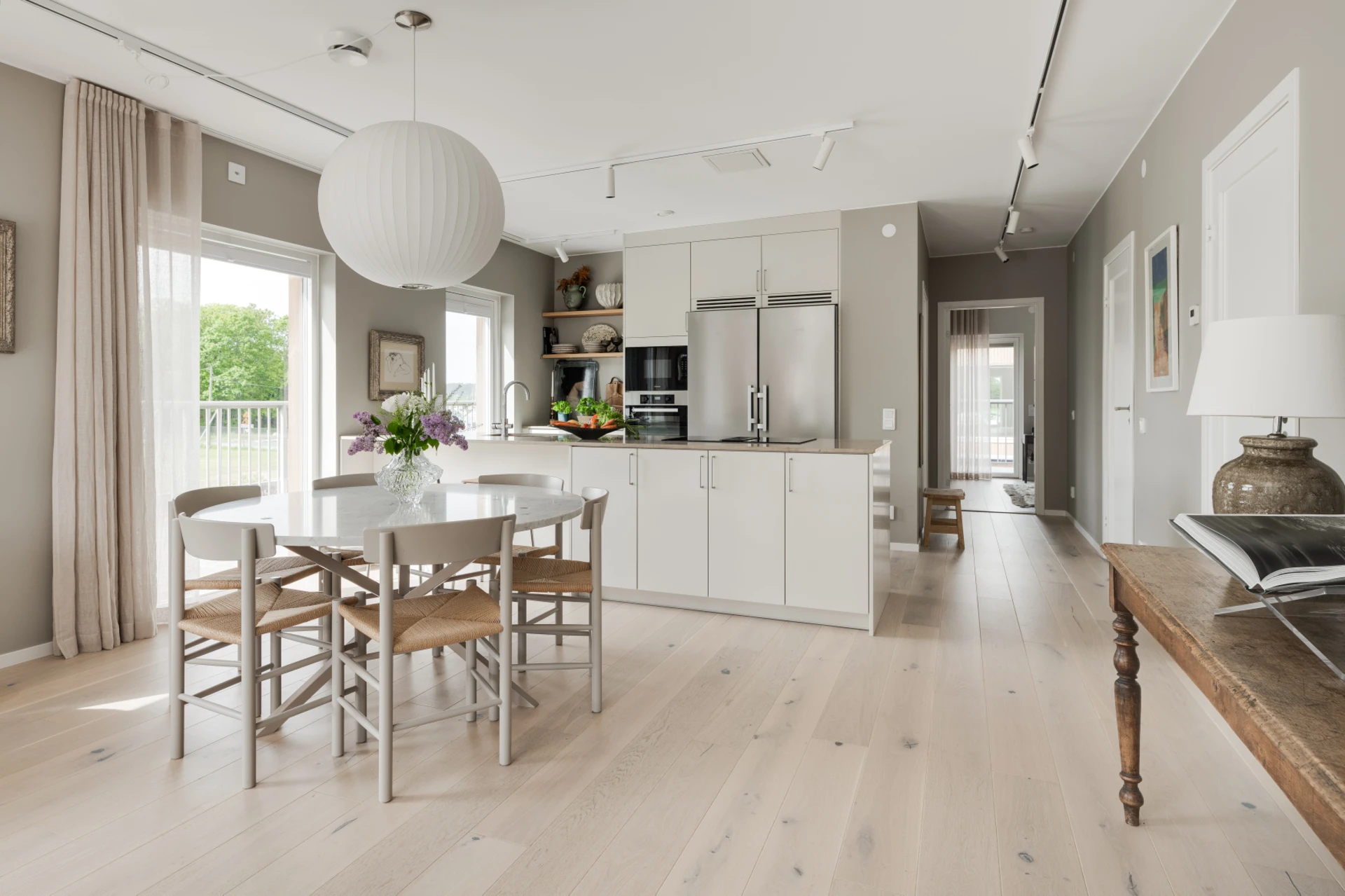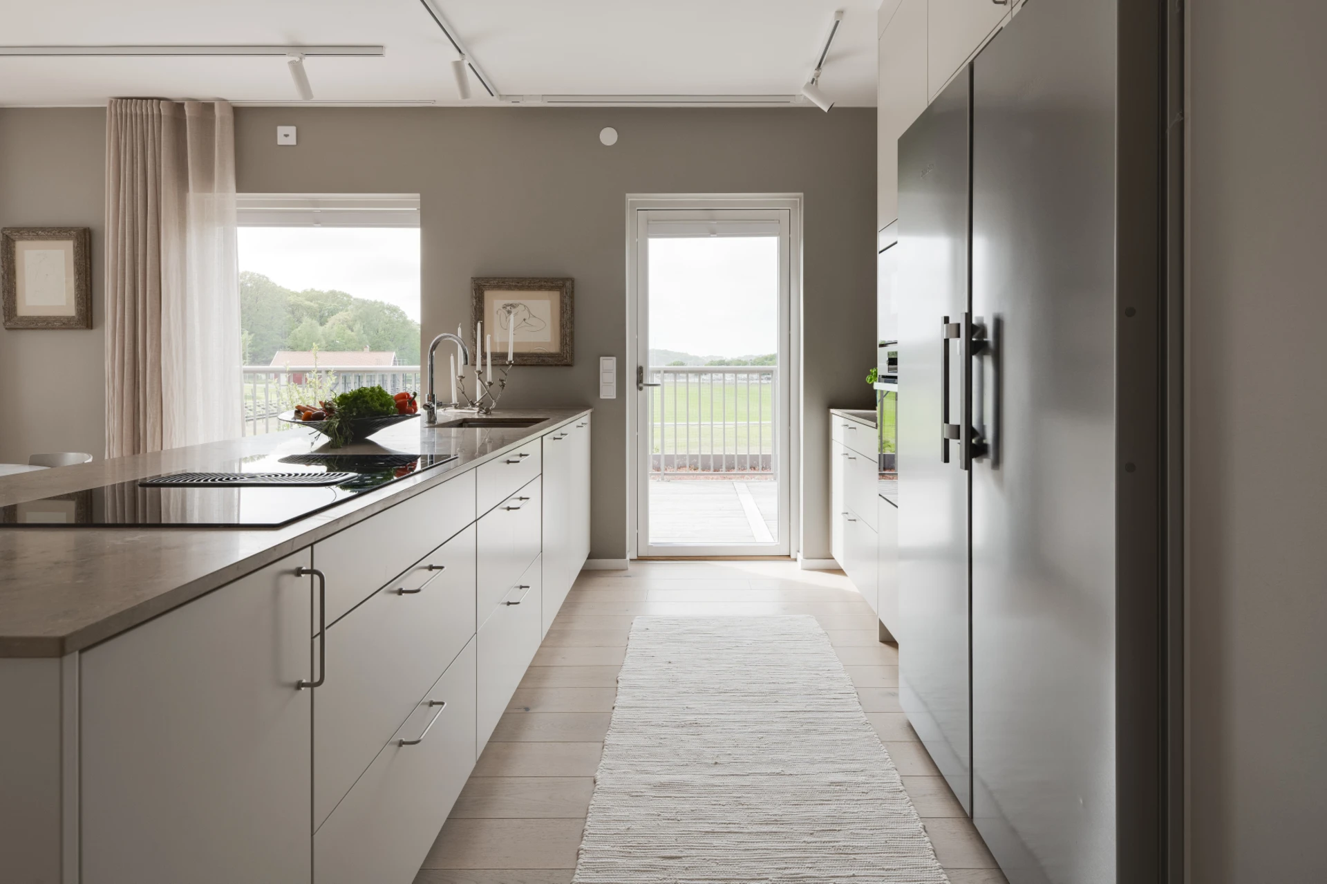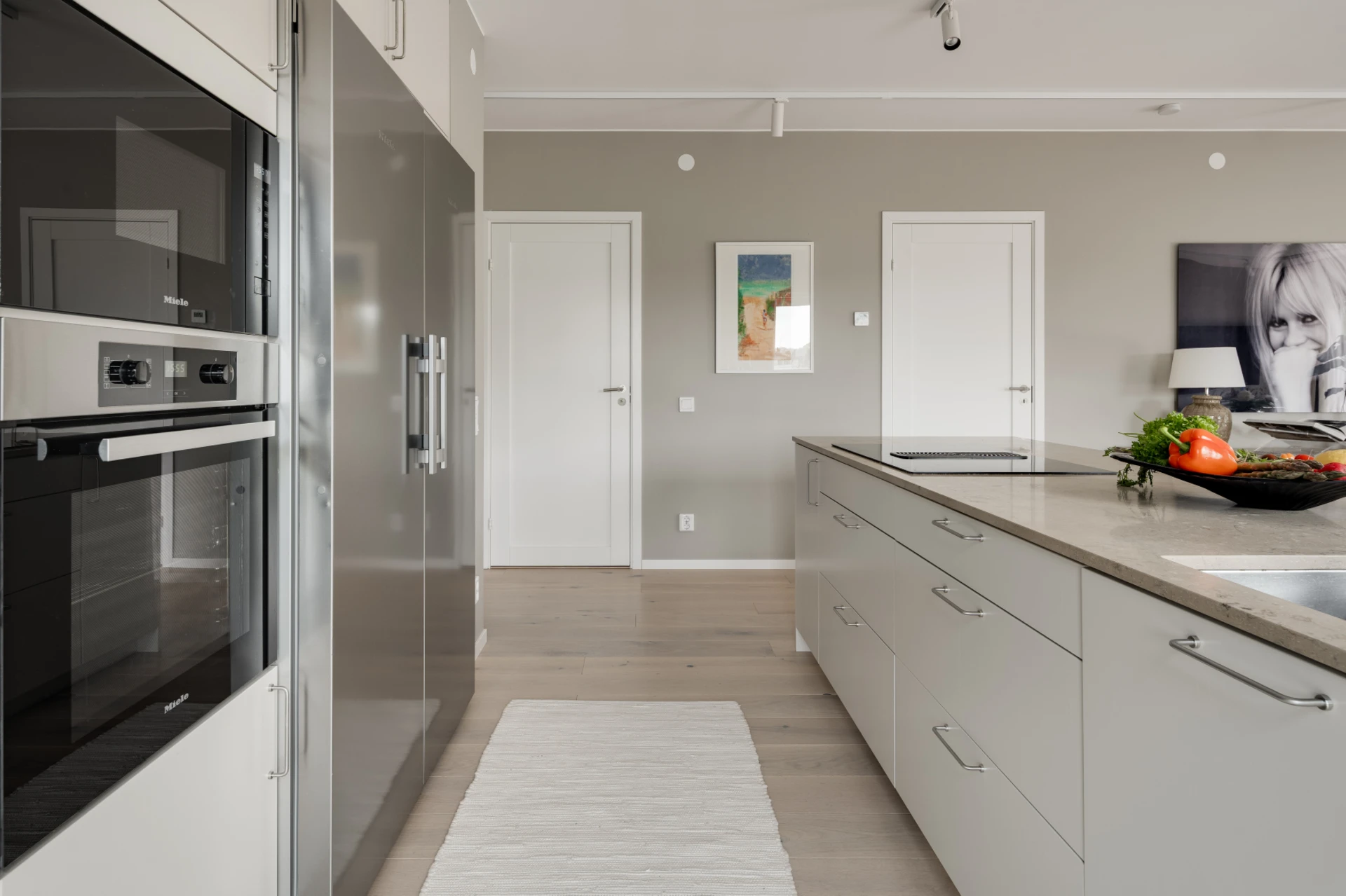 Köket med sina integrerade vitvaror och rostfria detaljer ger en stilren känsla och med vackra bänkskivor av tunn kalksten Jura Grey och maskinerna är i rostfritt från Miele. Här finner du en induktionshäll med inbygg köksfläkt från Thermex, hel kyl och frys, inbyggd ugn, micro samt en integrerad diskmaskin. Från köket leds du ut till soldäcket i västerläge.