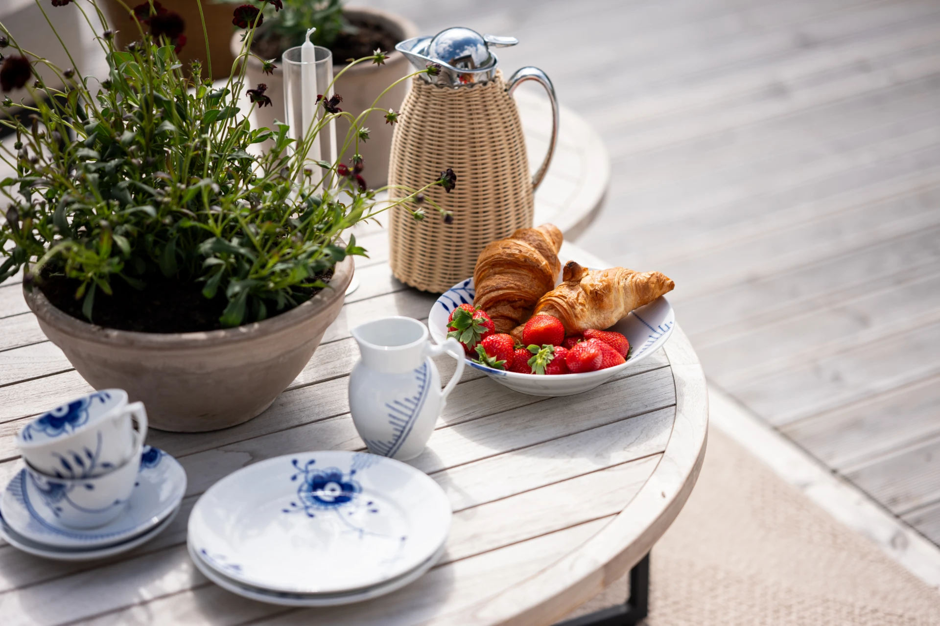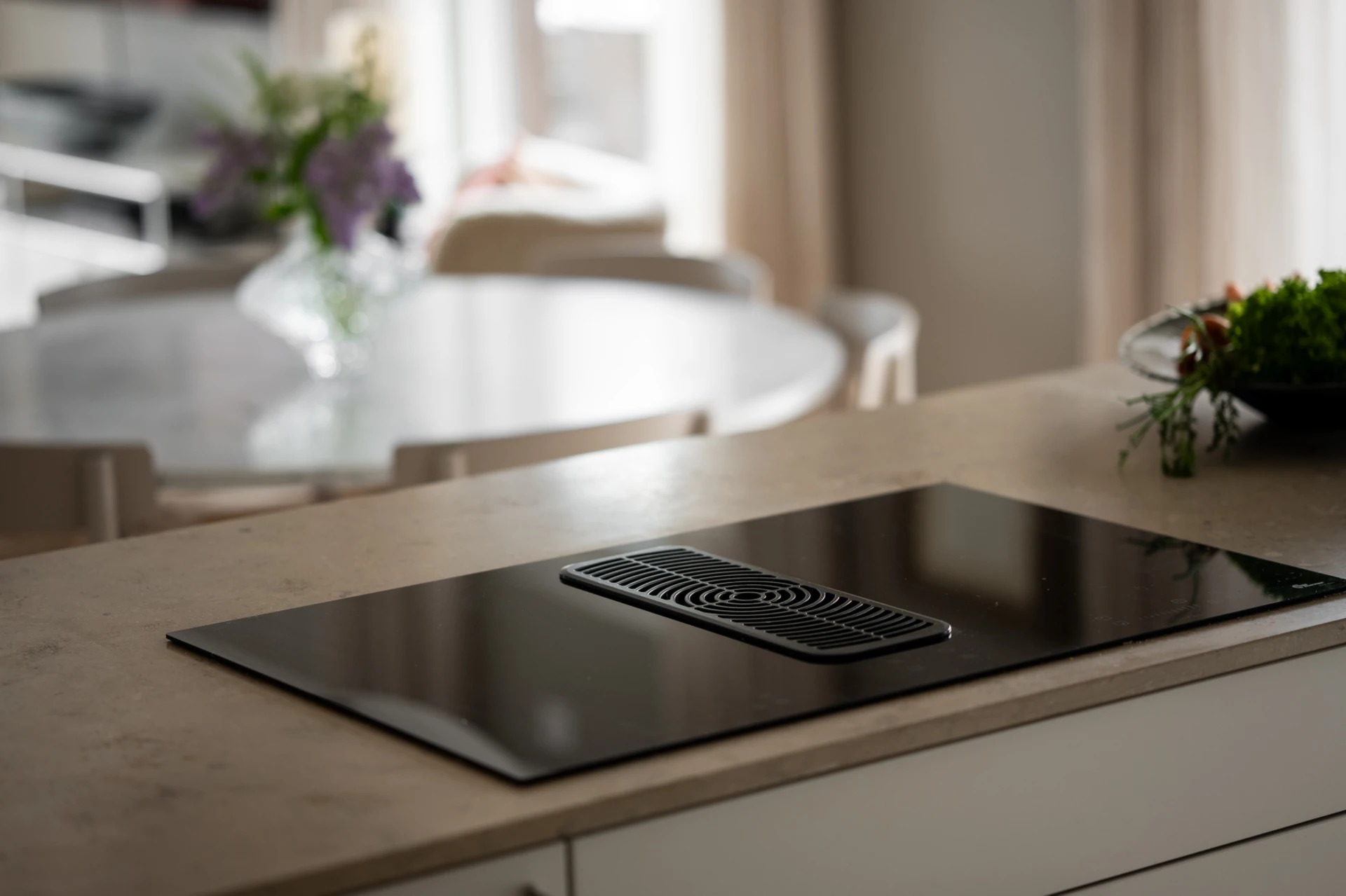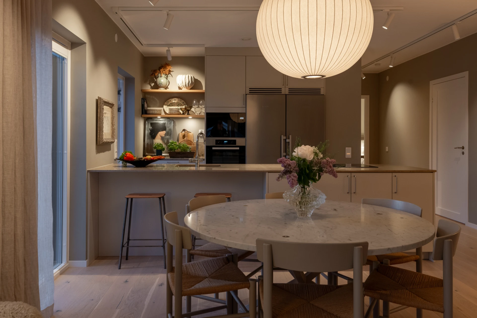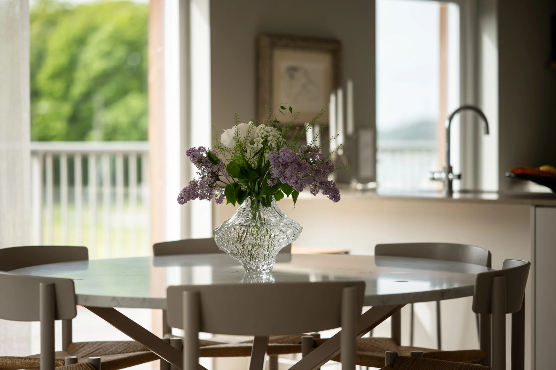 Köket med sina integrerade vitvaror och rostfria detaljer ger en stilren känsla och med vackra bänkskivor av tunn kalksten Jura Grey och maskinerna är i rostfritt från Miele. Här finner du en induktionshäll med inbygg köksfläkt från Thermex, hel kyl och frys, inbyggd ugn, micro samt en integrerad diskmaskin. Från köket leds du ut till soldäcket i västerläge.