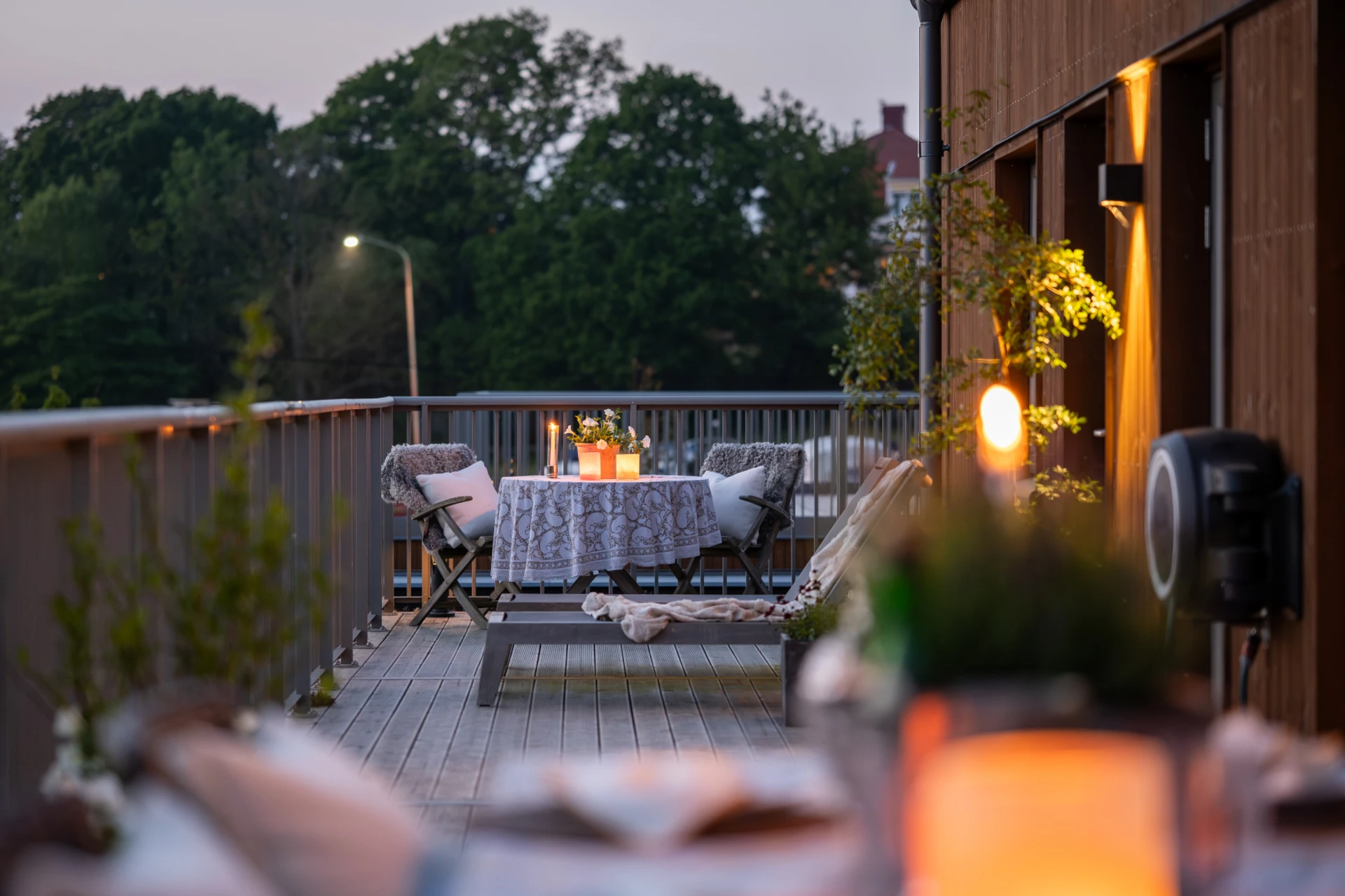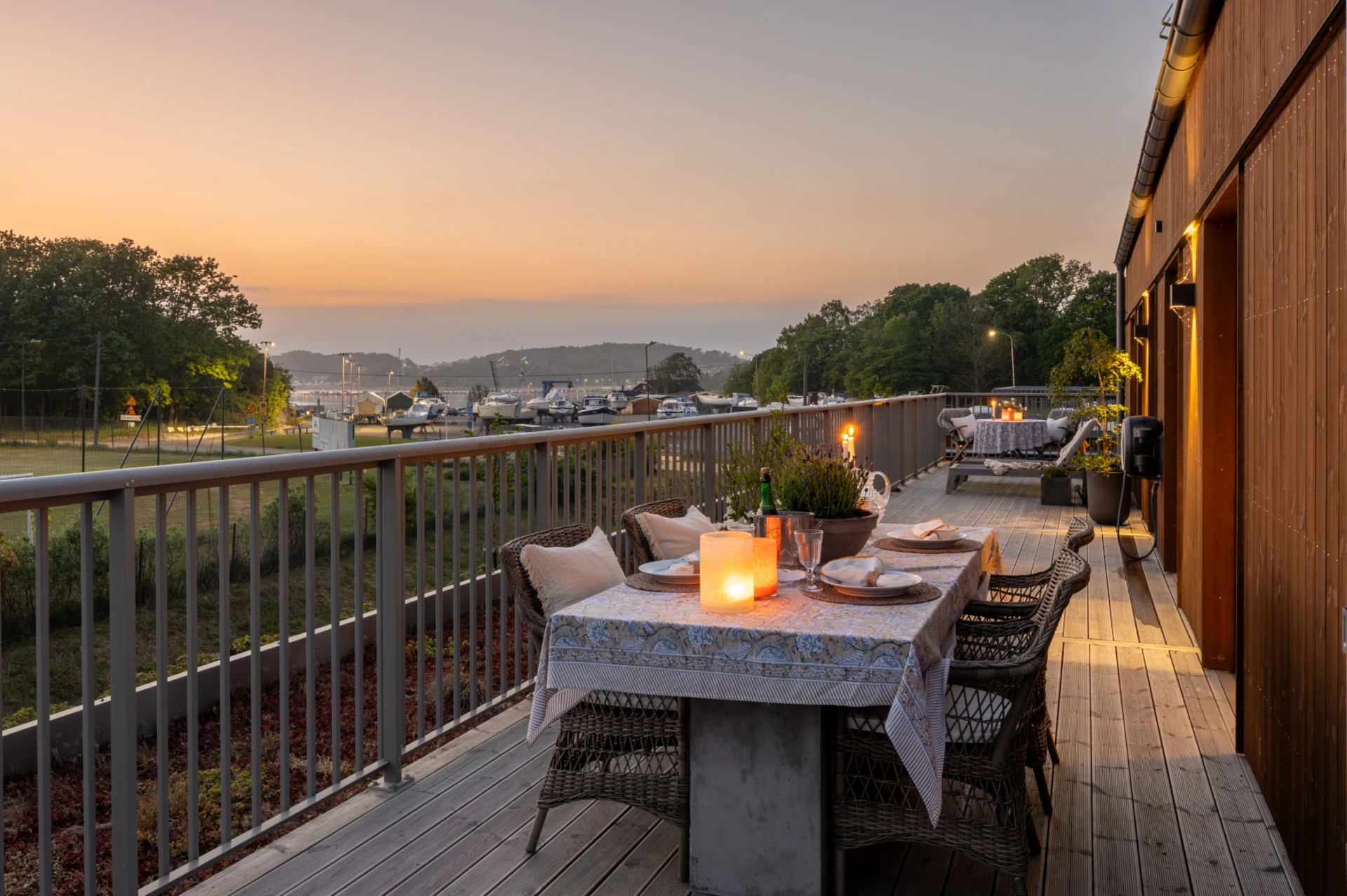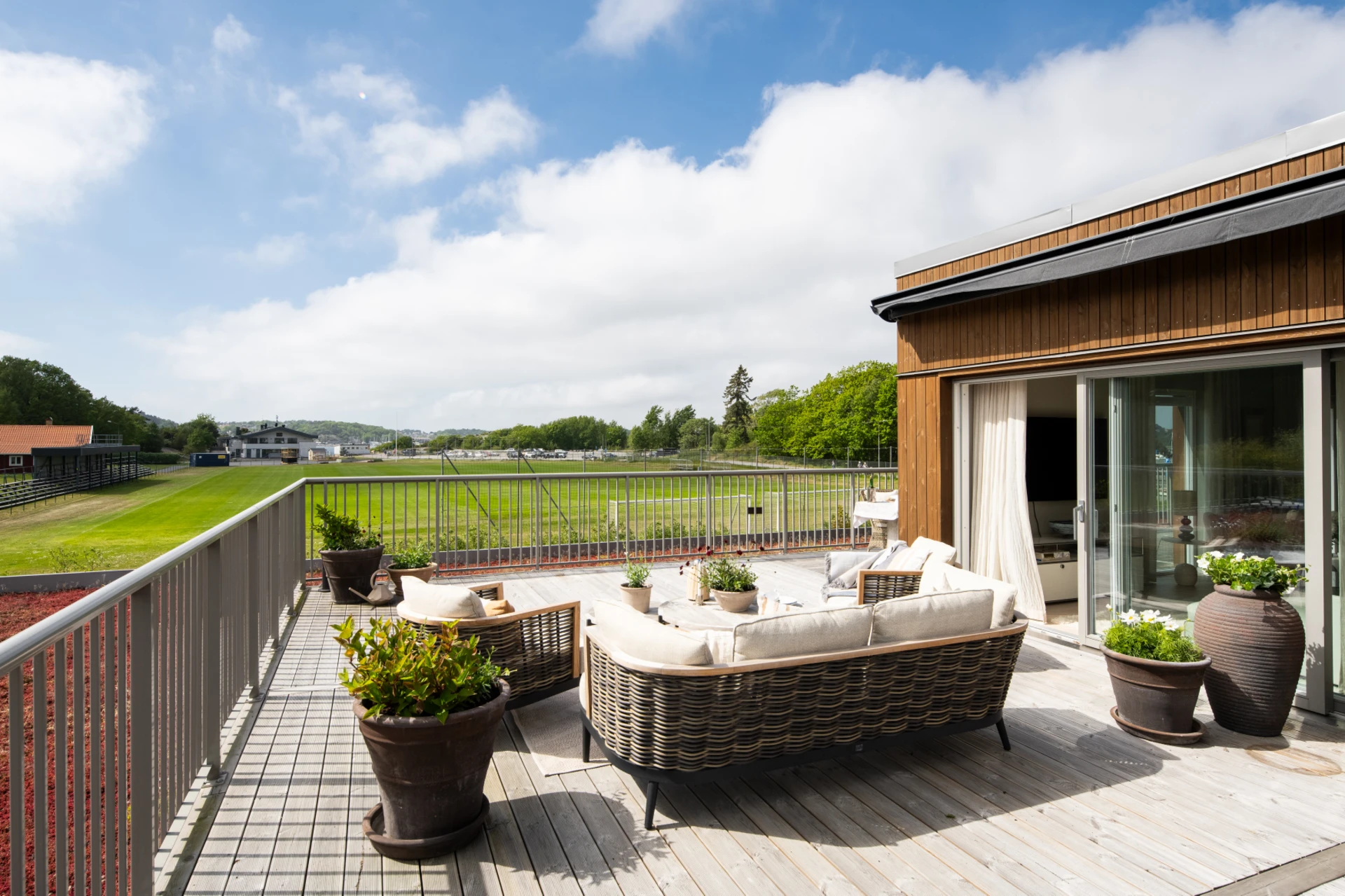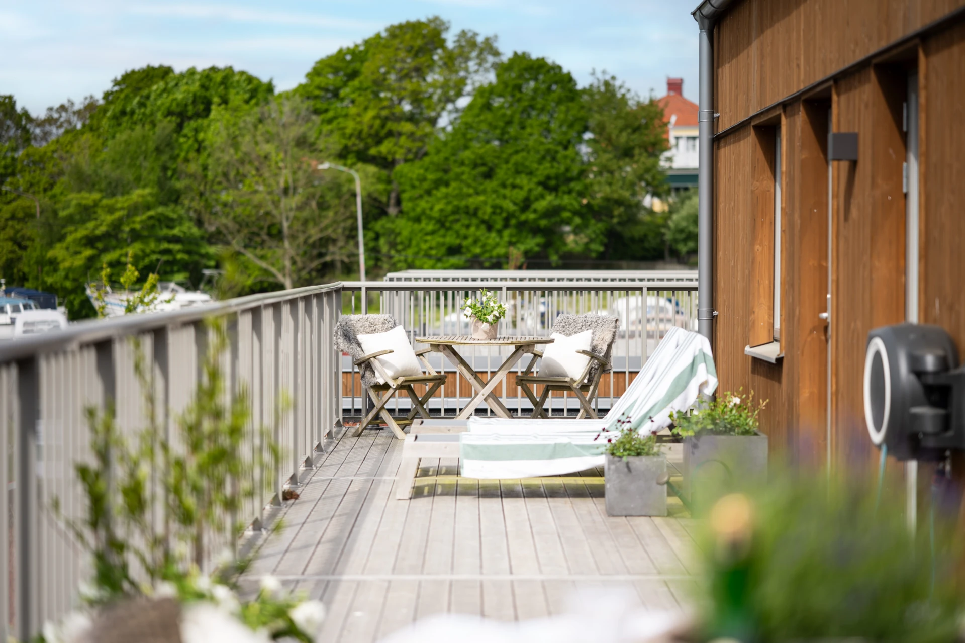 110 kvm soldäck omgärdar våningen i söder, väster och norrläge. Stor markis och belysning runt våningen.