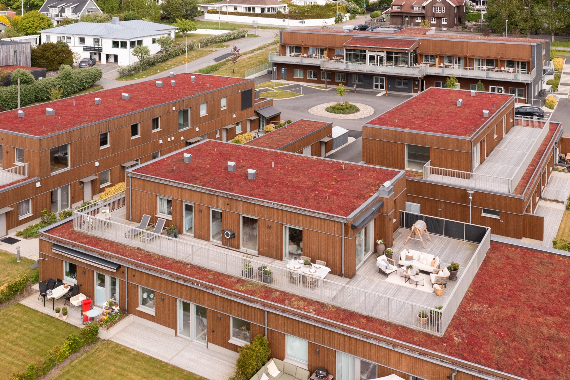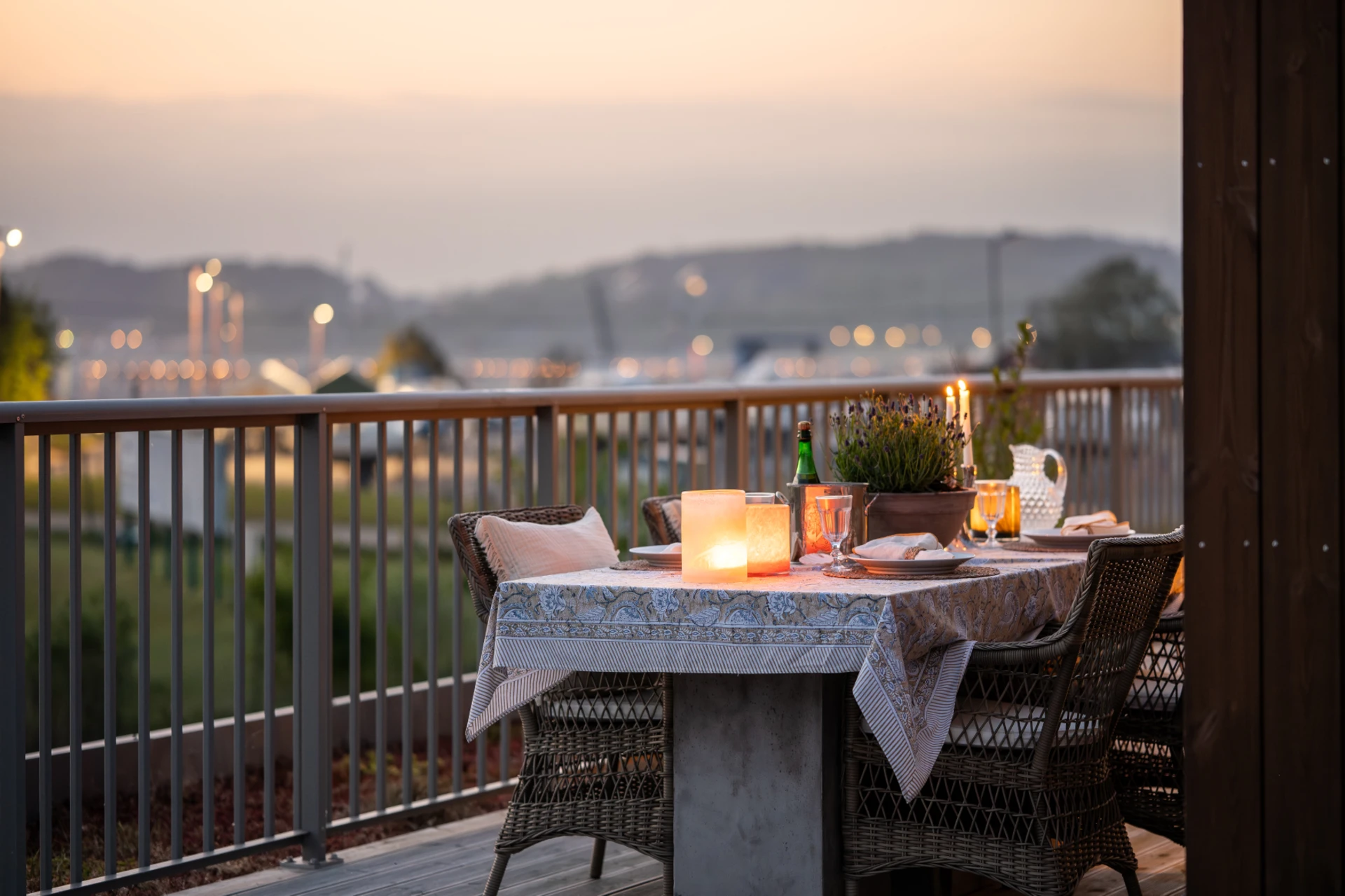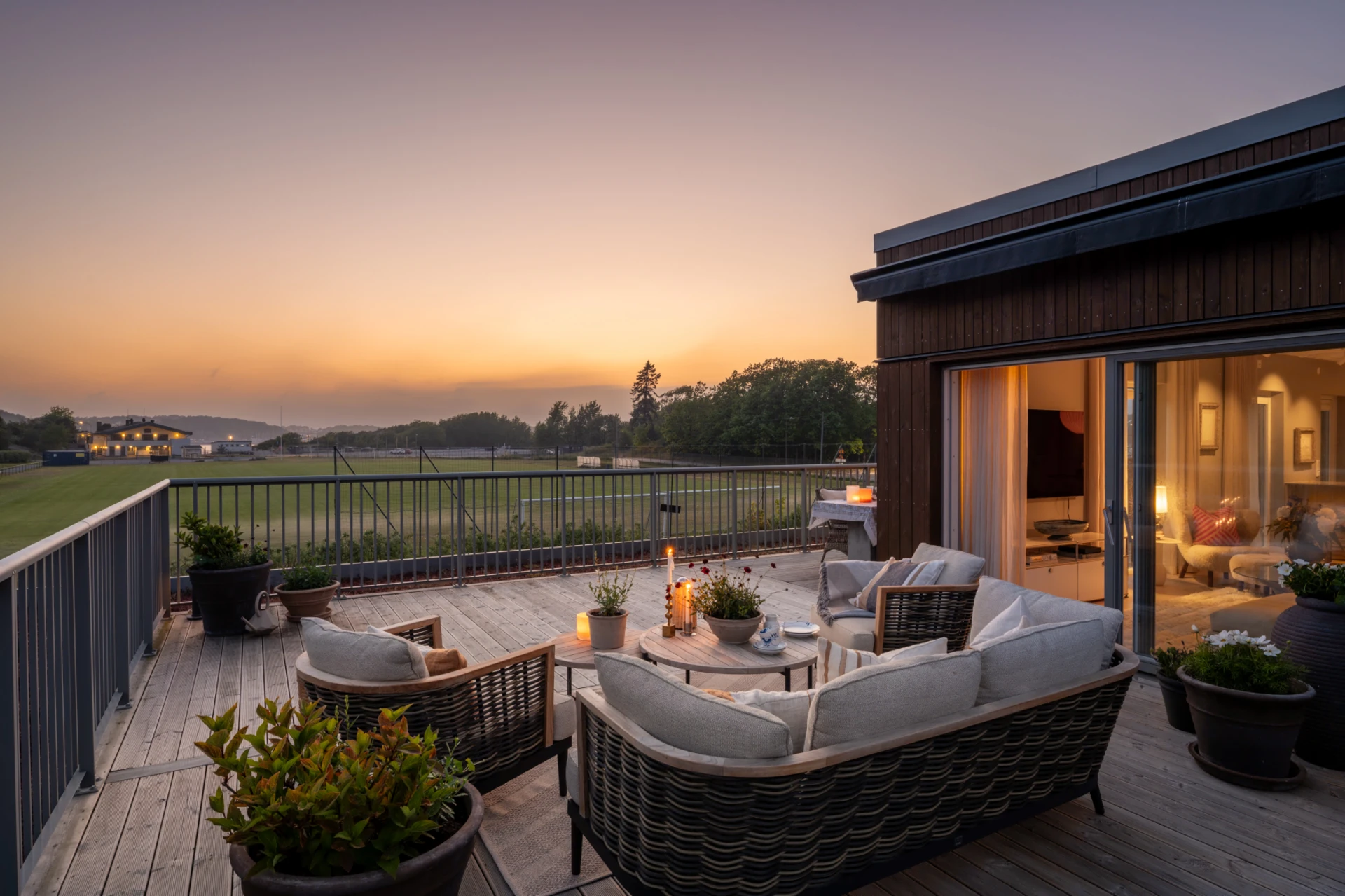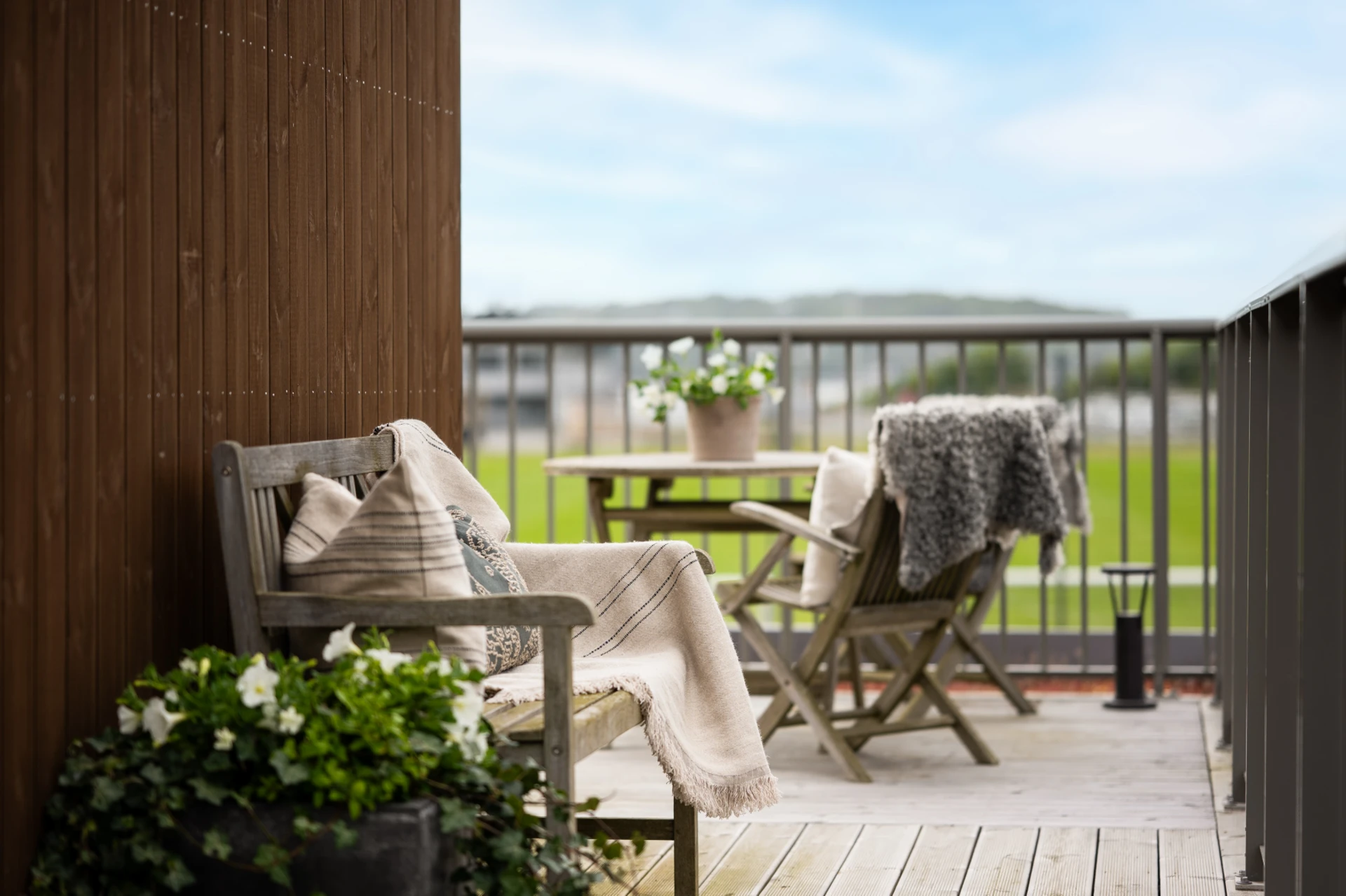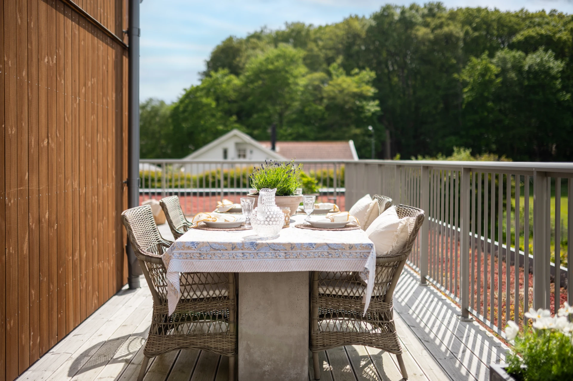 110 kvm soldäck omgärdar våningen i söder, väster och norrläge. Stor markis och belysning runt våningen.