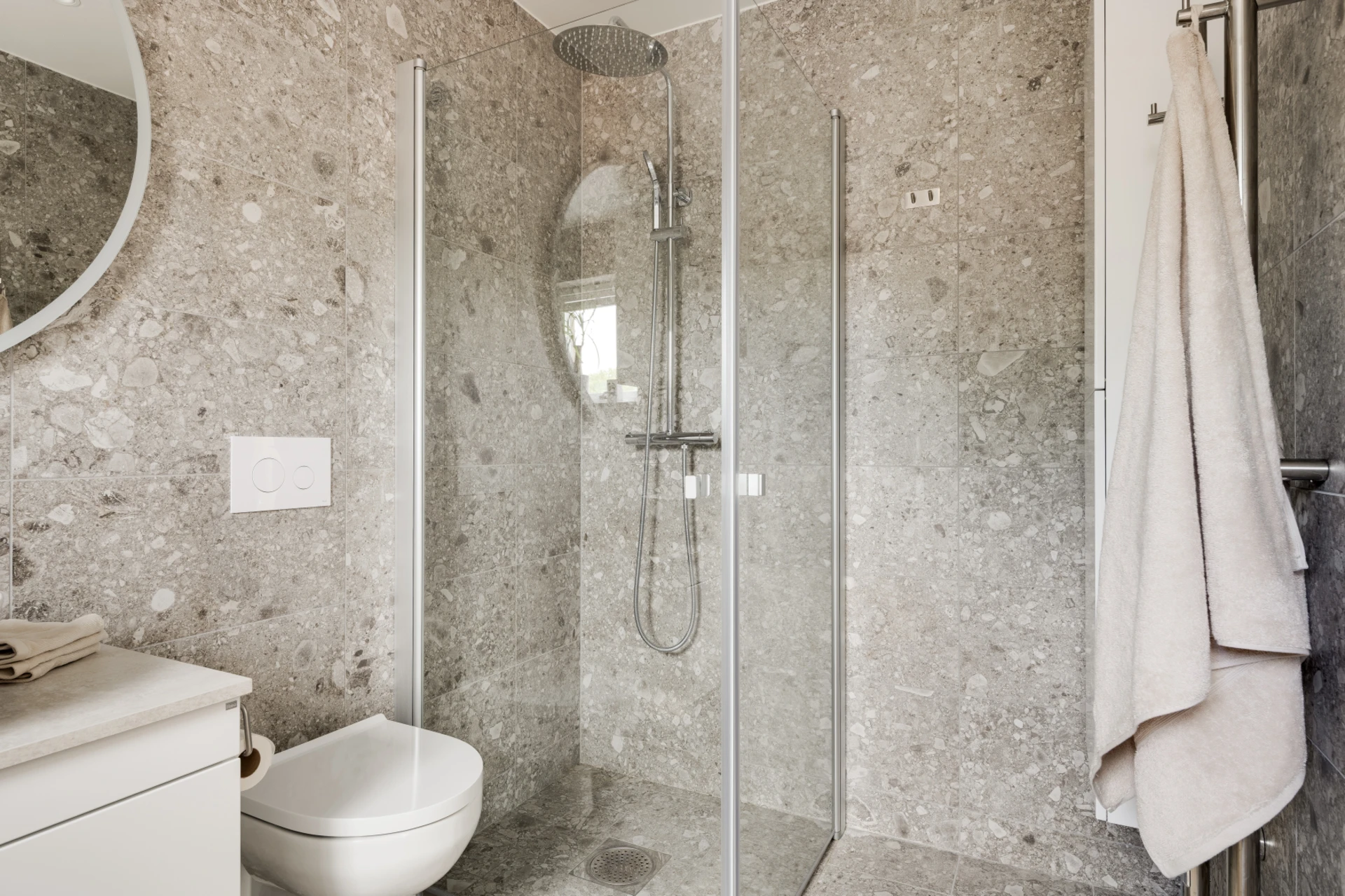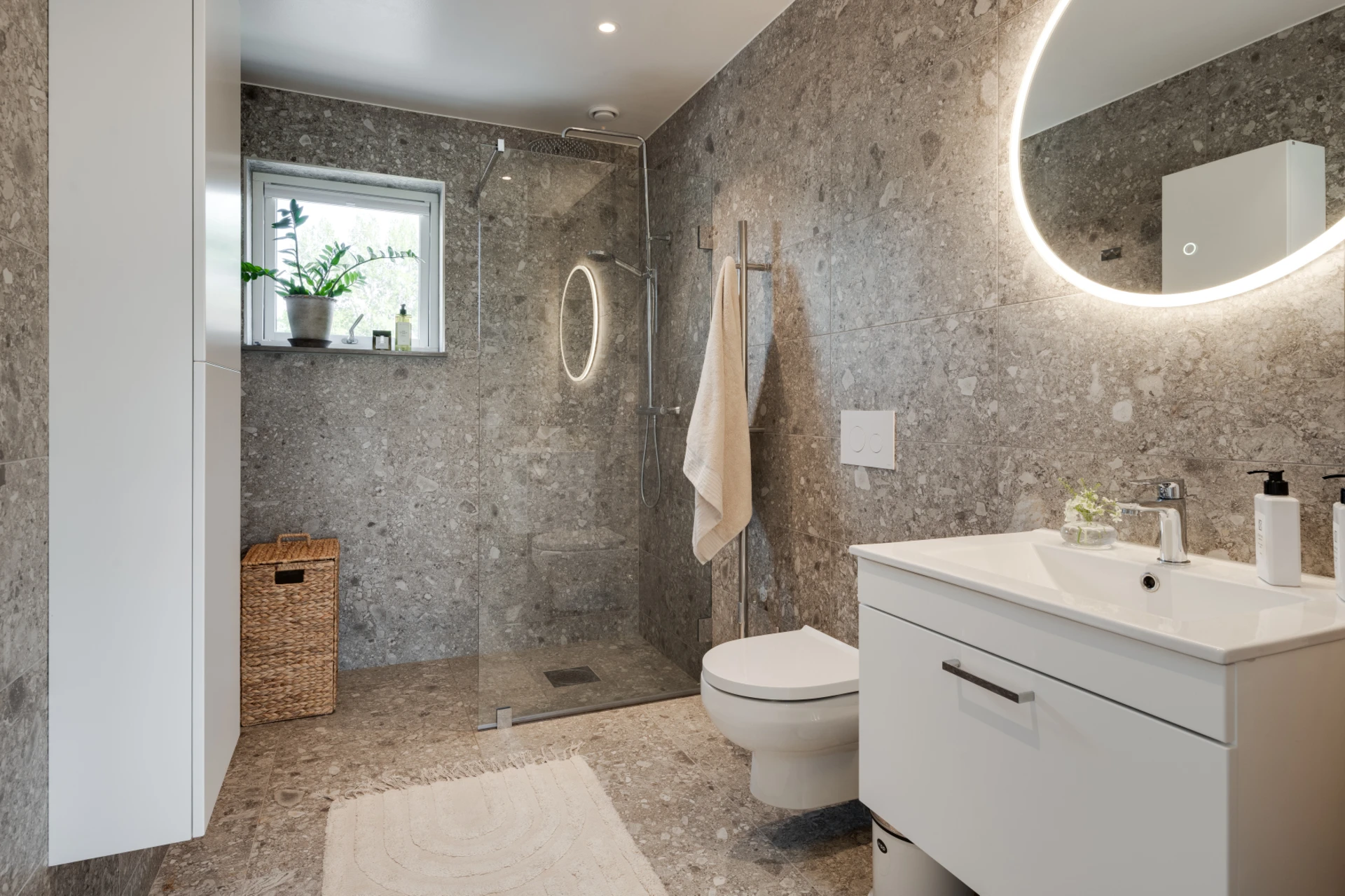 Badrum ligger intill sovrummet med toalett, handfat och glasad duschplats. Inrett med grå kakel och klinker samt dimbara spotlights. Fönster.