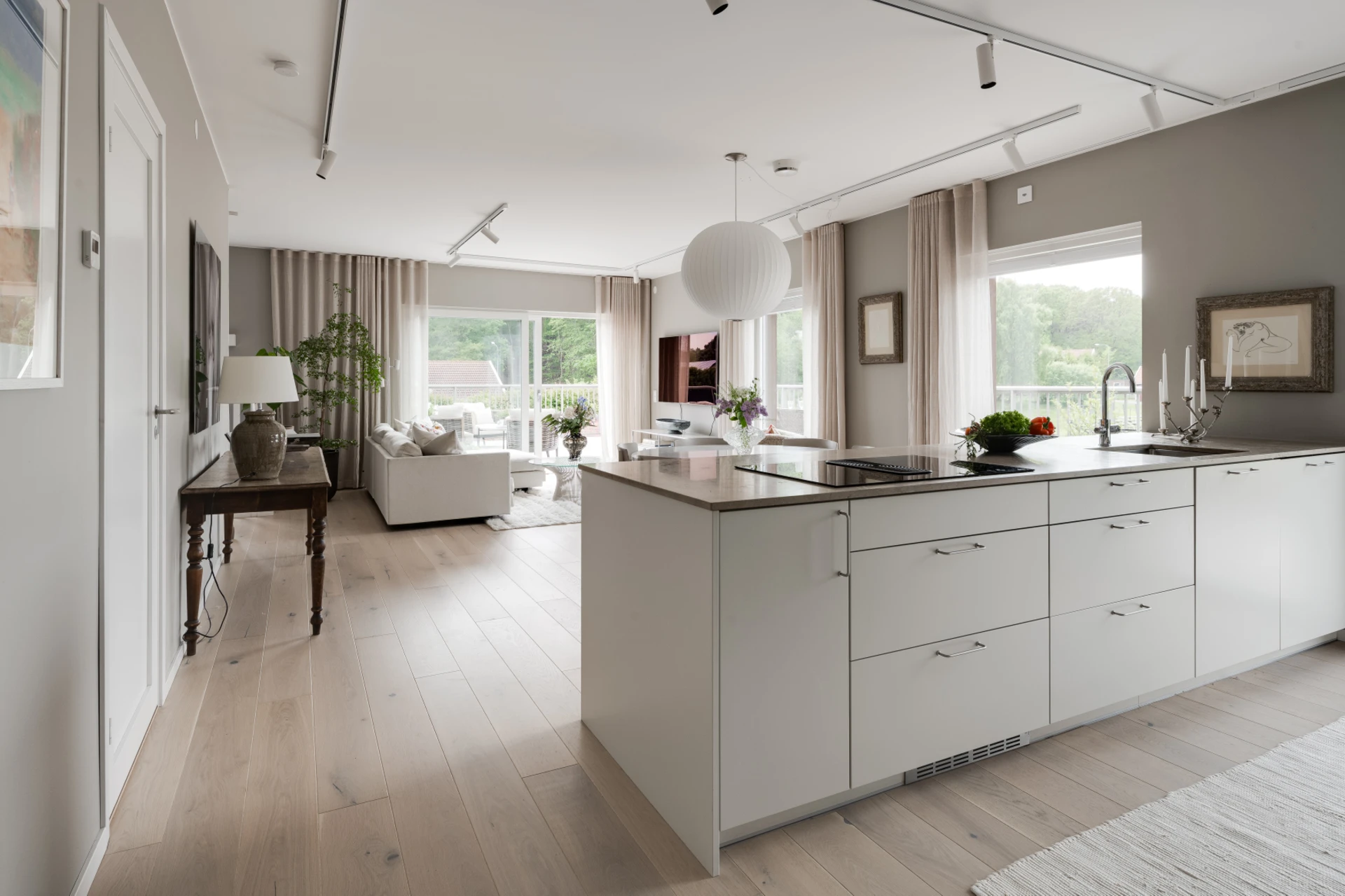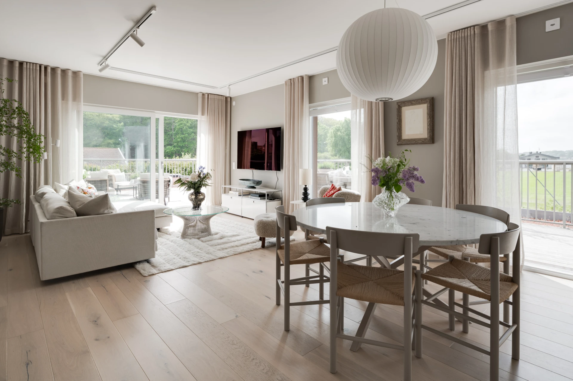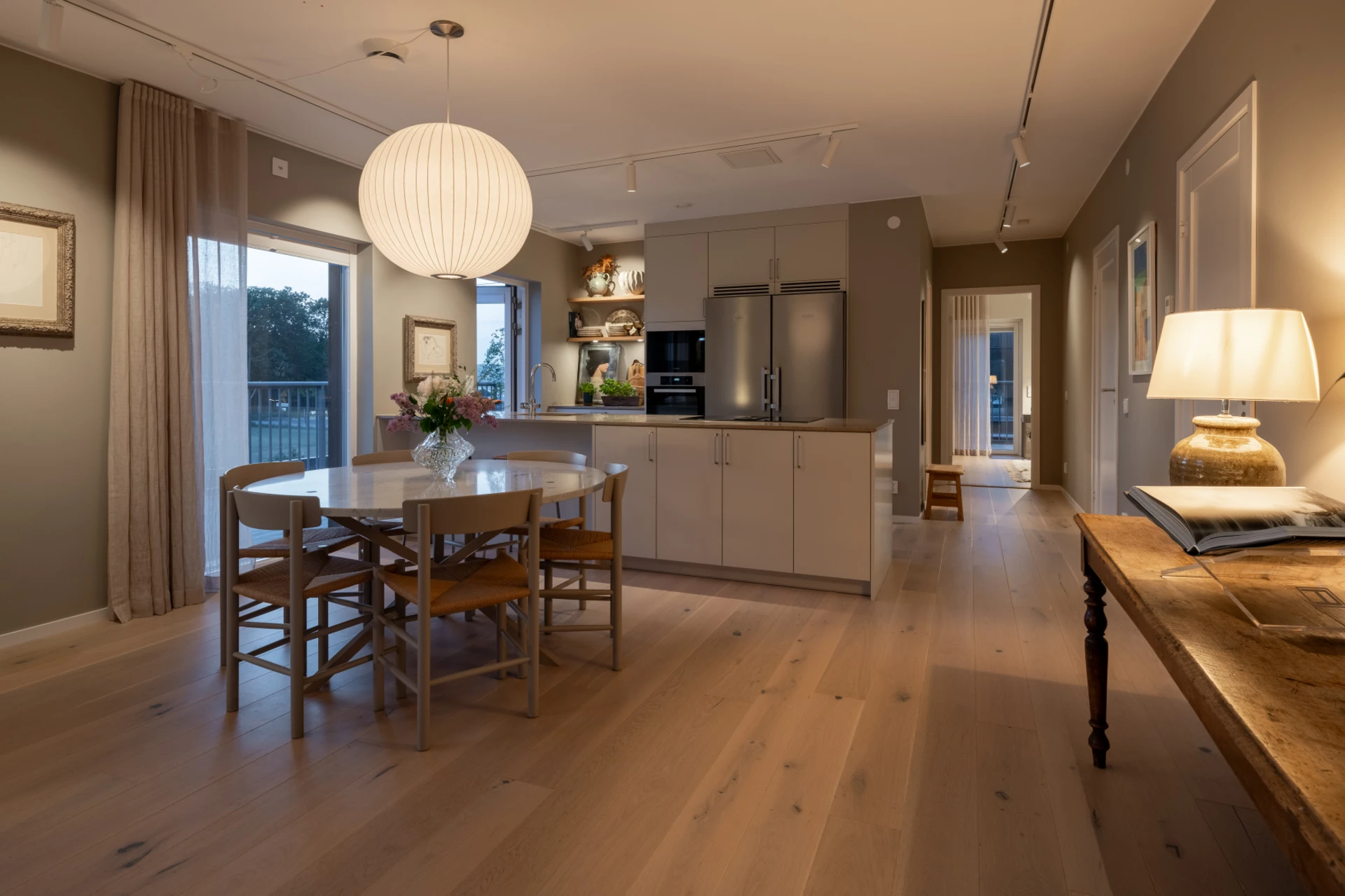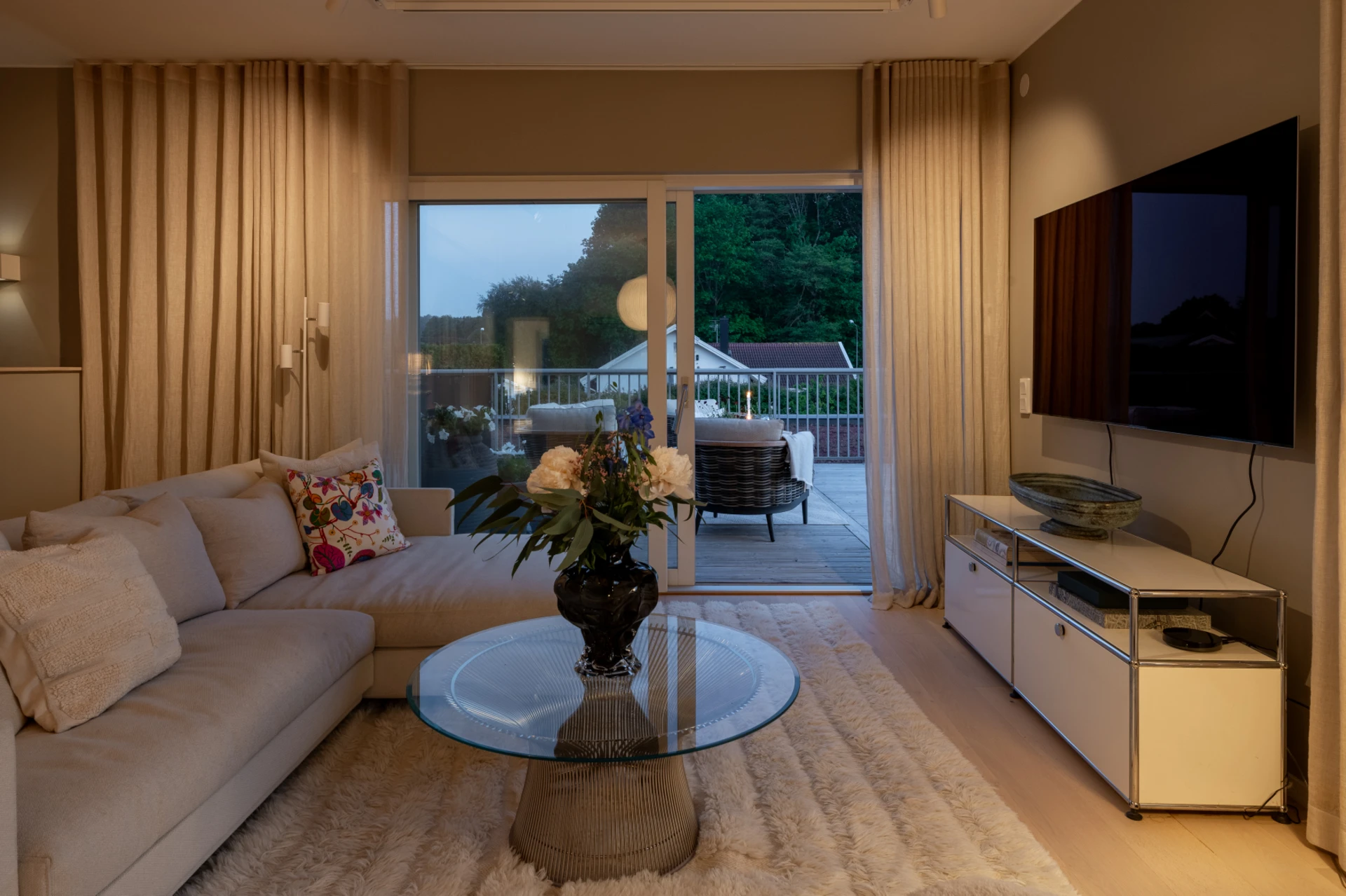 Öppet vardagsrum som smälter samman med köket i en öppen och social planlösning som omges av ett flertal eleganta glaspartier. Här finns det plats för en större sovgrupp och ett matsalsplats som förlängs ut till det härlig soldäcket där terrass finns möjligheten att påbörja eller avsluta middagen eller njuta av den vackra solnedgången.