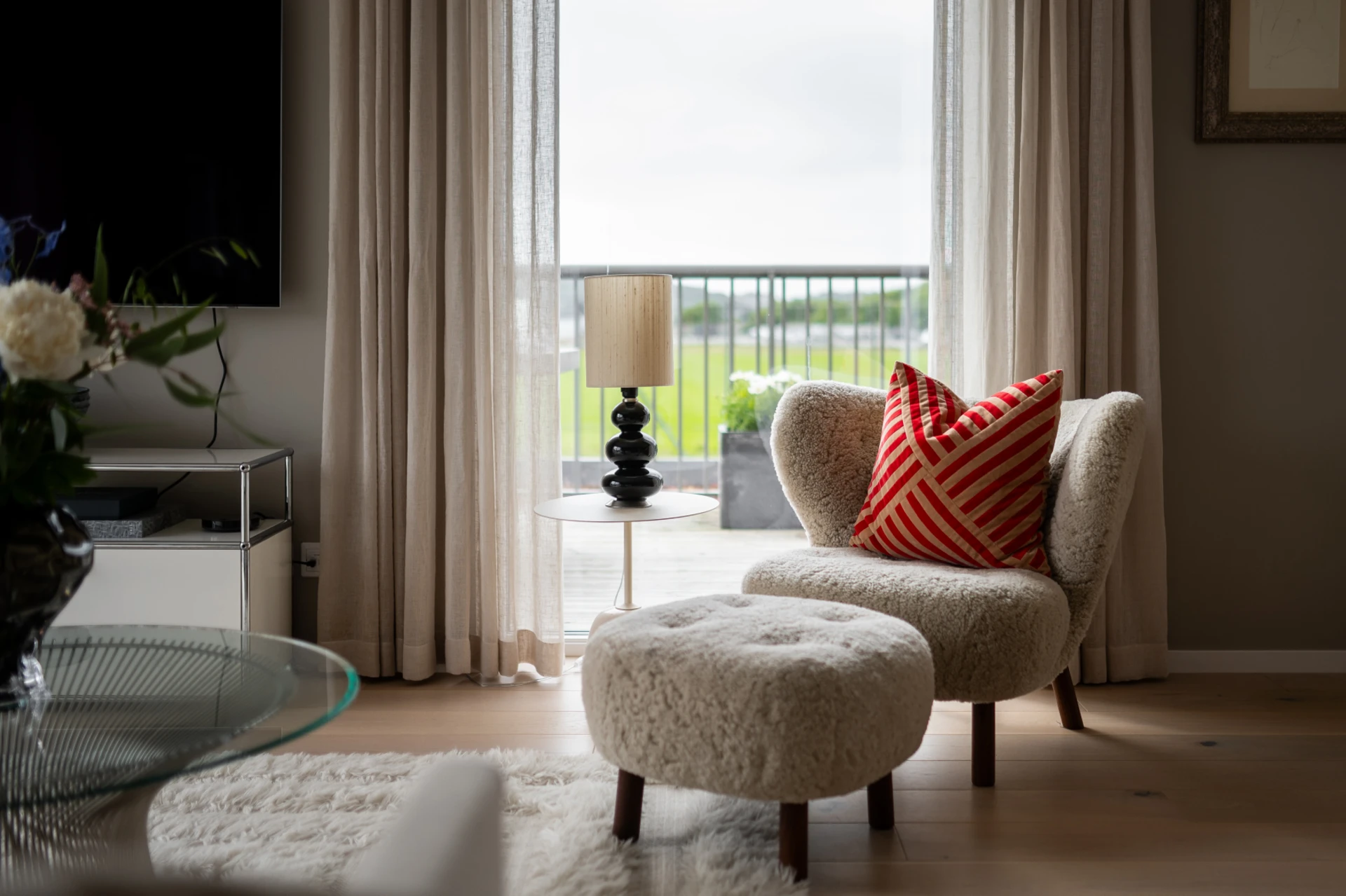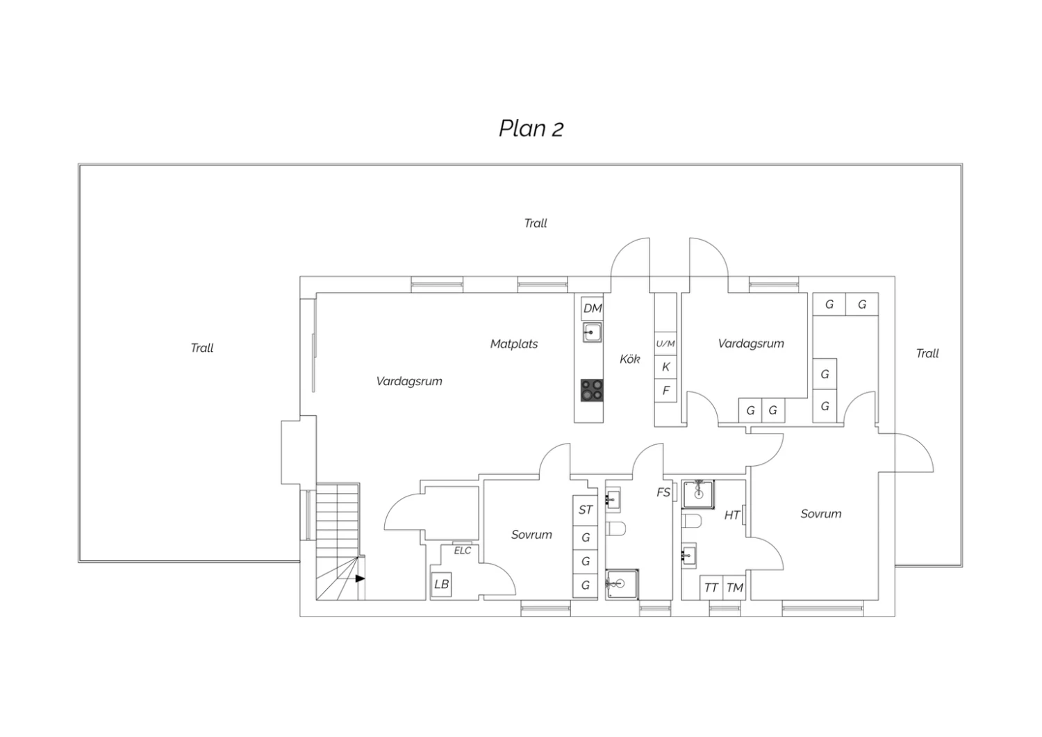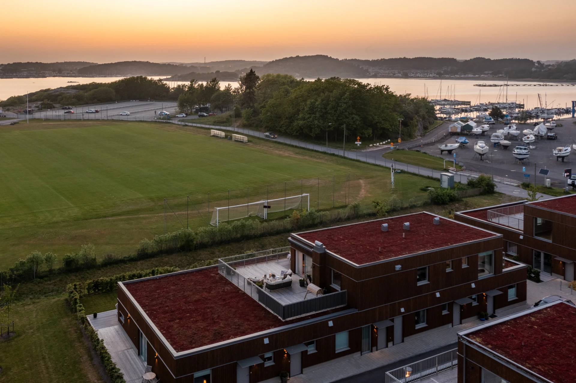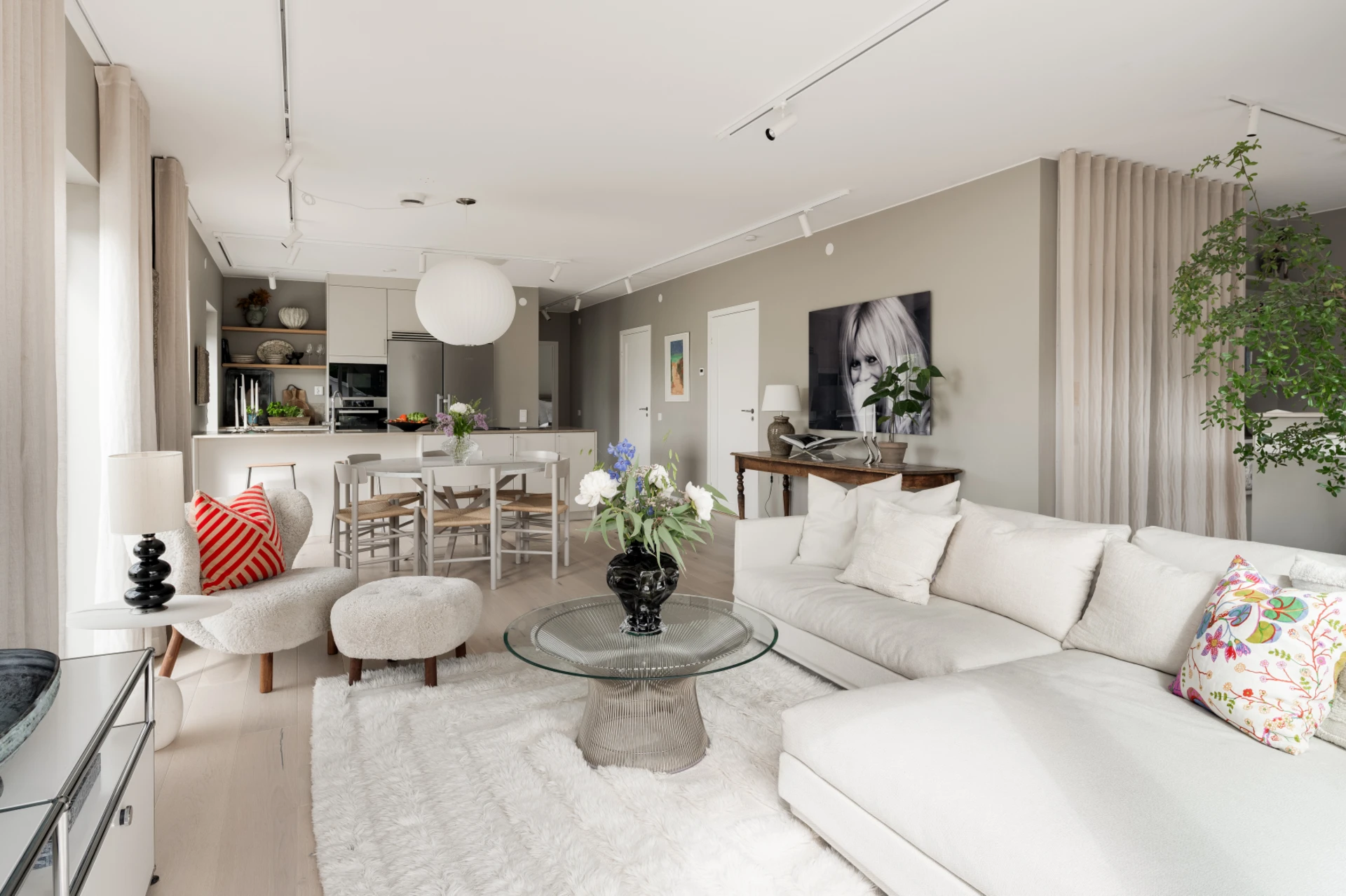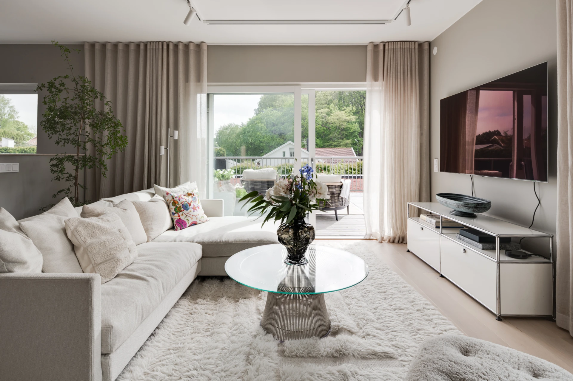 Öppet vardagsrum som smälter samman med köket i en öppen och social planlösning som omges av ett flertal eleganta glaspartier. Här finns det plats för en större sovgrupp och ett matsalsplats som förlängs ut till det härlig soldäcket där terrass finns möjligheten att påbörja eller avsluta middagen eller njuta av den vackra solnedgången.