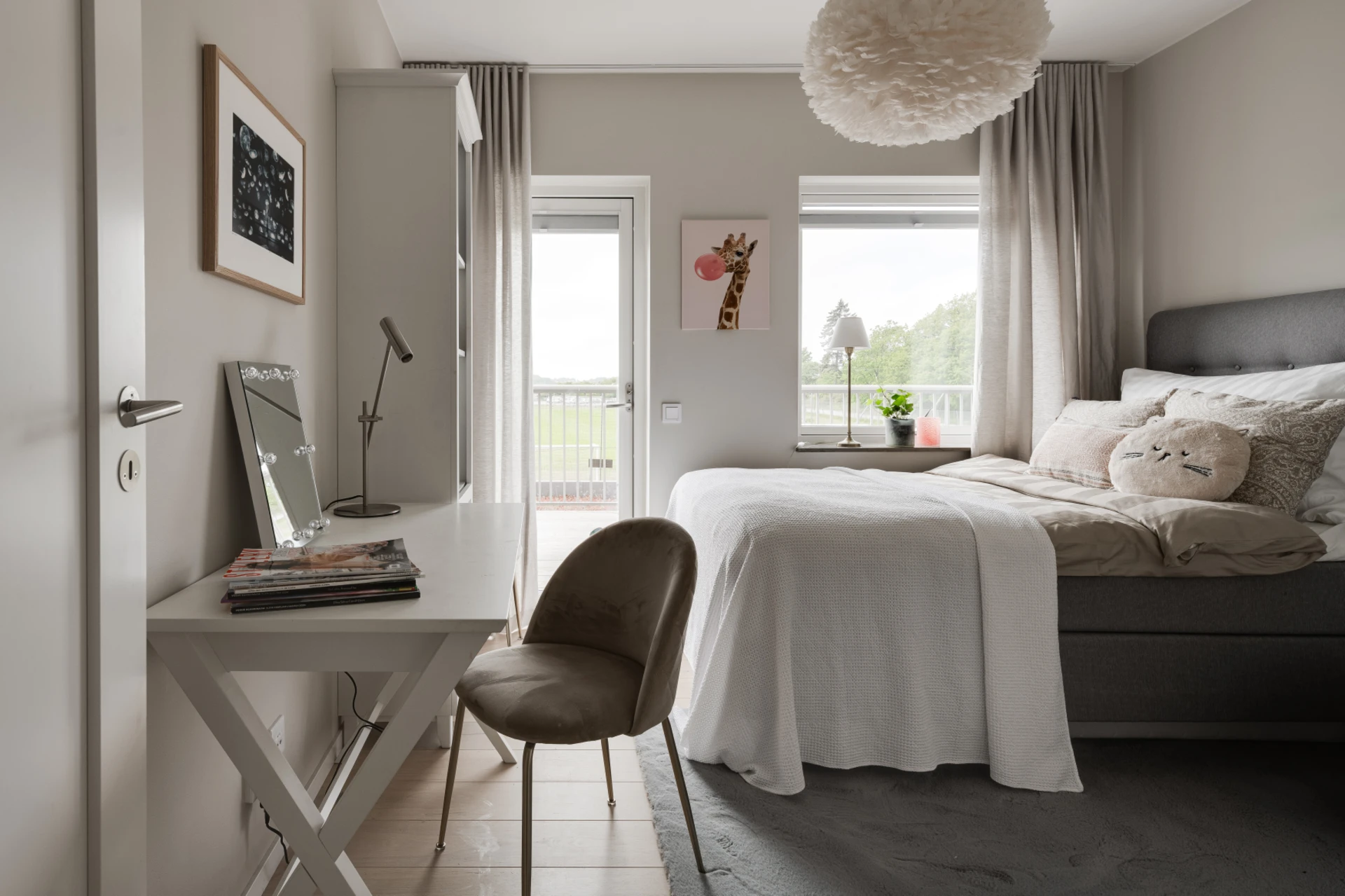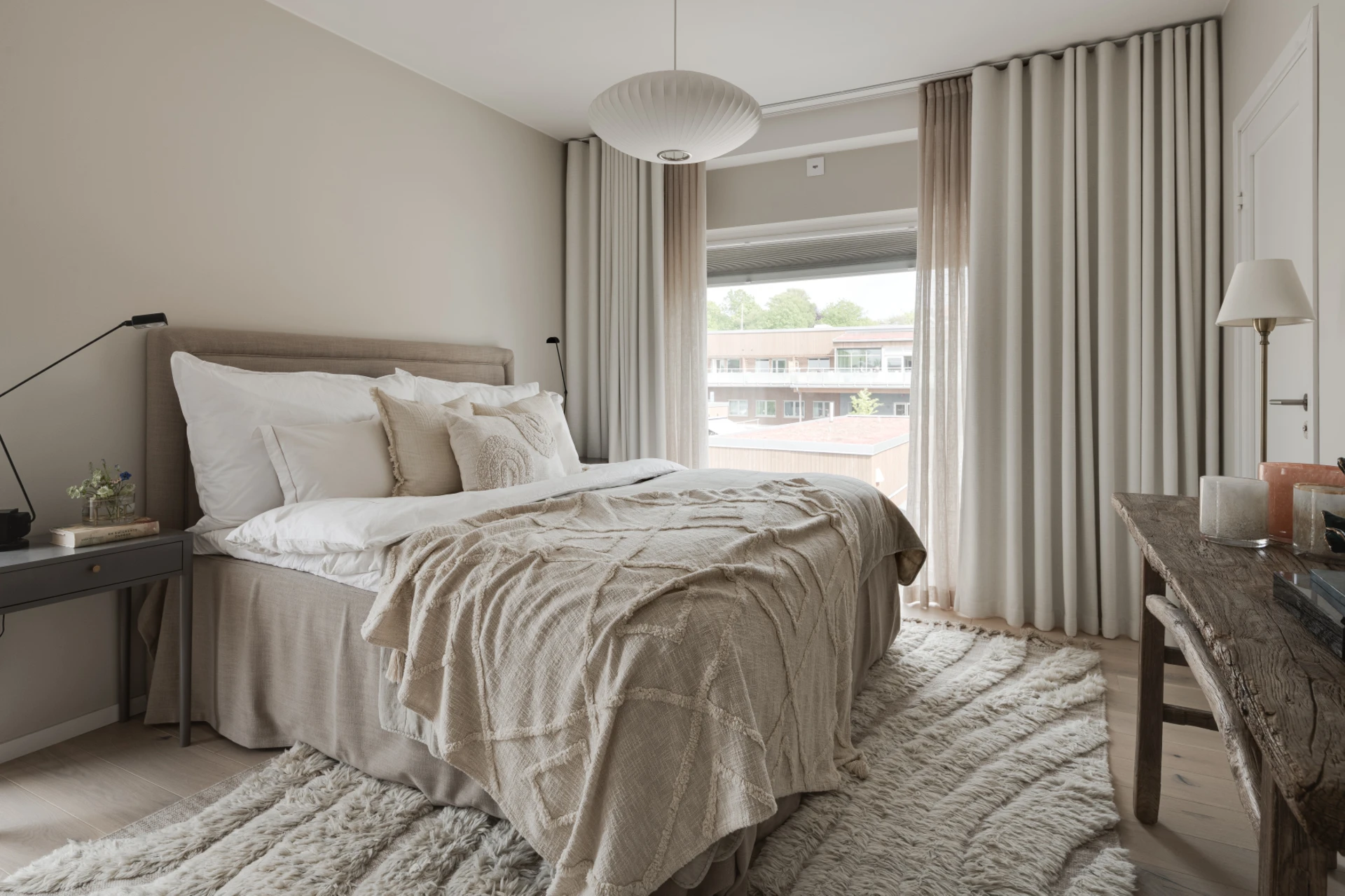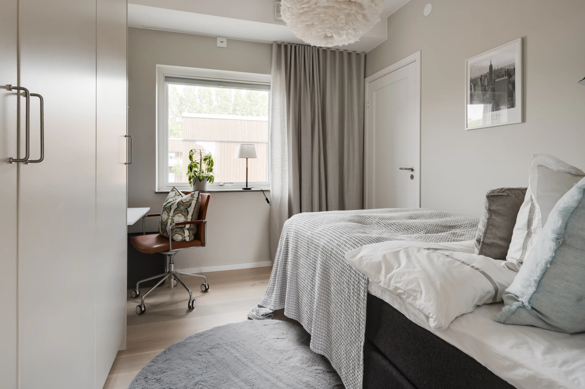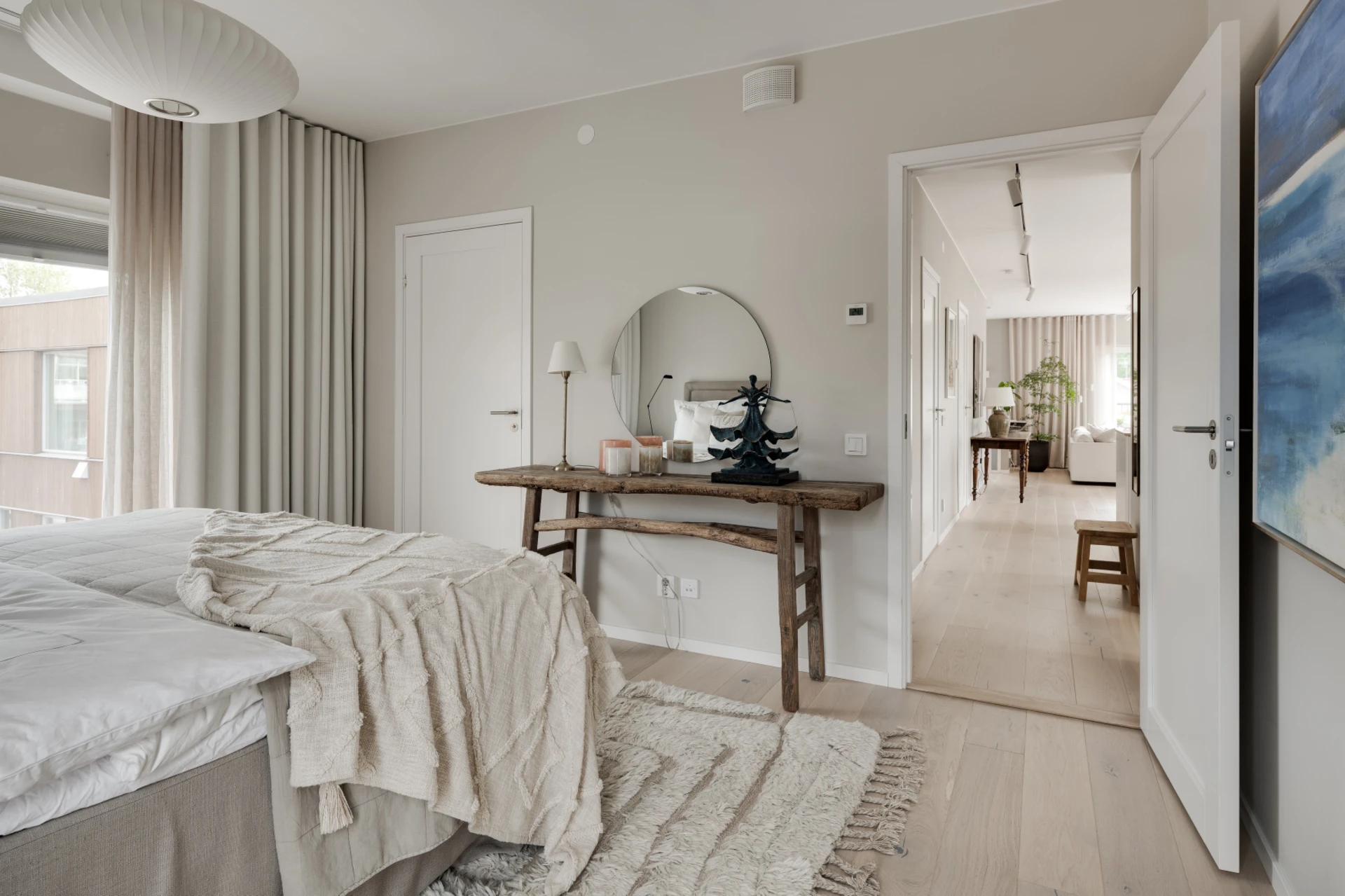 Ett stort Master bedroom med stora fönsterpartier som skänker ett härligt ljus till rummet och plisségardiner. En glasad dörr till soldäckets norrsida. Golvvärme och en walk in closet. Direkt access till privat stort badrum/tvättstuga.