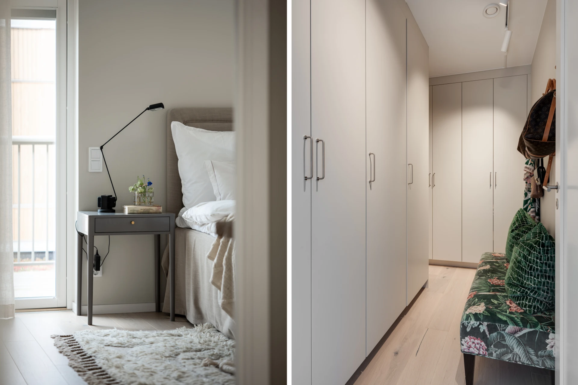 Sovrum med mörkläggande plisségardiner, golvvärme och en rad garderober och ett teknikutrymme inrett med Elfa förvaring.