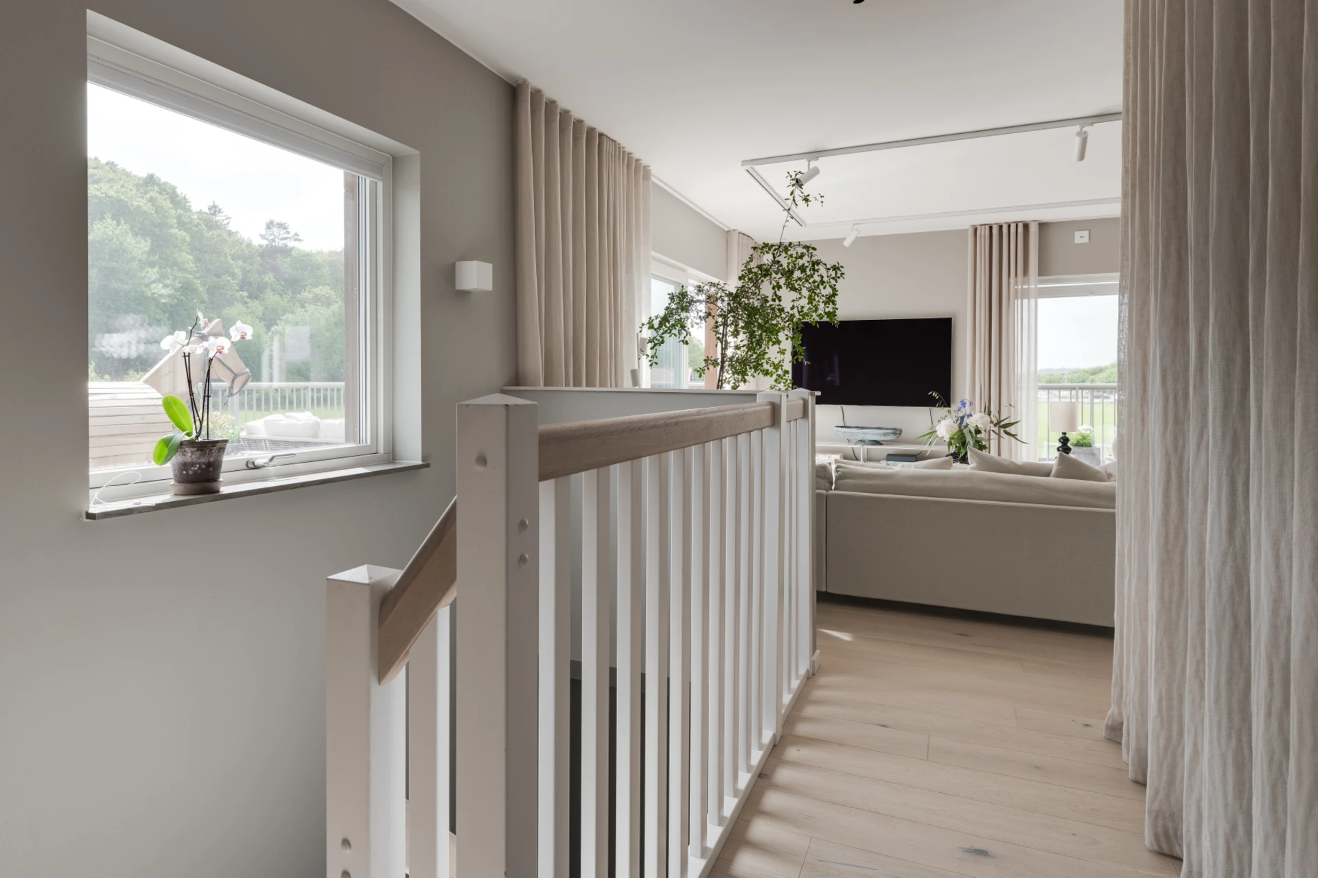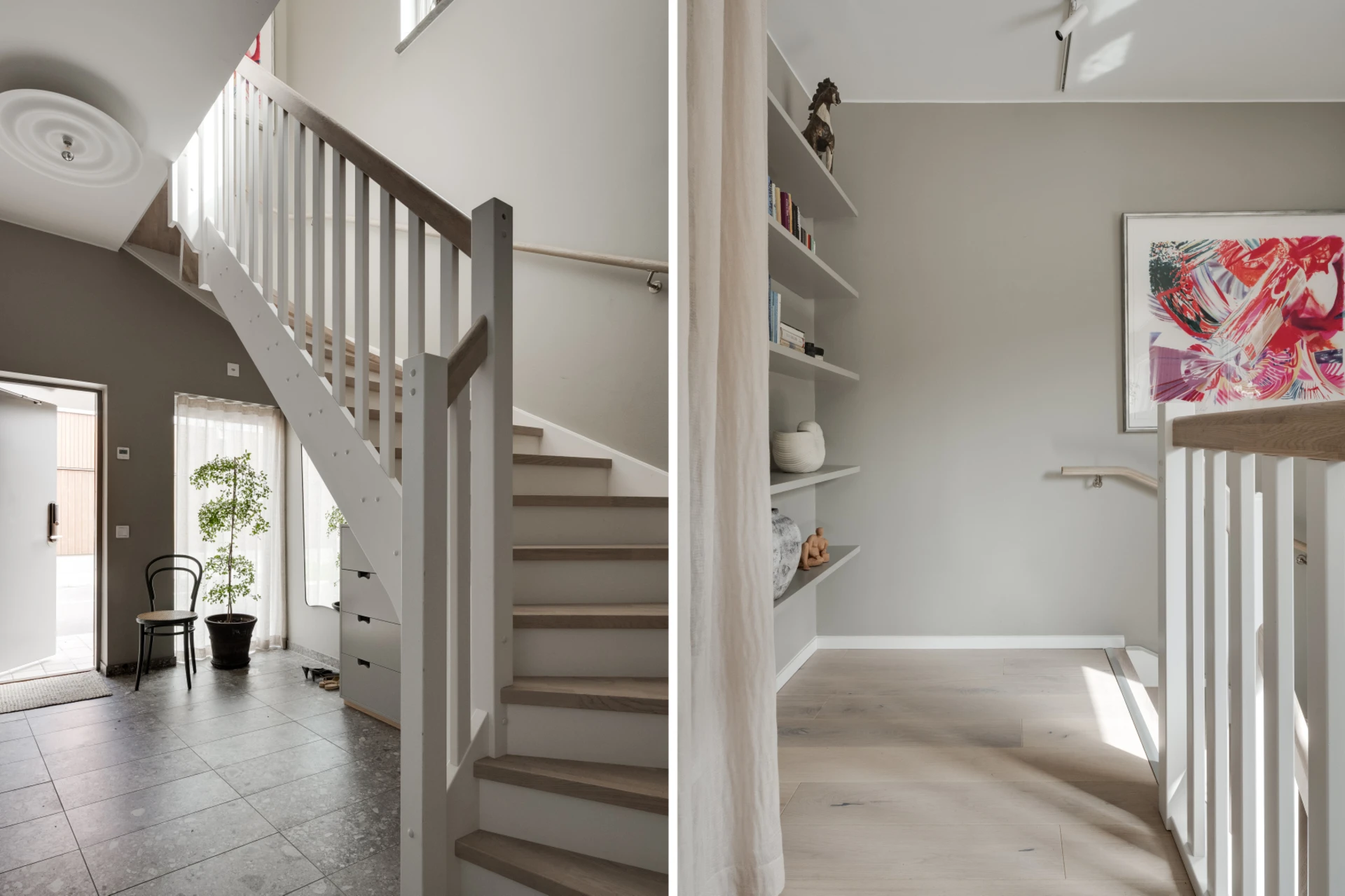 Den rymliga entréhallen imponerar med sin generösa takhöjd och ett vackert klinkergolv med vattenburen golvvärme. Väggarna är strukna med en fin ljus, grå nyans. I hallen finns en rymlig garderob för ytterkläder med förvaringssystem från Elfa. En vacker vitlackad trappa leder dig upp till andra våningen och vardagsrummet, precis som hissen.