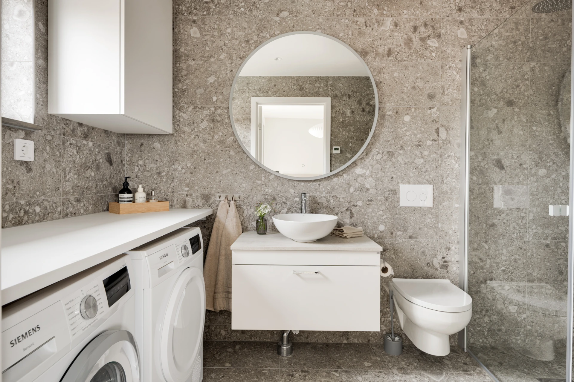 Stort badrum med fönster, wc, dusch, handfat och utrustad med tvättmaskin och torktumlare.