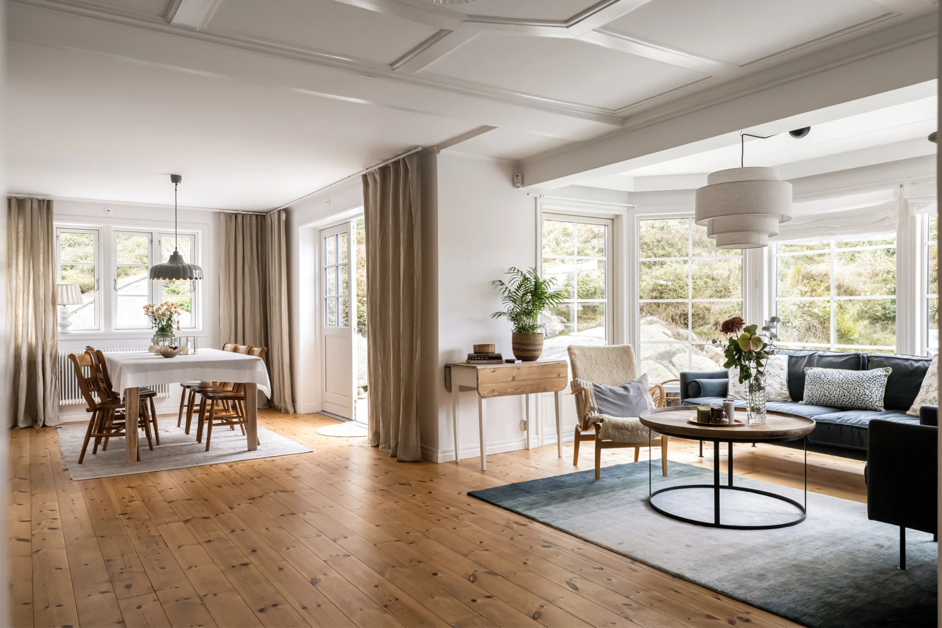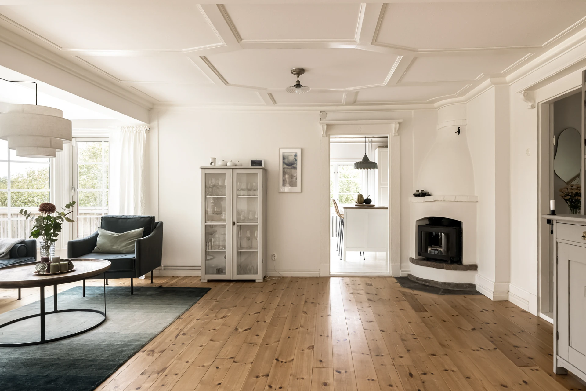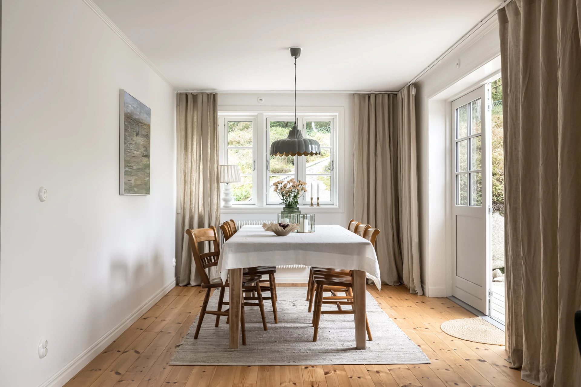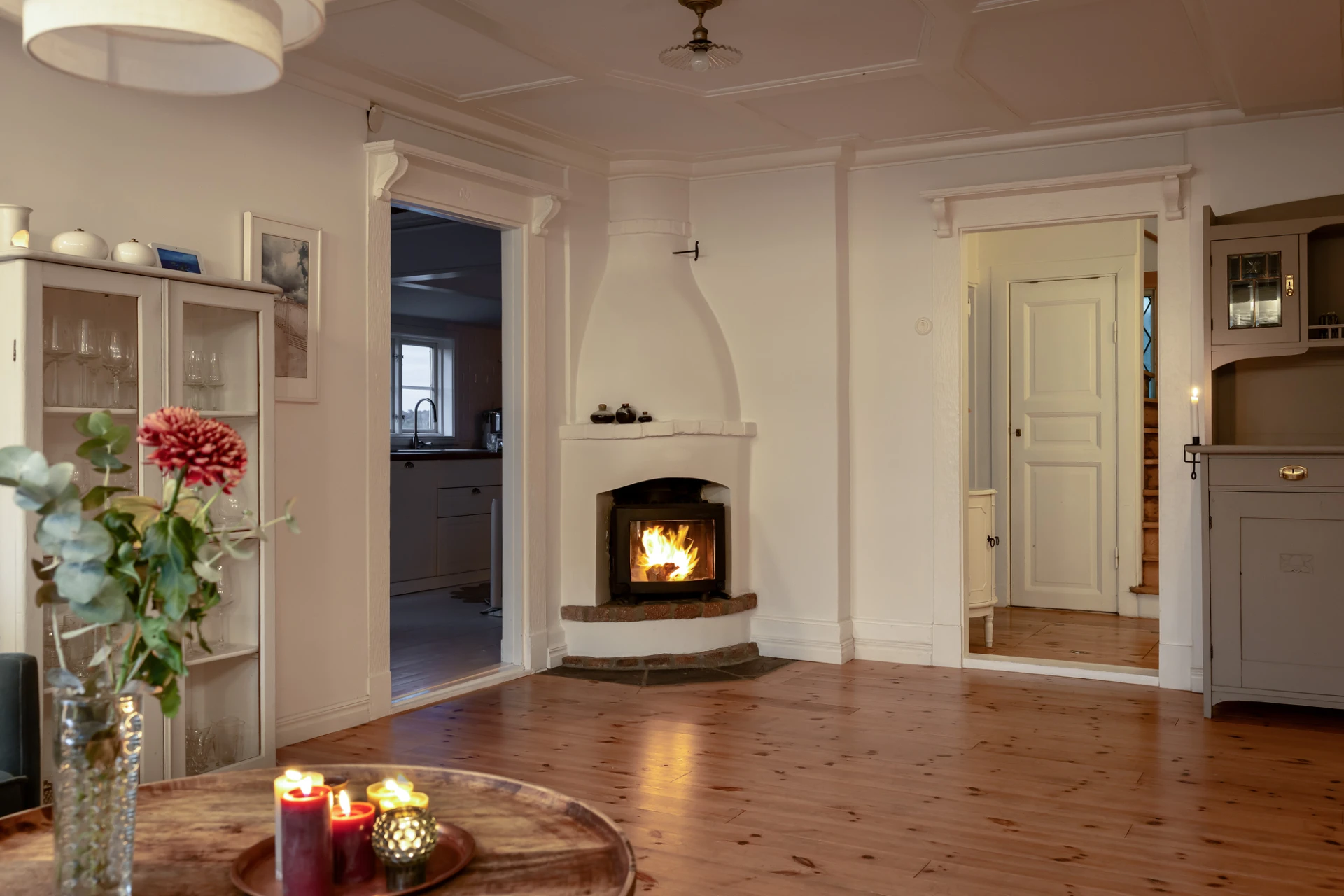 Furugolv och ljust målade väggar skapar en inbjudande atmosfär. Rummet erbjuder plats för både en generös soffgrupp och en matsalsdel för 8-10 personer. Genom dubbeldörrar nås den härliga uteplatsen. Här finns även en värmande braskamin i den öppna spisen.