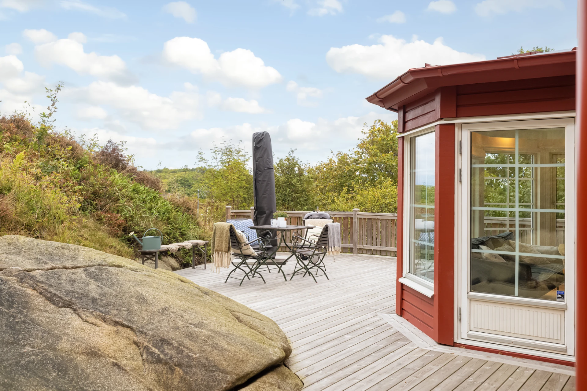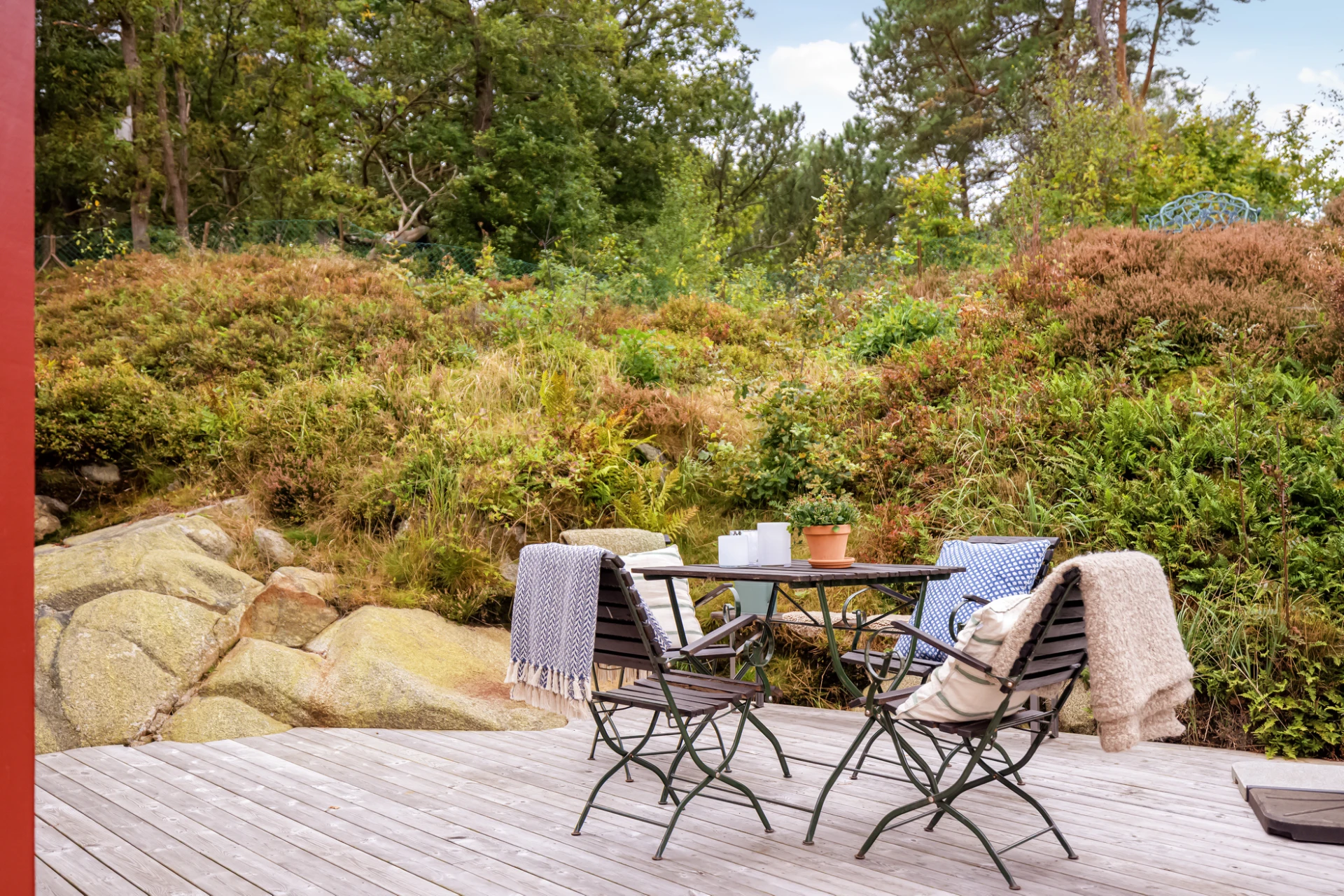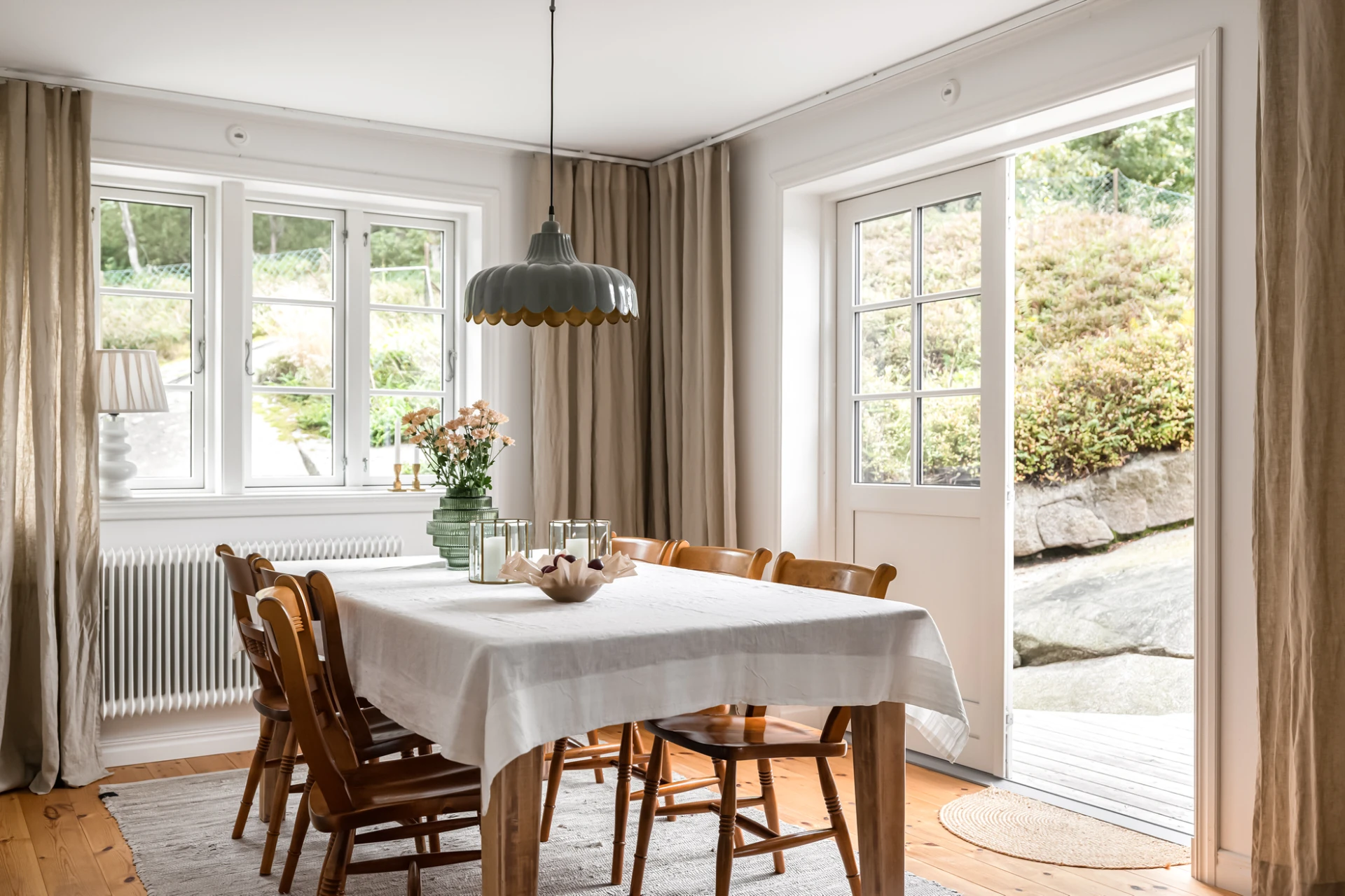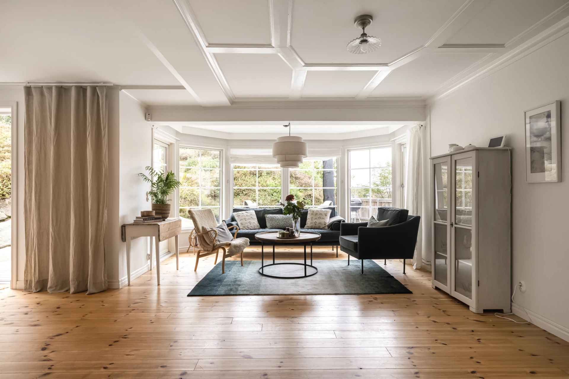Furugolv och ljust målade väggar skapar en inbjudande atmosfär. Rummet erbjuder plats för både en generös soffgrupp och en matsalsdel för 8-10 personer. Genom dubbeldörrar nås den härliga uteplatsen. Här finns även en värmande braskamin i den öppna spisen.