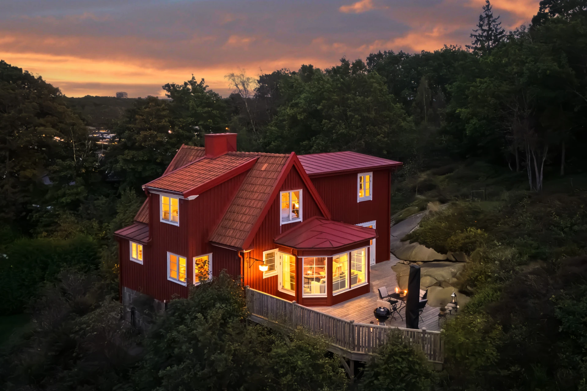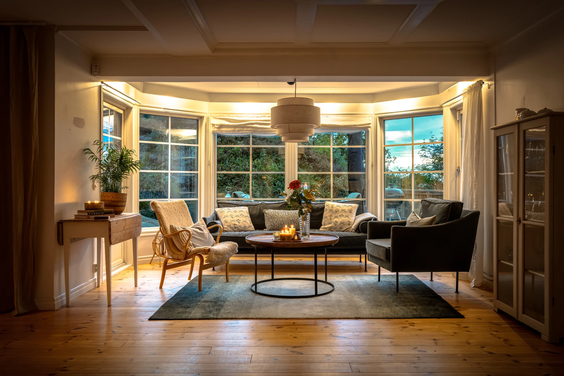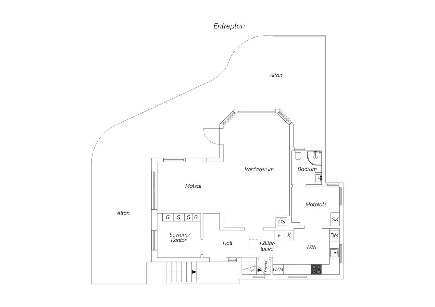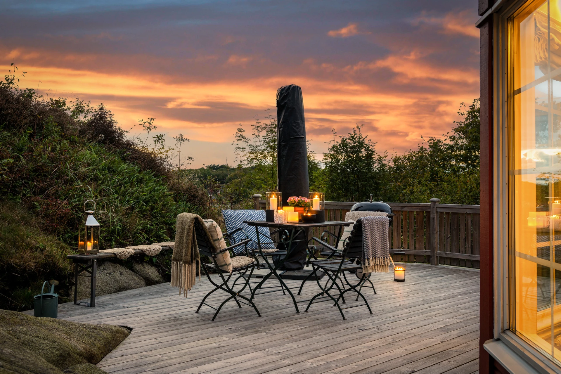 Furugolv och ljust målade väggar skapar en inbjudande atmosfär. Rummet erbjuder plats för både en generös soffgrupp och en matsalsdel för 8-10 personer. Genom dubbeldörrar nås den härliga uteplatsen. Här finns även en värmande braskamin i den öppna spisen.