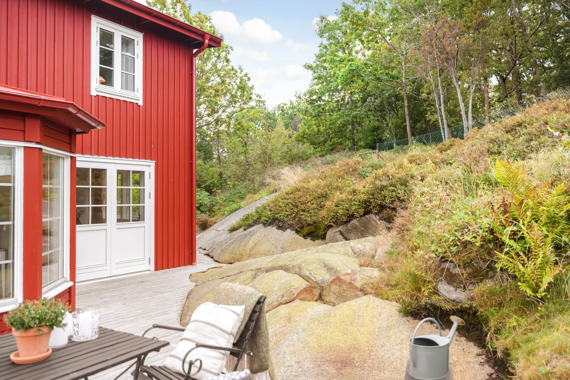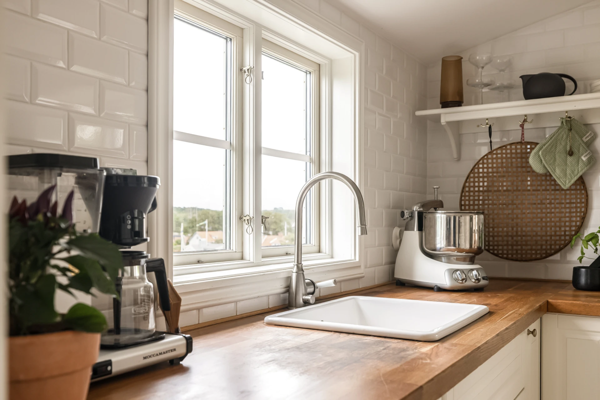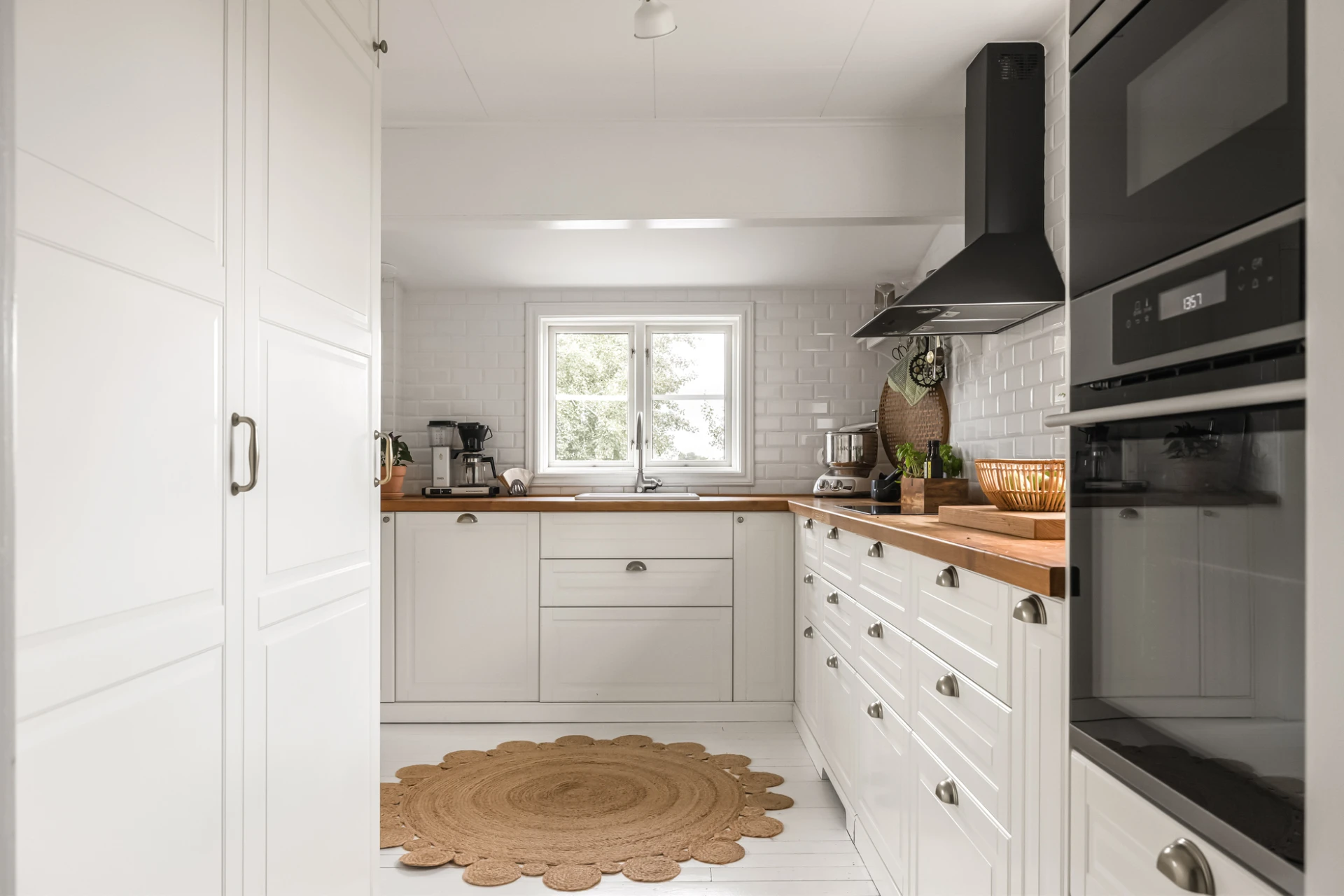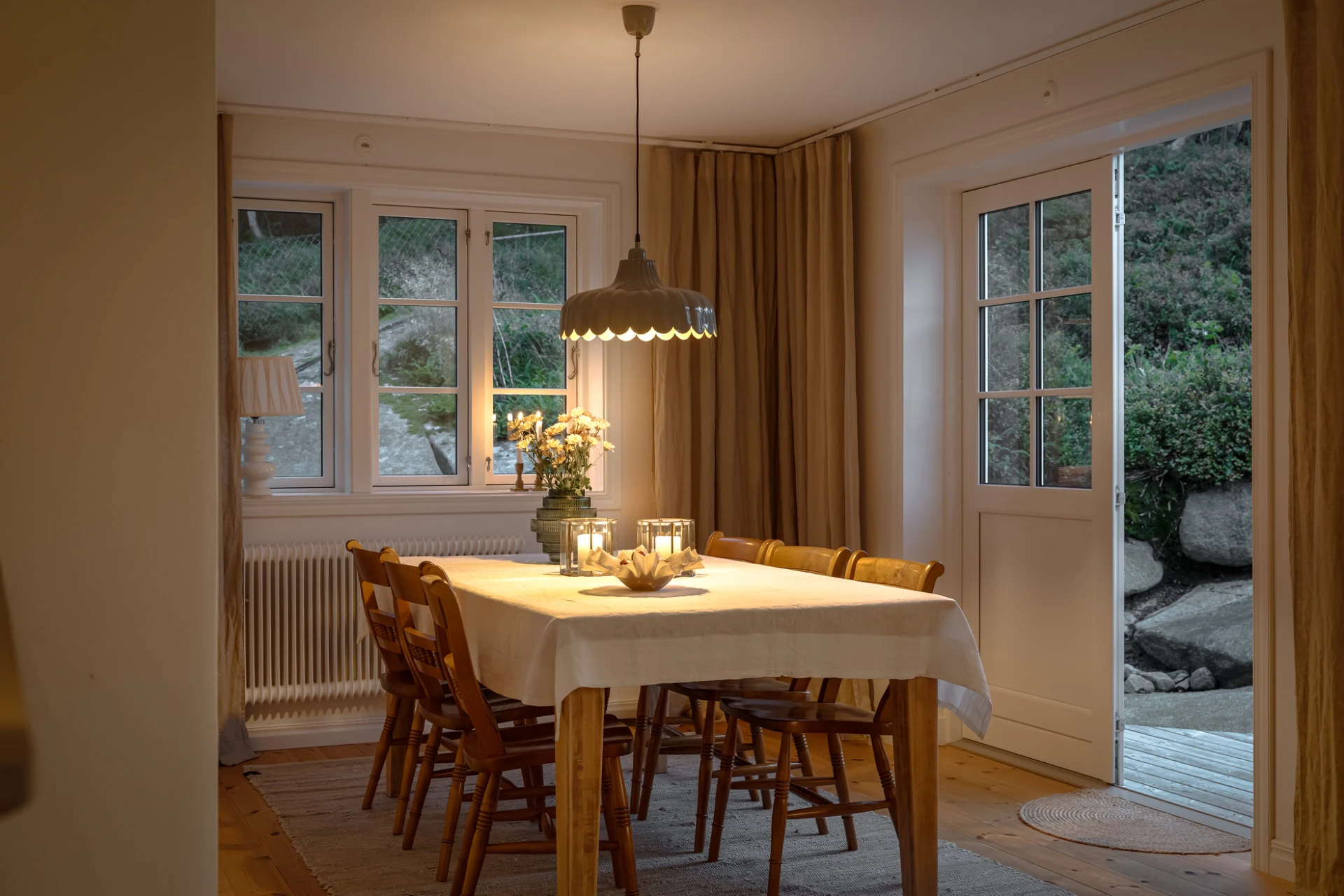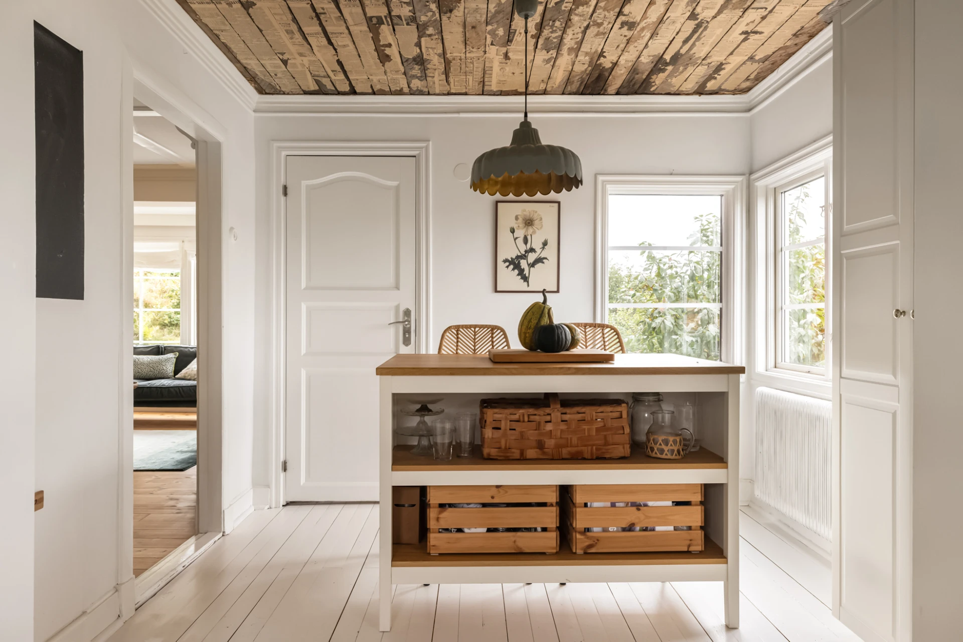 Vitmålat furugolv och ljust målade väggar ger ett luftigt intryck. Köket har vit köksinredning och ovanför arbetsbänken i ek sitter vitt kakel som stänkskydd. Utrustningen består av integrerad kyl, frys och diskmaskin samt induktionshäll, köksfläkt, varmluftsugn och mikro. Här finns även en matplats för cirka 4 personer.