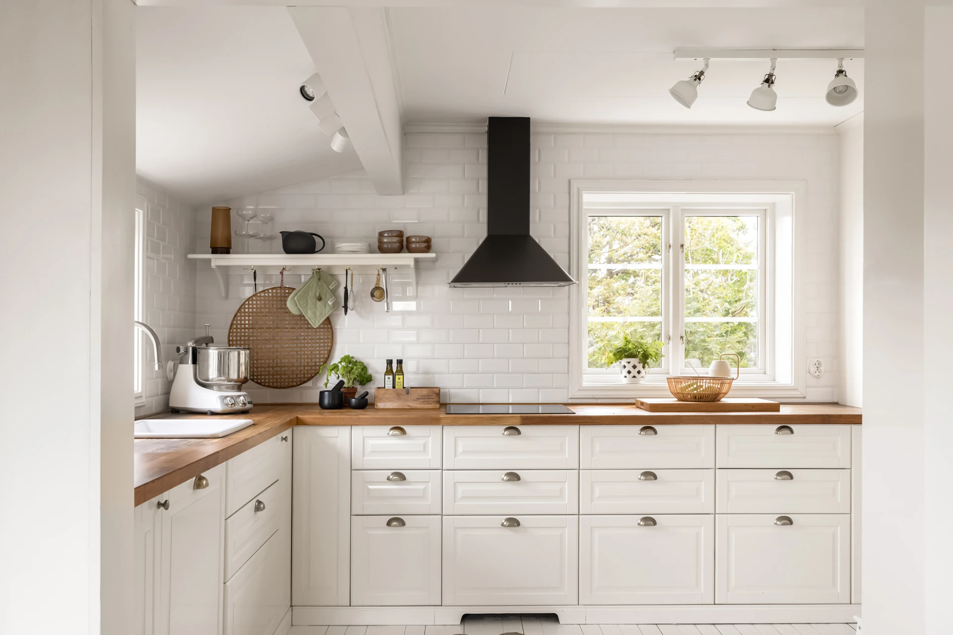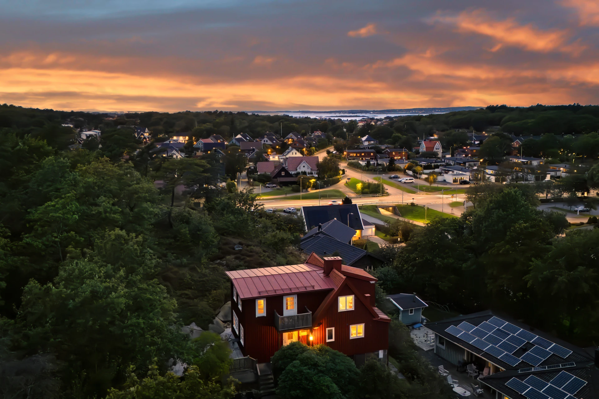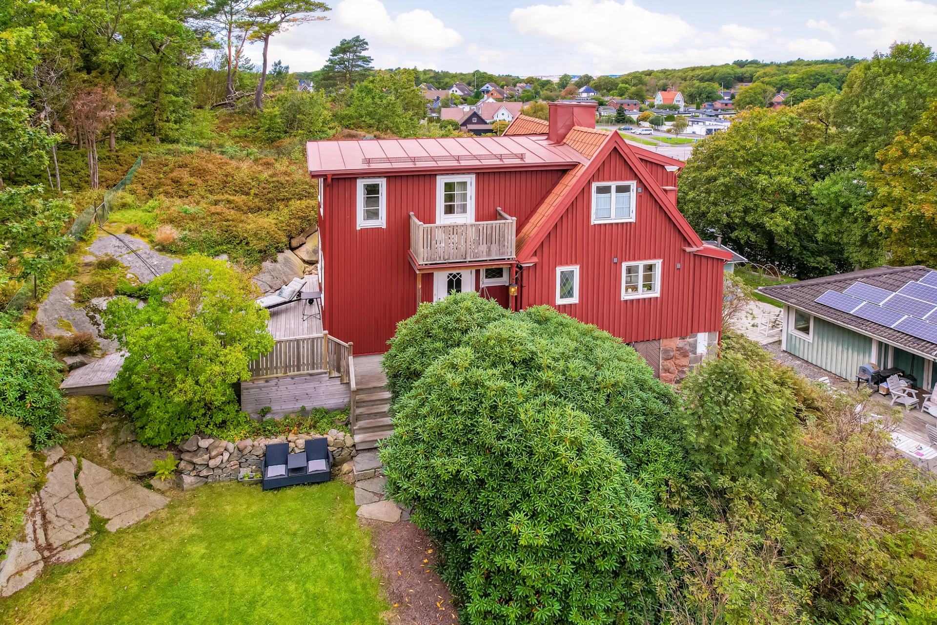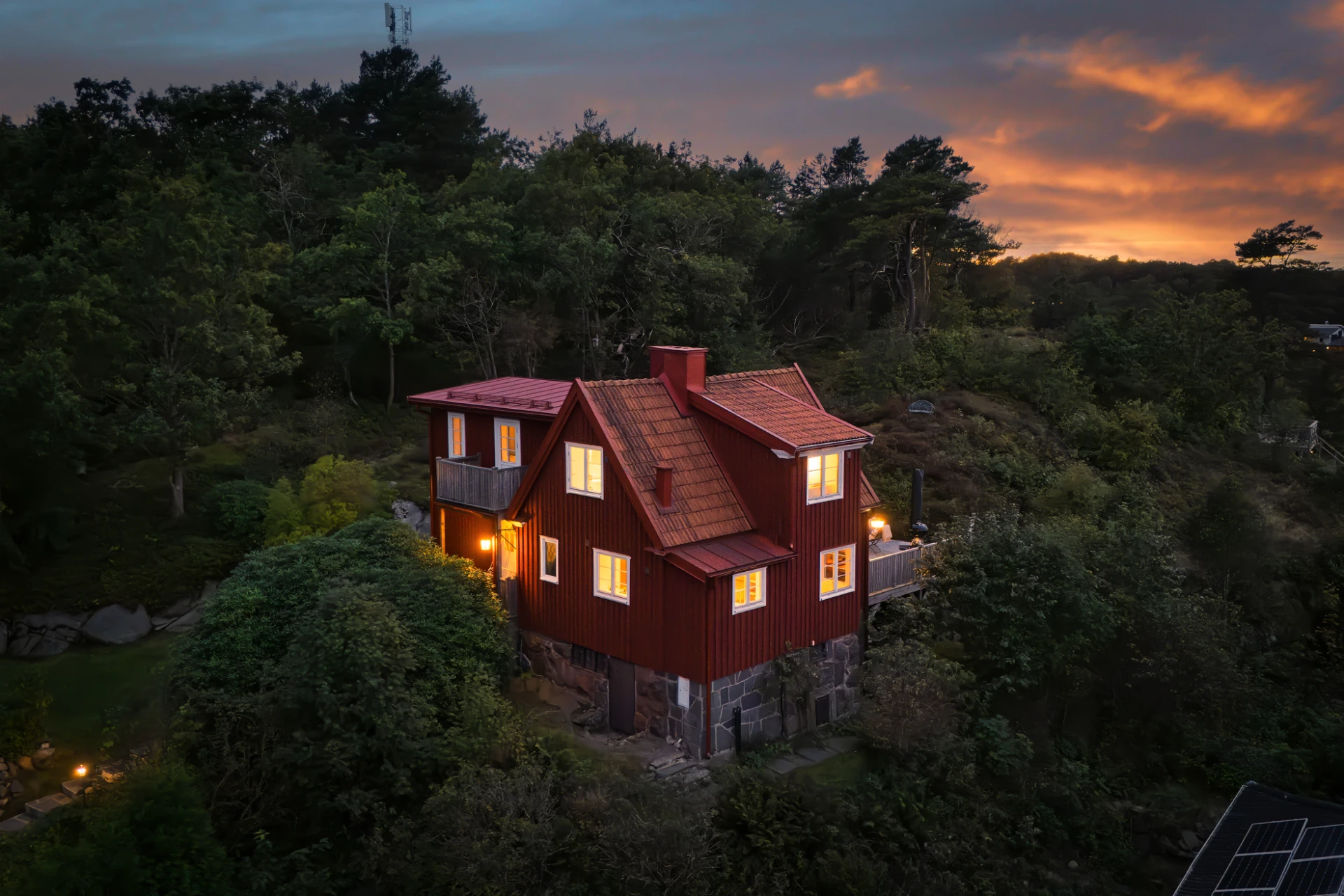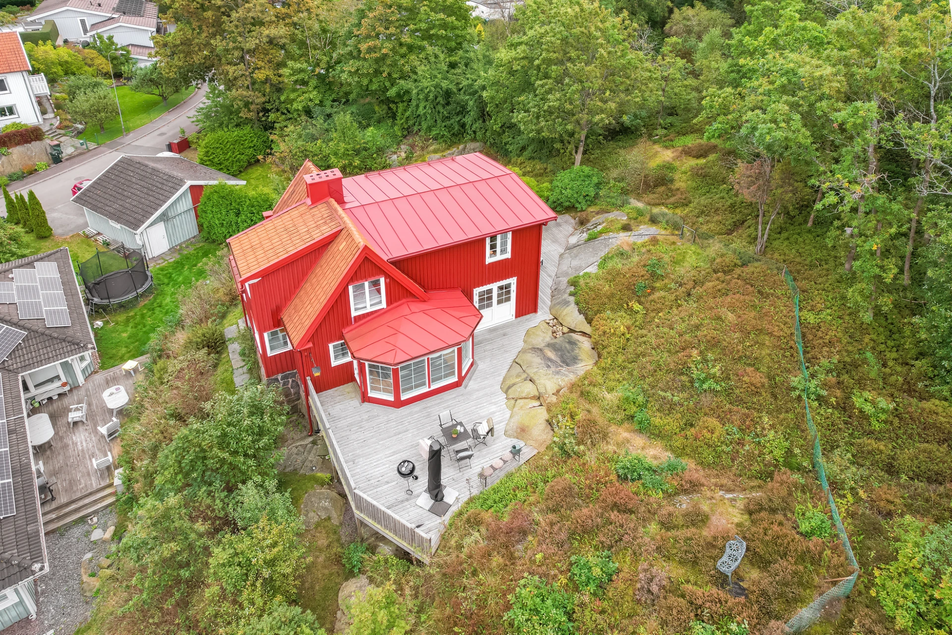 Vitmålat furugolv och ljust målade väggar ger ett luftigt intryck. Köket har vit köksinredning och ovanför arbetsbänken i ek sitter vitt kakel som stänkskydd. Utrustningen består av integrerad kyl, frys och diskmaskin samt induktionshäll, köksfläkt, varmluftsugn och mikro. Här finns även en matplats för cirka 4 personer.