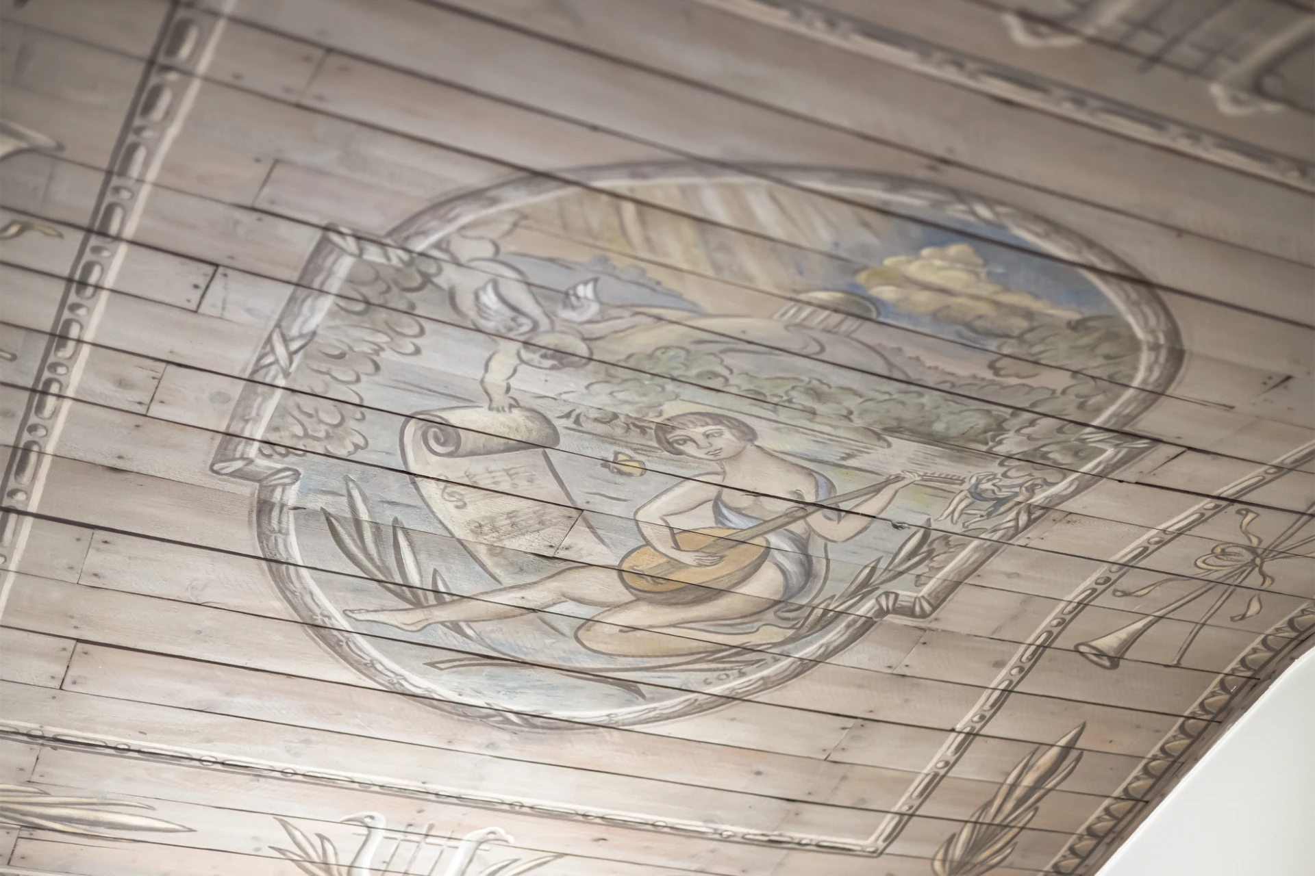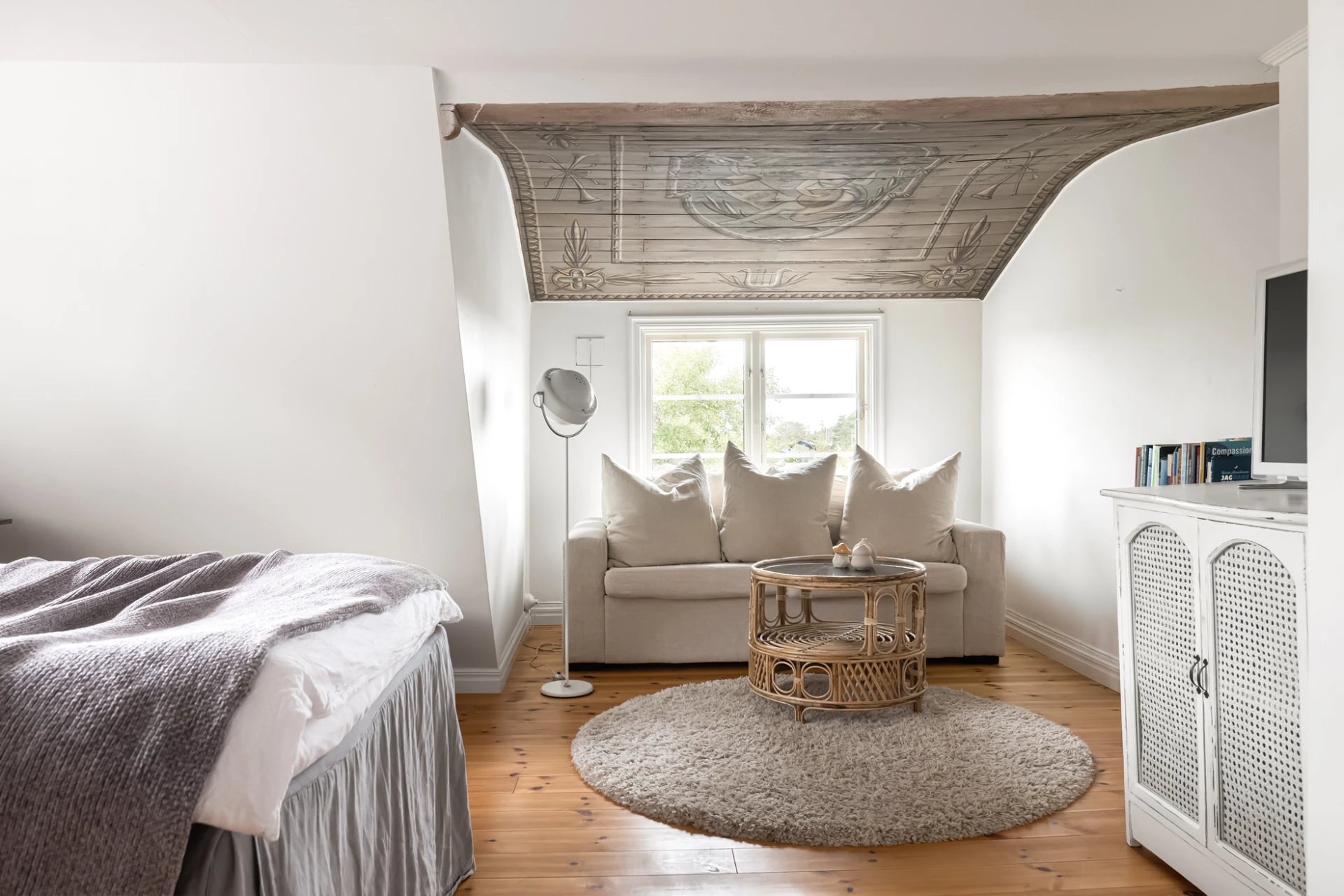 Furugolv och ljust målade väggar skapar ett ljust och rymligt sovrum. Här finns plats för dubbelsäng med tillhörande möblemang, samt en liten soffgrupp och arbetshörna för den som önskar. I ena delen av rummet pryder en vacker takmålning. Går att göra om till 2 sovrum vid behov.