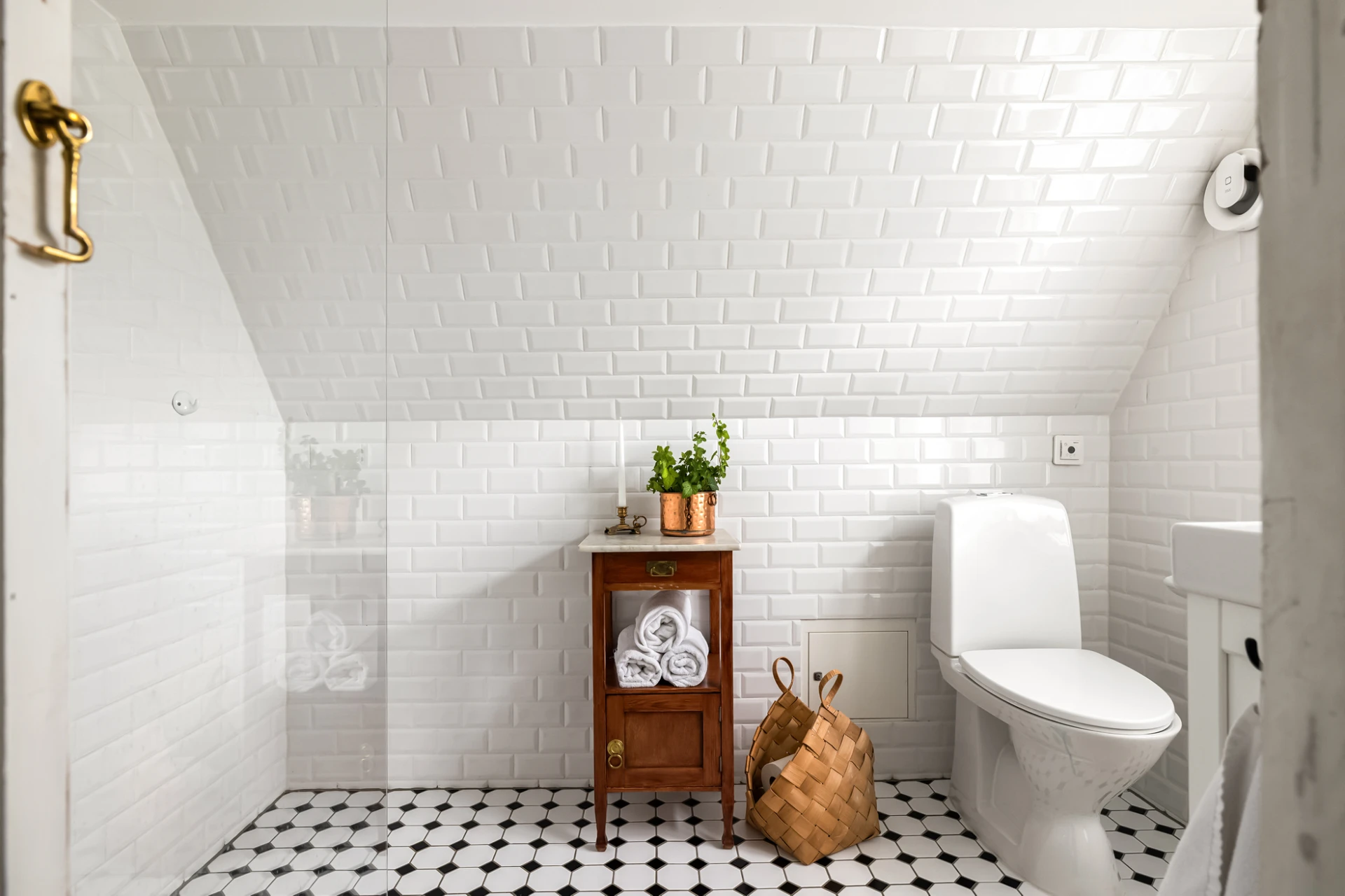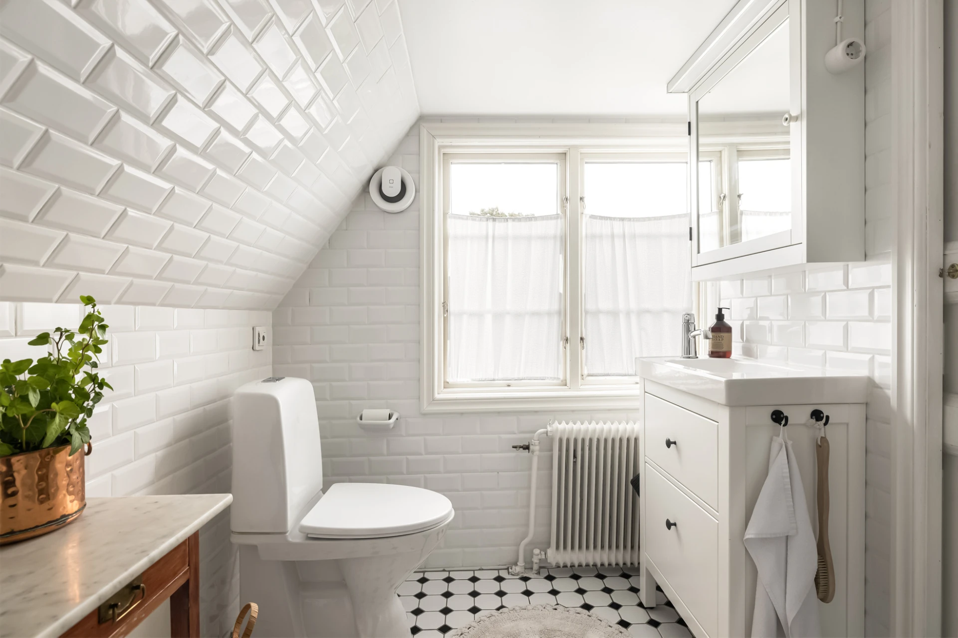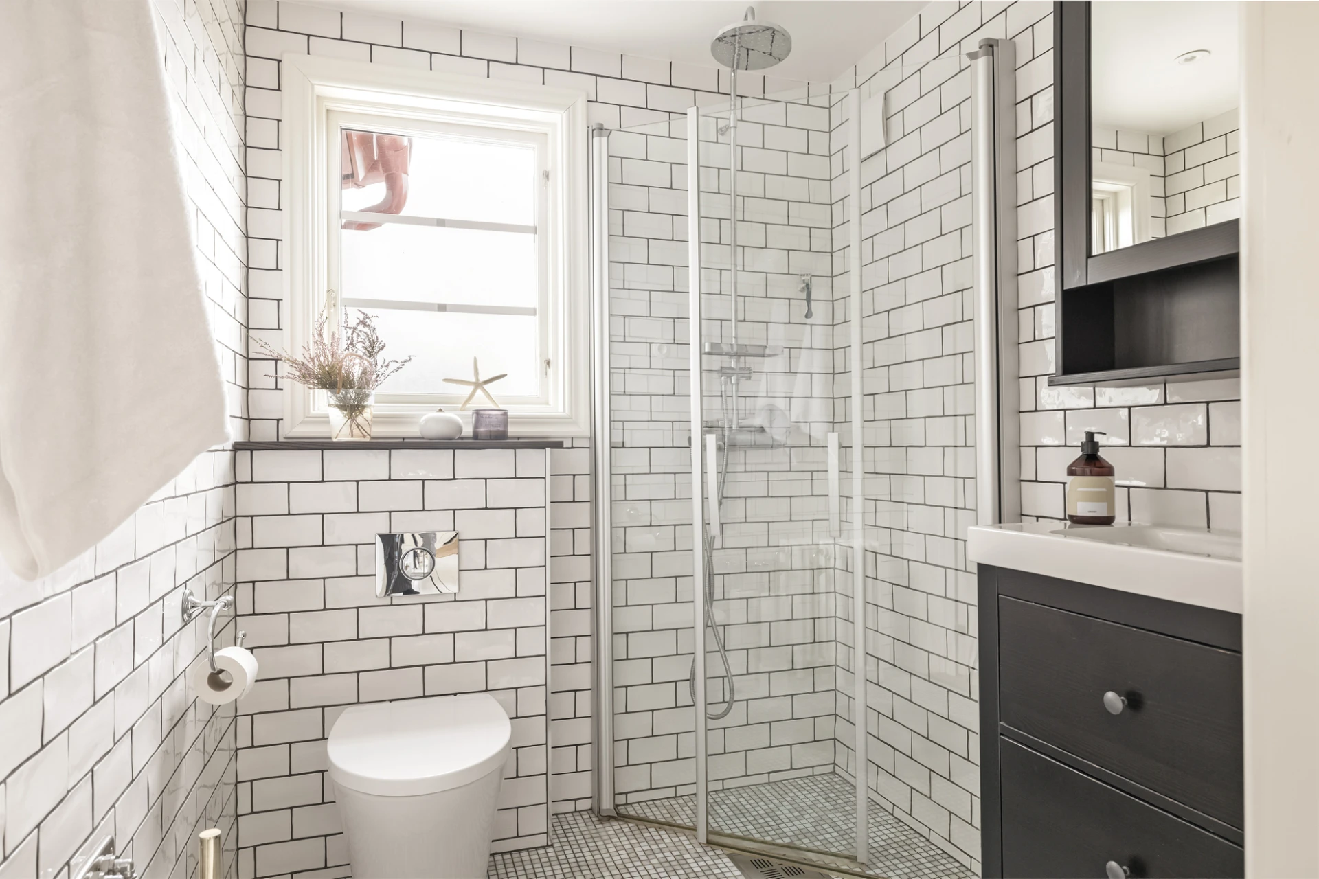 Klinkergolv i mosaik med golvvärme och vita helkaklade väggar skapar ett fräscht och lättskött badrum. Här finns vägghängd WC, handfat med kommod, spegelskåp samt dusch med vikbara glasdörrar. Belysning med spotlights ger ett behagligt ljus.